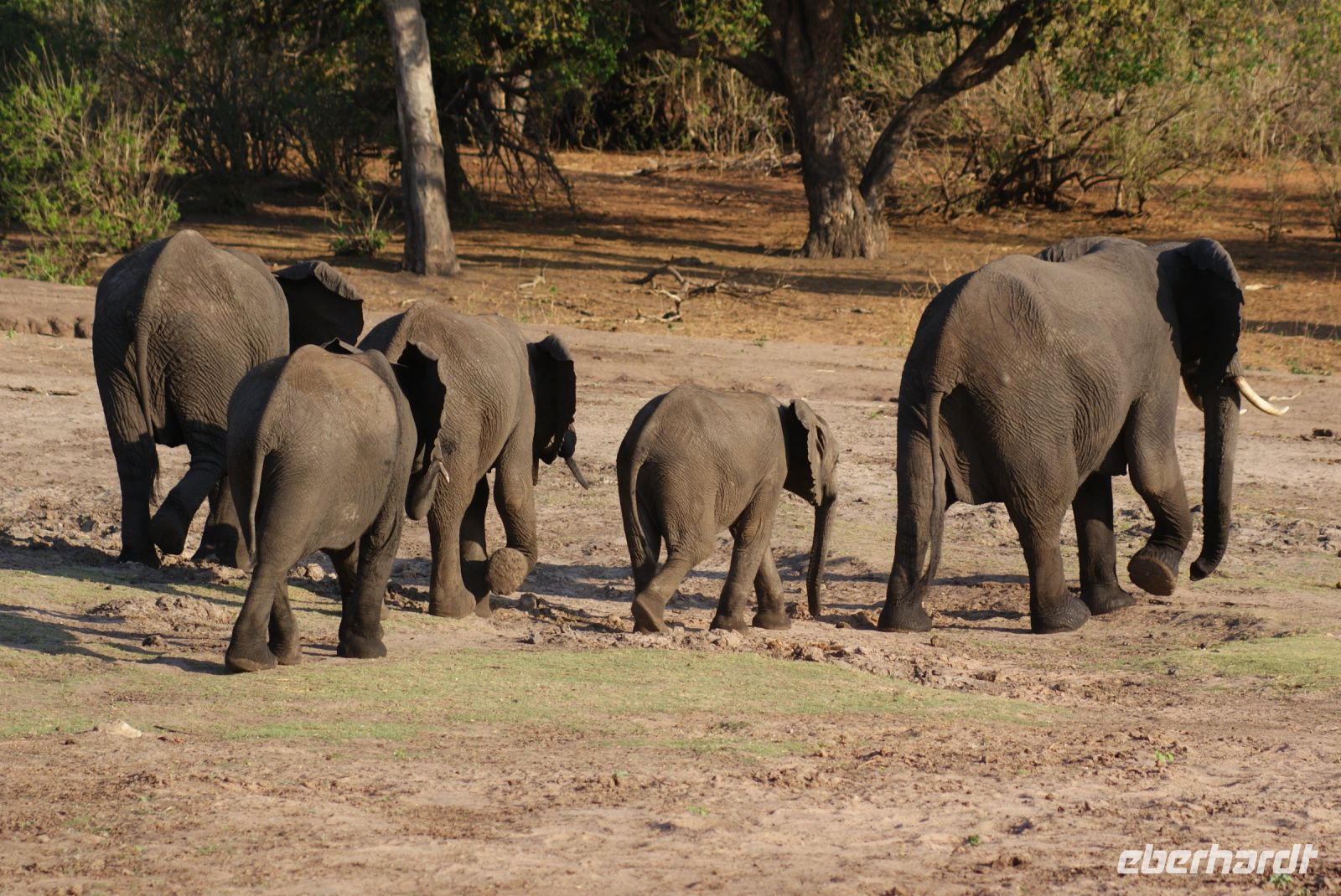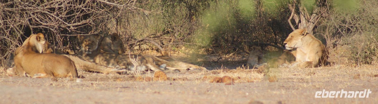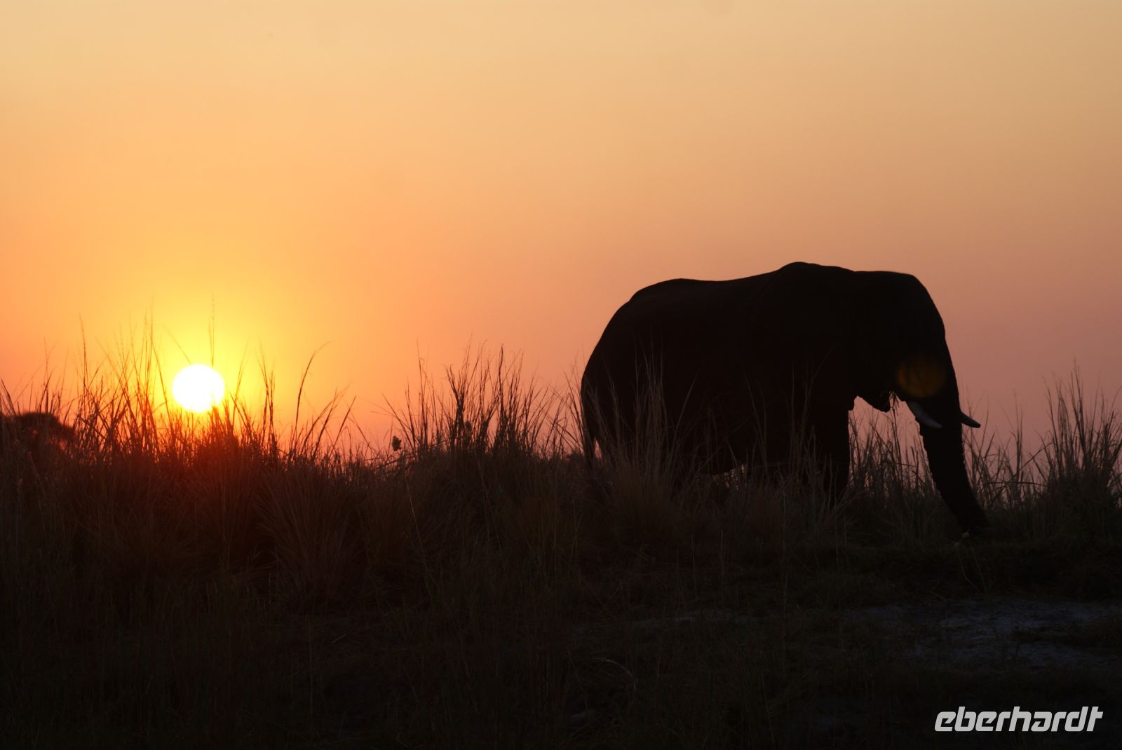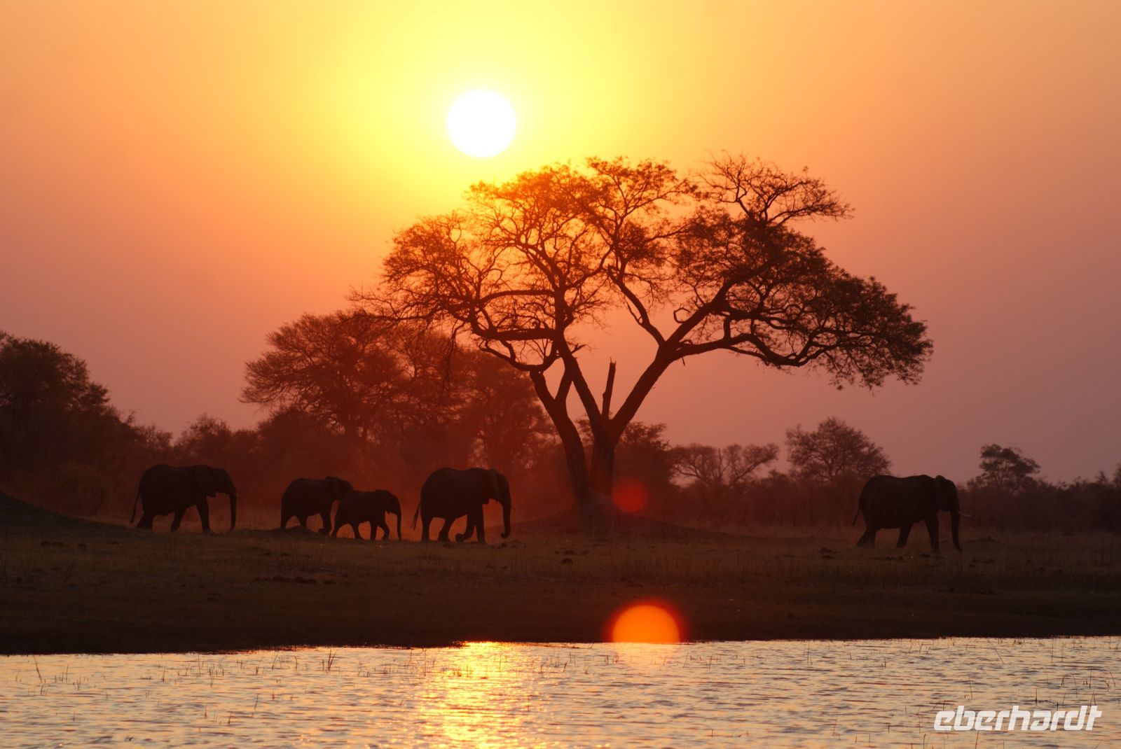 Frühmorgens um 05.45 Uhr treffen wir uns alle in der Lobby, um zu unserer heutigen Pirschfahrt aufzubrechen. Guide Emanuel begrüßt uns freundlich in „seinem Büro“ und wir fahren bei noch kühlen Temperaturen in den Chobe Nationalpark. Da wir schon reichlich Elefanten gesehen haben, bitten wir Emanuel um einen „Katzentag“, wie gerne würden wir nochmals Löwen oder gar einen Leoparden sehen. Wie schon gedacht, ist heute Morgen die Fläche und um den Chobe Fluss ohne Elefanten, da sich diese in der Nacht in den Buschbereich verziehen und erst am Vormittag zum Trinken erscheinen. So sehen wir nur ein paar Hippos, die friedlich grasen oder sich im Wasser aufhalten. Impalas, Kudus, Büffel lassen sich blicken und auch so manche Elefanten im Gebüsch. Unser Wunsch sollte wahr werden. Guide Emanuel erhält einen Tipp, dass Löwen gesichtet wurden und schon „fliegen“ wir per Jeep in genannte Richtung. Das Glück ist mit uns, wir sehen etliche Löwinnen und Nachwuchs im Gebüsch dösend, was für ein Erlebnis. Dieses haben wir dann nicht für uns alleine, denn im Nu sind wir umgeben von gefühlt allen Jeeps im Park. Verständlich-jeder will die Katzen sehen! Danach erfolgt ein Morgenkaffee mitten im Busch. Wir bitten unseren Guide nochmals zu den Löwen zu fahren und dürfen diese im Anschluss erneut aus anderer Perspektive genießen. Einfach ein toller Morgen! Glücklich kehren wir zur Lodge zurück und frühstücken erst mal ausgiebig. Die Mittagszeit genießt jeder nach seinem Geschmack und spaziert vielleicht ein bisschen durch Kasane, bevor wir uns nachmittags zur Safari per Boot einfinden. Wir erleben wunderbare Stunden an Bord und sehen die Tiere nun vom Wasser aus. Ein tolles Erlebnis, Elefanten, Wasserböcke, Krokodile, Flusspferde, Störche, Büffel zu sehen, wie diese friedlich grasen und sich durch uns nicht stören lassen. Die Elefantenherden, die wie eine Perlenkette aneinander gereiht durch den Fluss zurück zum Ufer schwimmen, lassen uns sprachlos zurück-welch ein toller Augenblick. Der anschließende Sonnenuntergang ist die Krönung und als dann noch Elefanten vor der Sonne vorbeiziehen, entstehen unglaublich schöne Aufnahmen, die wir alle lang in Erinnerung behalten werden.
