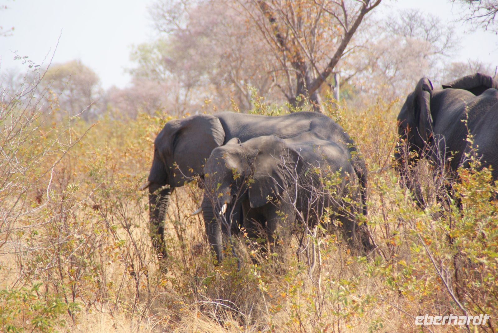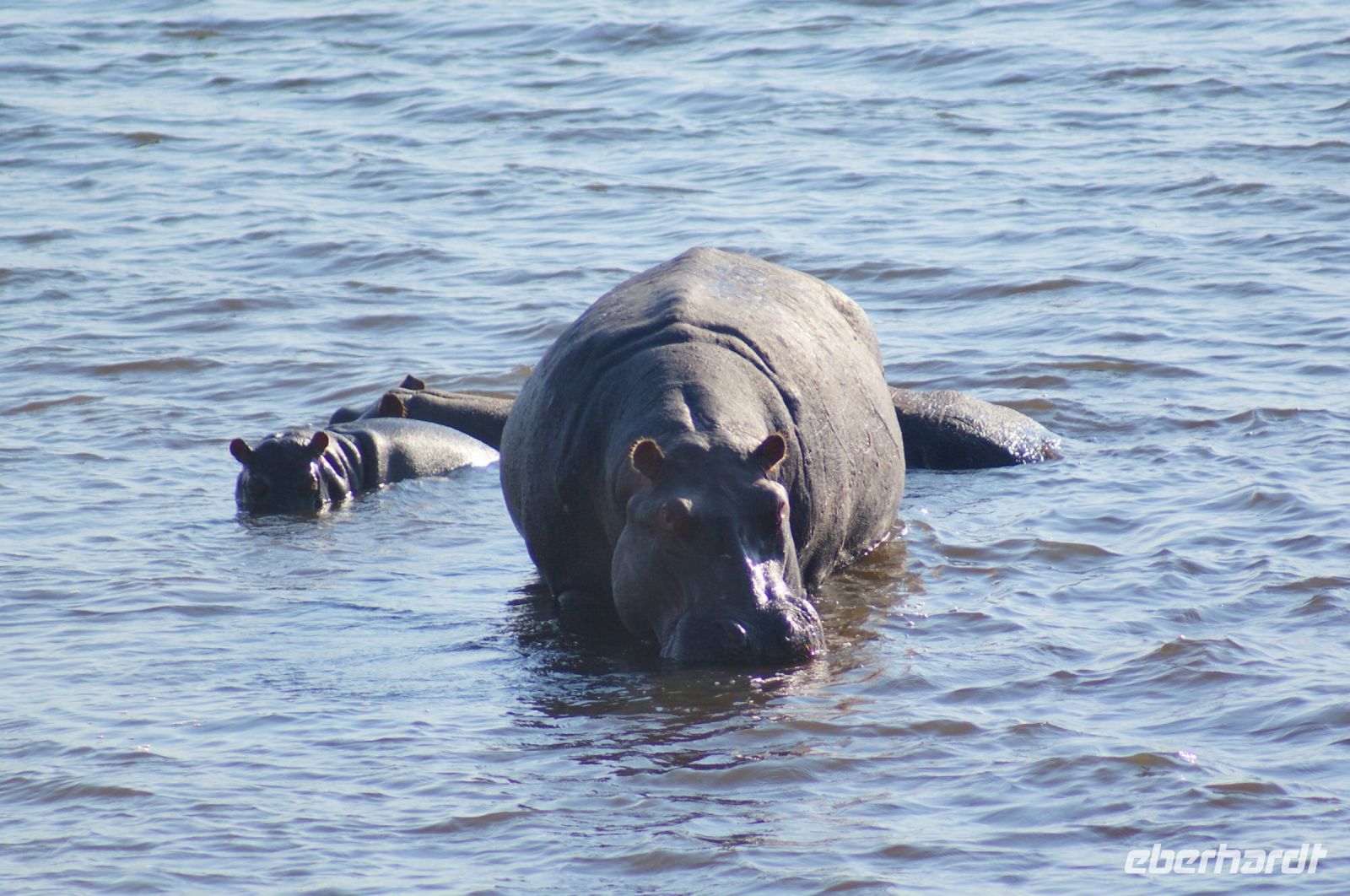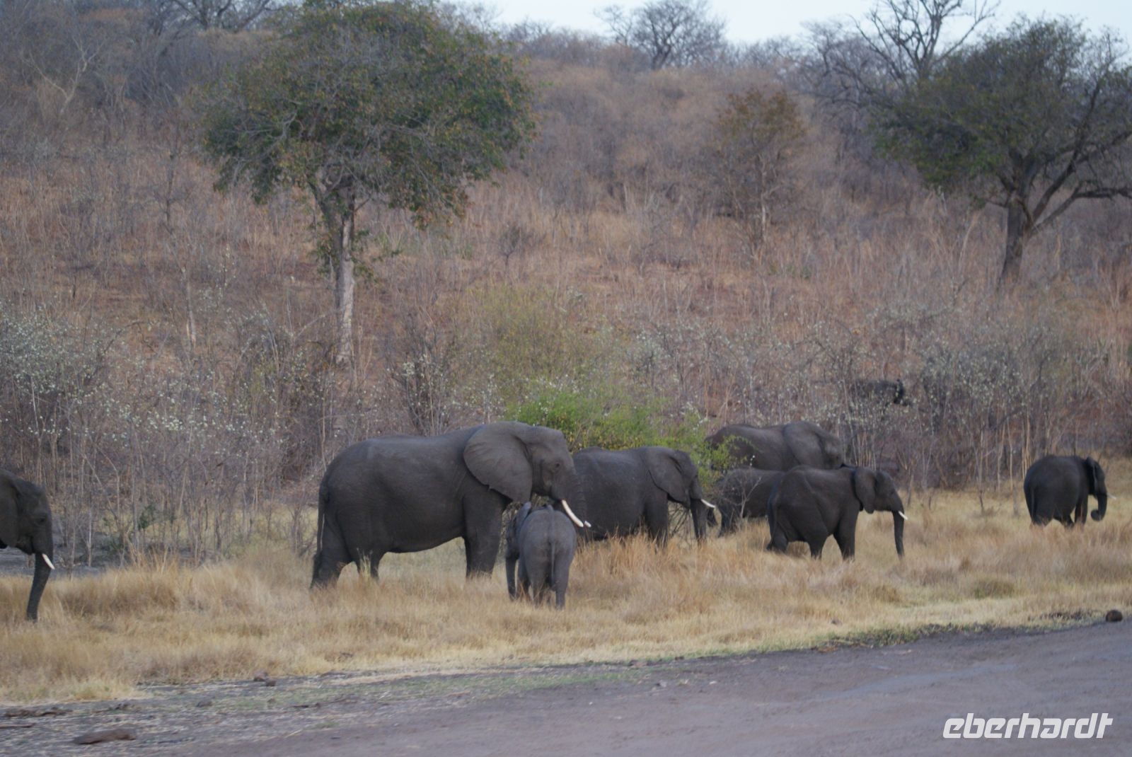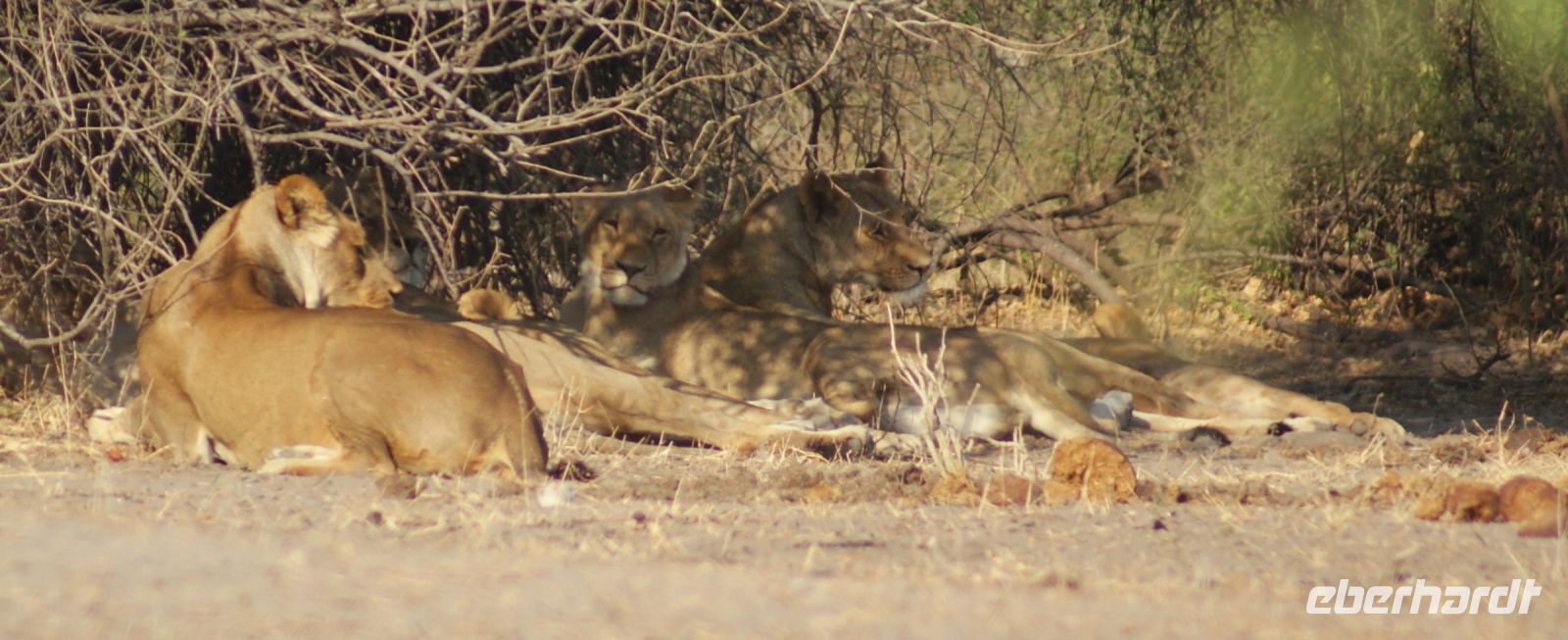 Frühmorgens um 05.45 Uhr treffen wir uns alle in der Lobby, um zu unserer heutigen Pirschfahrt aufzubrechen. Guide Emanuel begrüßt uns freundlich in „seinem Büro“ und wir fahren bei noch kühlen Temperaturen in den Chobe Nationalpark. Da wir schon reichlich Elefanten gesehen haben, bitten wir Emanuel um einen „Katzentag“, wie gerne würden wir nochmals Löwen oder gar einen Leoparden sehen. Wie schon gedacht, ist heute Morgen die Fläche und um den Chobe Fluss ohne Elefanten, da sich diese in der Nacht in den Buschbereich verziehen und erst am Vormittag zum Trinken erscheinen. So sehen wir nur ein paar Hippos, die friedlich grasen oder sich im Wasser aufhalten. Impalas, Kudus, Büffel lassen sich blicken und auch so manche Elefanten im Gebüsch. Unser Wunsch sollte wahr werden. Guide Emanuel erhält einen Tipp, dass Löwen gesichtet wurden und schon „fliegen“ wir per Jeep in genannte Richtung. Das Glück ist mit uns, wir sehen etliche Löwinnen und Nachwuchs im Gebüsch dösend, was für ein Erlebnis. Dieses haben wir dann nicht für uns alleine, denn im Nu sind wir umgeben von gefühlt allen Jeeps im Park. Verständlich-jeder will die Katzen sehen! Danach erfolgt ein Morgenkaffee mitten im Busch. Wir bitten unseren Guide nochmals zu den Löwen zu fahren und dürfen diese im Anschluss erneut aus anderer Perspektive genießen. Einfach ein toller Morgen! Glücklich kehren wir zur Lodge zurück und frühstücken erst mal ausgiebig. Die Mittagszeit genießt jeder nach seinem Geschmack und spaziert vielleicht ein bisschen durch Kasane, bevor wir uns nachmittags zur Safari per Boot einfinden. Wir erleben wunderbare Stunden an Bord und sehen die Tiere nun vom Wasser aus. Ein tolles Erlebnis, Elefanten, Wasserböcke, Krokodile, Flusspferde, Störche, Büffel zu sehen, wie diese friedlich grasen und sich durch uns nicht stören lassen. Die Elefantenherden, die wie eine Perlenkette aneinander gereiht durch den Fluss zurück zum Ufer schwimmen, lassen uns sprachlos zurück-welch ein toller Augenblick. Der anschließende Sonnenuntergang ist die Krönung und als dann noch Elefanten vor der Sonne vorbeiziehen, entstehen unglaublich schöne Aufnahmen, die wir alle lang in Erinnerung behalten werden.