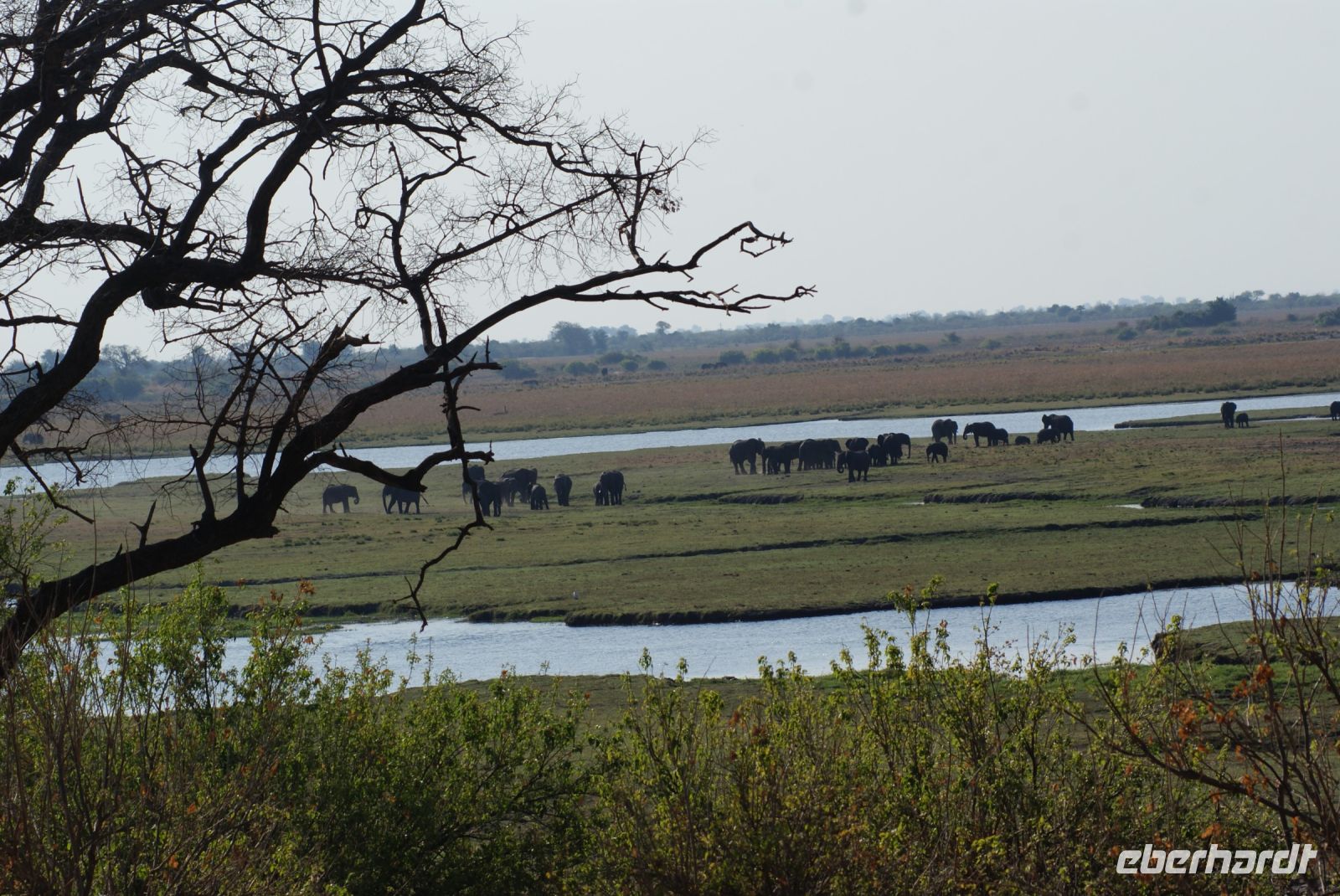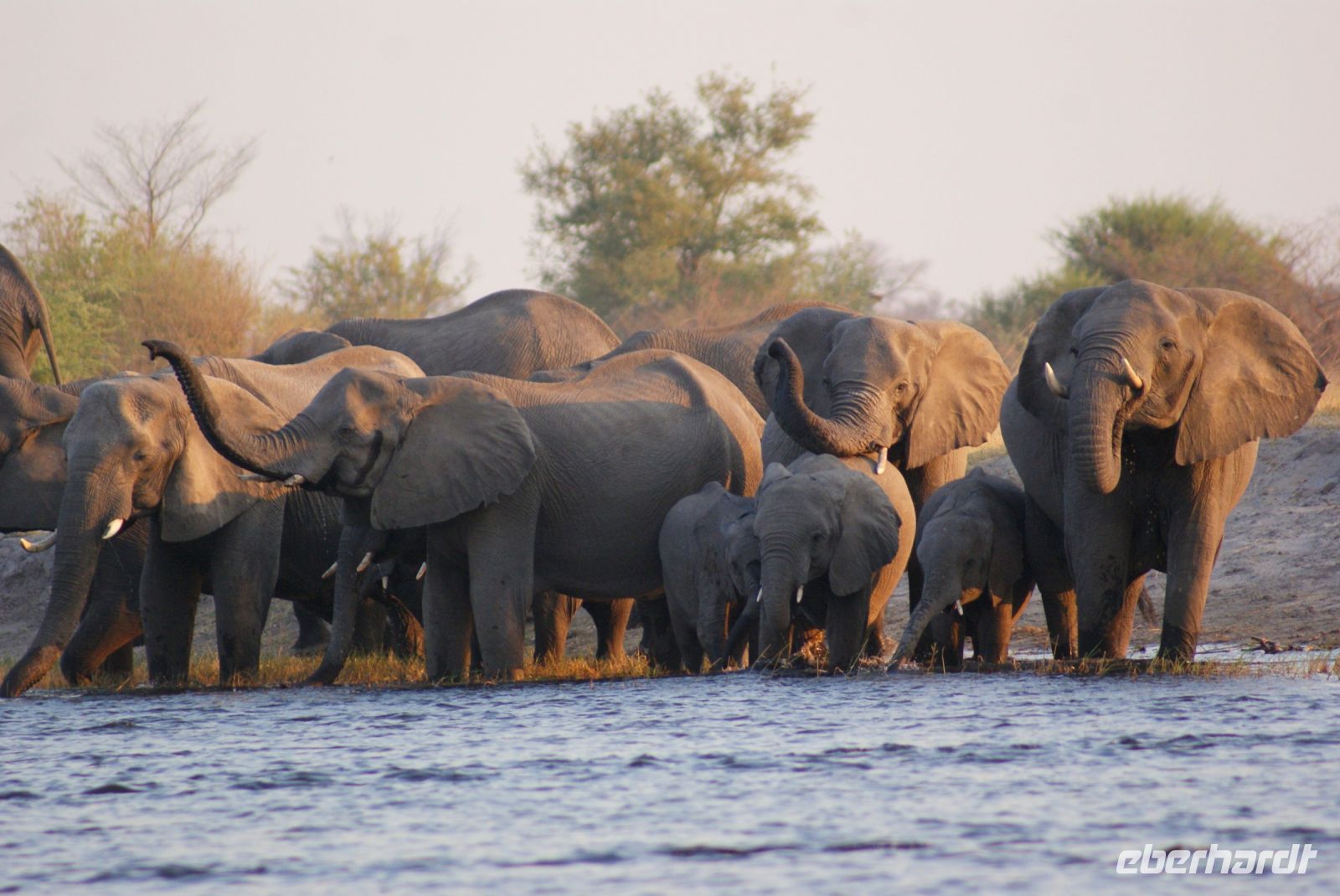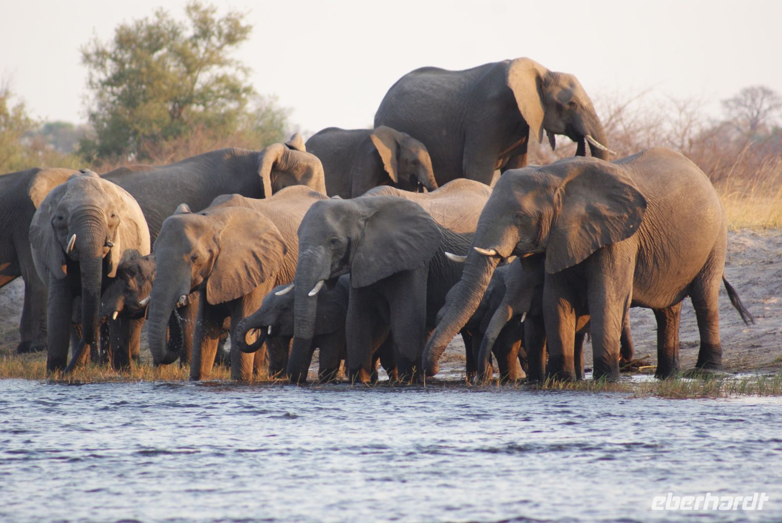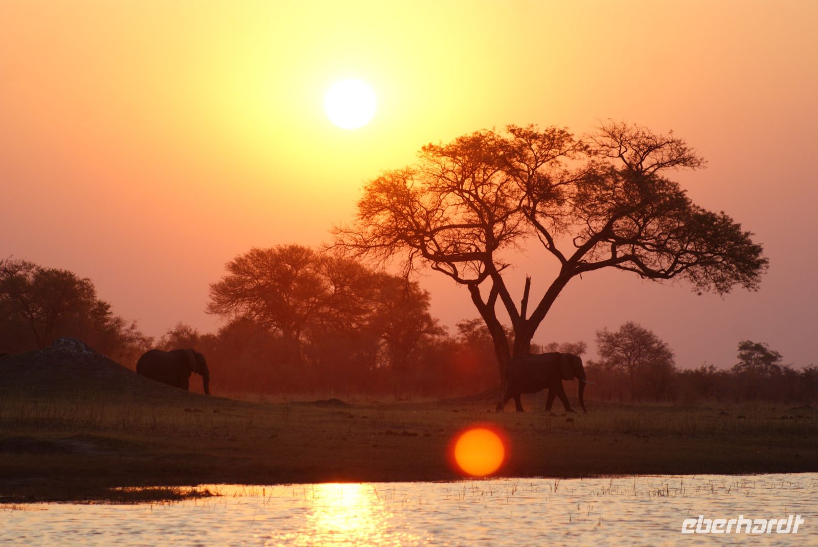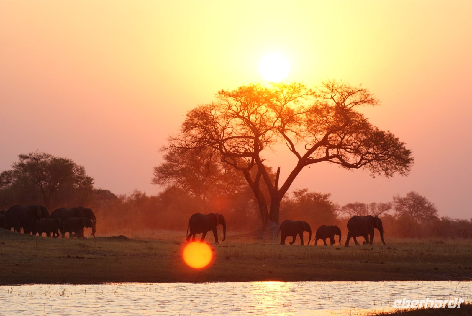 Bevor wir heute Namibia verlassen, statten wir dem nah gelegenen Cultural Village –dem lebenden Museumsdorf –einen Besuch ab. Wir werden von einem Stammesmitglied durch das Dorf geführt und über die verschiedensten Alltagsdinge des Stammes wie Ackerbau, Töpferei, Hausbau, Viehwirtschaft, etc. unterrichtet. Viele Stationen werden live vorgeführt, so sehen wir den Schmied bei seiner Arbeit, wir sehen, wie man Vögel, vorzugsweise Perlhühner, mit einfachen Fallen fängt, lernen, wie ein Haus entsteht und ein Hühnerstall mit darunter befindlicher Falle gefertigt wird. Danach erfolgen noch verschiedene Gesänge und Tänze und zum krönenden Schluss kommt noch der Medizinmann ins Spiel, der den Baobabbaum hinaufklettert und uns somit Glück für die weiterführende Reise bringen soll. Nehmen wir es als gutes Zeichen und ziehen weiter Richtung Katima Mulilo, wo wir uns für einen Mittagssnack einkaufen. Nun ist es nicht mehr weit bis zur Grenze nach Botswana. Dort angekommen, erledigen wir die Formalitäten und schon bald darauf befinden wir uns auf einer Transitstraße, die durch den Chobe Nationalpark führt. Dieser misst 11.700 Km² und beherbergt an die 250.000 Elefanten. Zwei von Ihnen sehen wir schon kurz nach unserer Einfahrt, die beide liegend unter einem Baum ein Mittagsschläfchen halten. Sehr ungewöhnlich und wir staunen über dieses seltene Bild. So manche Elefantenherde entdecken wir noch am Wegesrand, bis wir schließlich Kasane und somit unser Tagesziel erreichen. Hier wartet bereits unser Safari-Jeep auf uns, den wir für eine Nachmittagspirschfahrt gebucht haben. Schnell im neuen Hotel eingecheckt und schon geht es zurück in die Natur zu den Tieren. Wir können uns nicht satt sehen-hunderte Elefanten haben sich rund um den Chobe River versammelt um sich hier mit Nahrung zu versorgen. Umgeben von den Dickhäutern sind wir einfach nur froh, diesen zusätzlichen Ausflug gebucht zu haben, der uns noch so manche Überraschung in Form von Flusspferden, Krokodilen und dem besonders seltenen Honigdachs bereithält. Zurück in unserer neuen Unterkunft genießen wir das erste Abendessen in Botswana bei Marimba-Klängen und lassen den Tag Revue passieren.