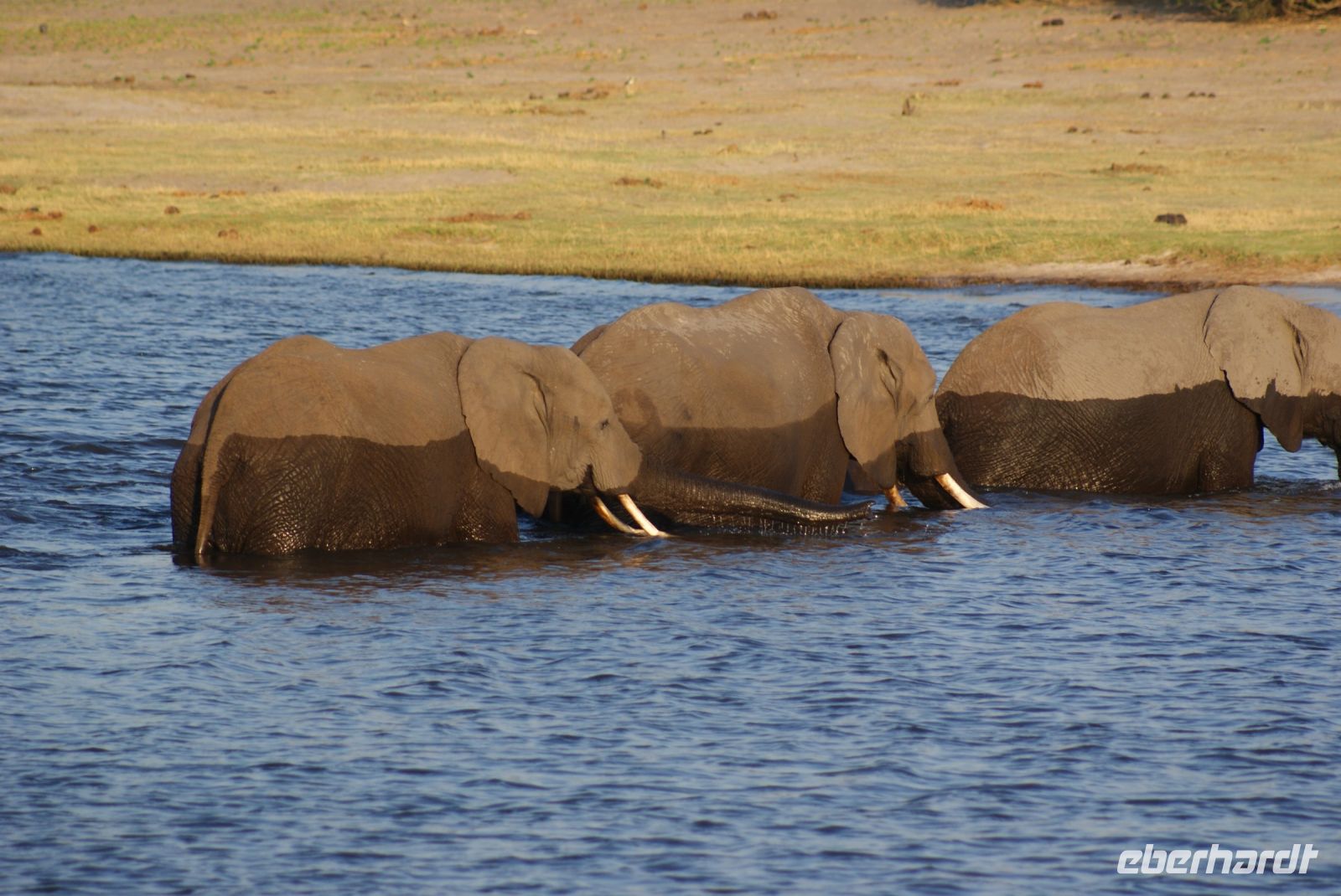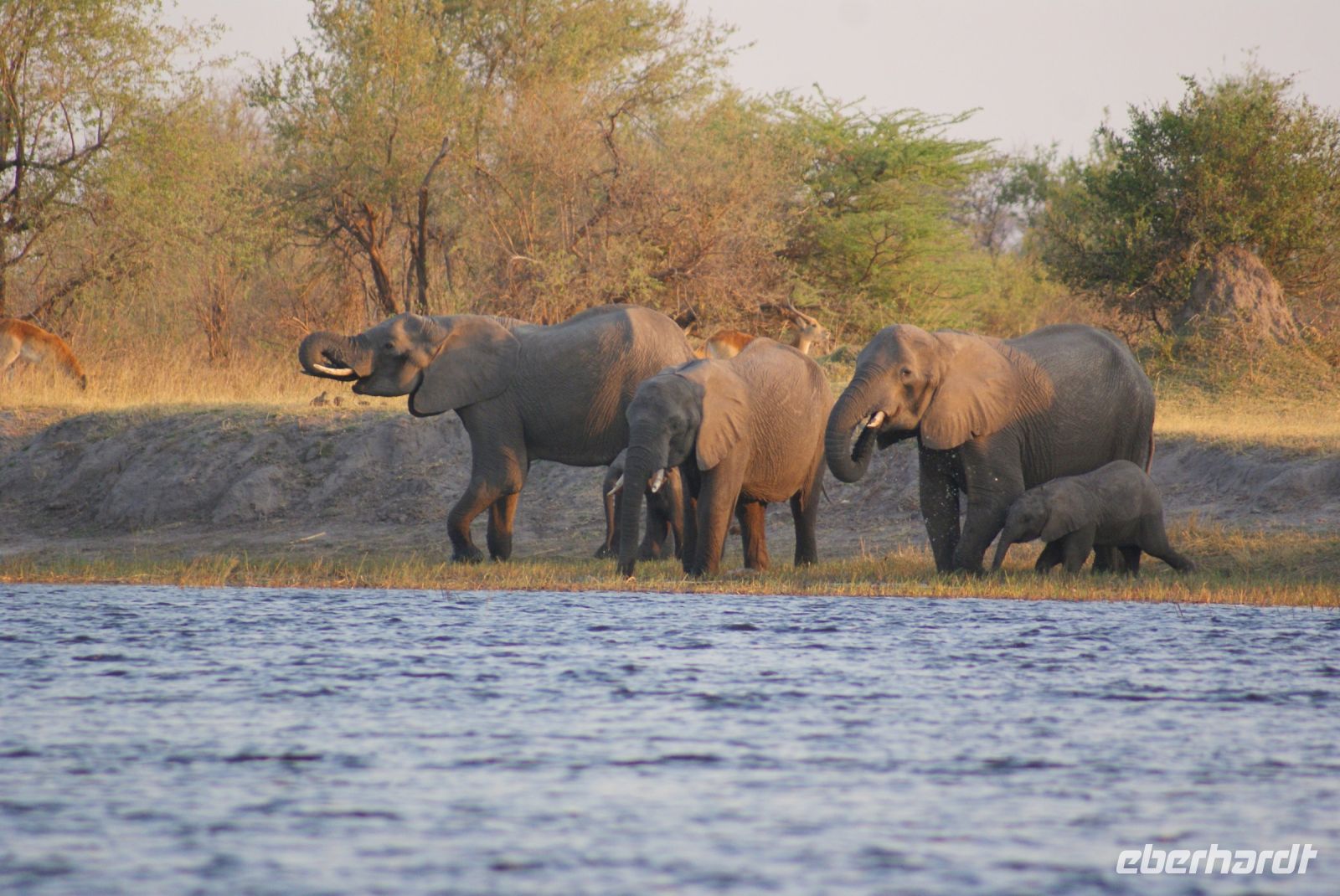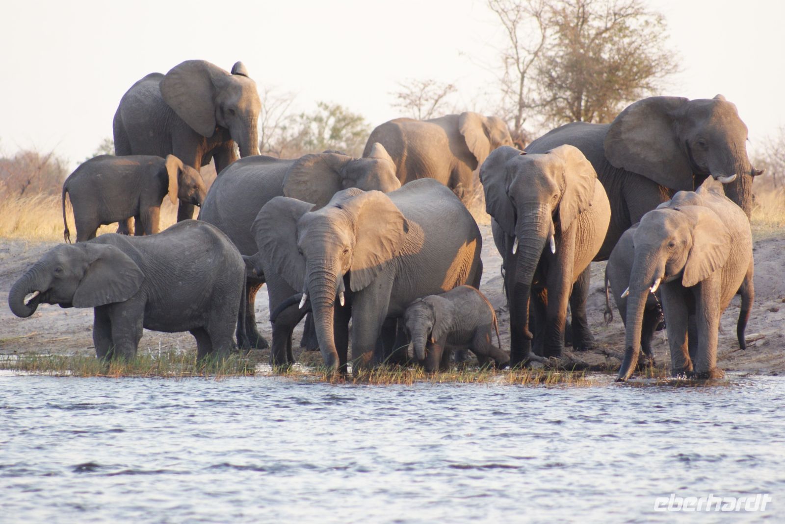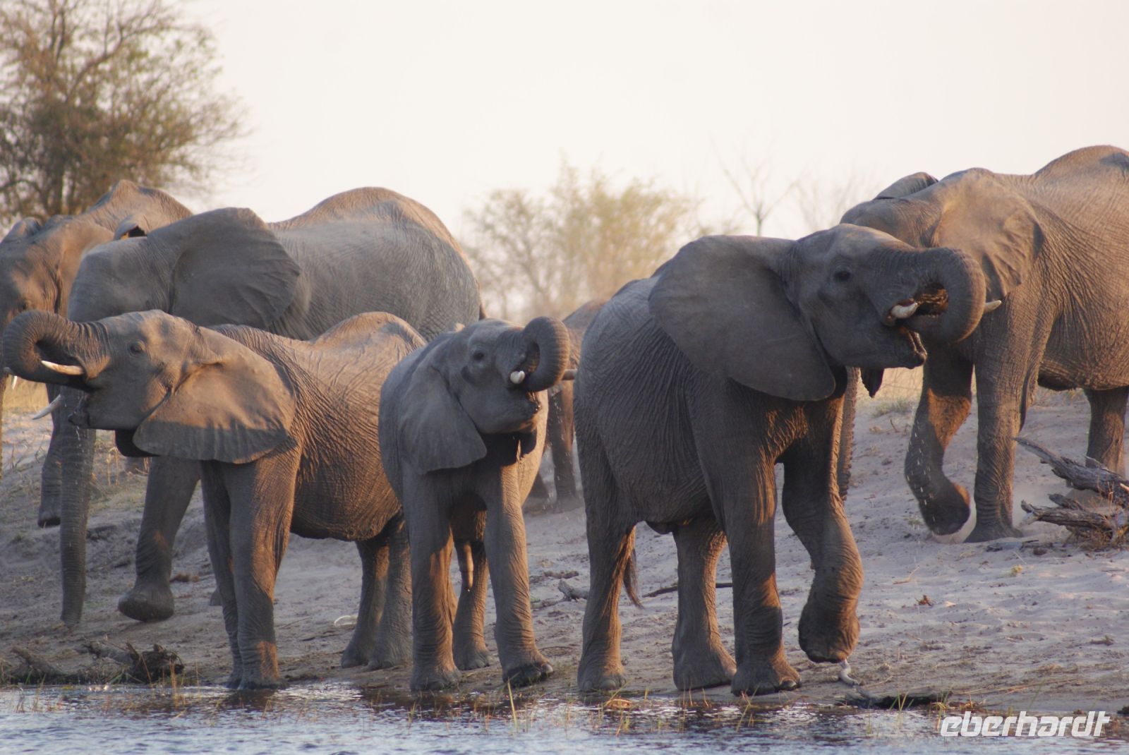Bevor wir heute Namibia verlassen, statten wir dem nah gelegenen Cultural Village –dem lebenden Museumsdorf –einen Besuch ab. Wir werden von einem Stammesmitglied durch das Dorf geführt und über die verschiedensten Alltagsdinge des Stammes wie Ackerbau, Töpferei, Hausbau, Viehwirtschaft, etc. unterrichtet. Viele Stationen werden live vorgeführt, so sehen wir den Schmied bei seiner Arbeit, wir sehen, wie man Vögel, vorzugsweise Perlhühner, mit einfachen Fallen fängt, lernen, wie ein Haus entsteht und ein Hühnerstall mit darunter befindlicher Falle gefertigt wird. Danach erfolgen noch verschiedene Gesänge und Tänze und zum krönenden Schluss kommt noch der Medizinmann ins Spiel, der den Baobabbaum hinaufklettert und uns somit Glück für die weiterführende Reise bringen soll. Nehmen wir es als gutes Zeichen und ziehen weiter Richtung Katima Mulilo, wo wir uns für einen Mittagssnack einkaufen. Nun ist es nicht mehr weit bis zur Grenze nach Botswana. Dort angekommen, erledigen wir die Formalitäten und schon bald darauf befinden wir uns auf einer Transitstraße, die durch den Chobe Nationalpark führt. Dieser misst 11.700 Km² und beherbergt an die 250.000 Elefanten. Zwei von Ihnen sehen wir schon kurz nach unserer Einfahrt, die beide liegend unter einem Baum ein Mittagsschläfchen halten. Sehr ungewöhnlich und wir staunen über dieses seltene Bild. So manche Elefantenherde entdecken wir noch am Wegesrand, bis wir schließlich Kasane und somit unser Tagesziel erreichen. Hier wartet bereits unser Safari-Jeep auf uns, den wir für eine Nachmittagspirschfahrt gebucht haben. Schnell im neuen Hotel eingecheckt und schon geht es zurück in die Natur zu den Tieren. Wir können uns nicht satt sehen-hunderte Elefanten haben sich rund um den Chobe River versammelt um sich hier mit Nahrung zu versorgen. Umgeben von den Dickhäutern sind wir einfach nur froh, diesen zusätzlichen Ausflug gebucht zu haben, der uns noch so manche Überraschung in Form von Flusspferden, Krokodilen und dem besonders seltenen Honigdachs bereithält. Zurück in unserer neuen Unterkunft genießen wir das erste Abendessen in Botswana bei Marimba-Klängen und lassen den Tag Revue passieren.