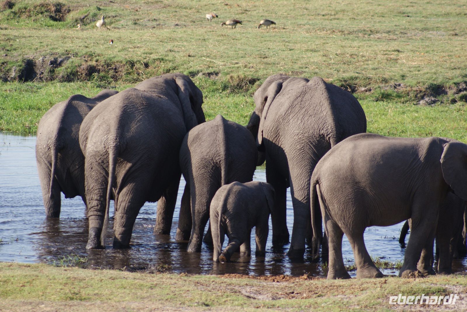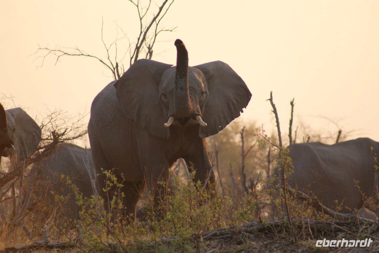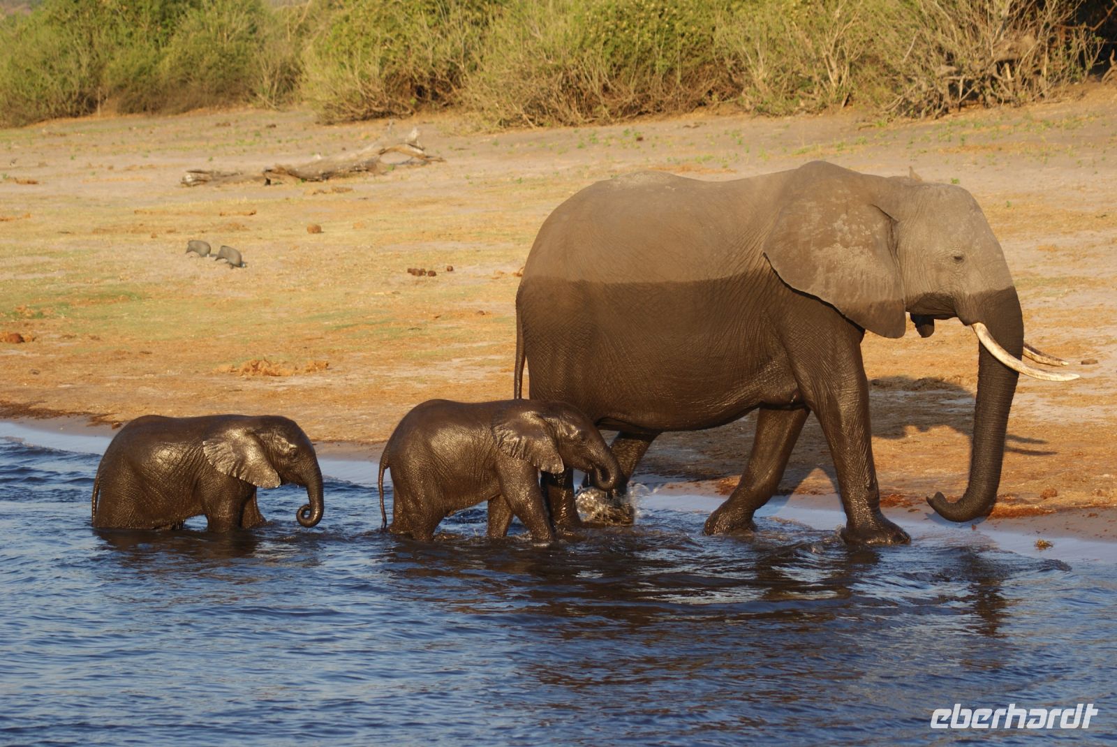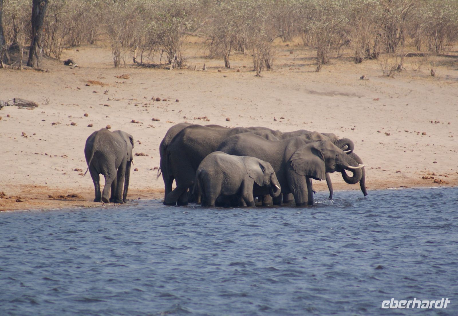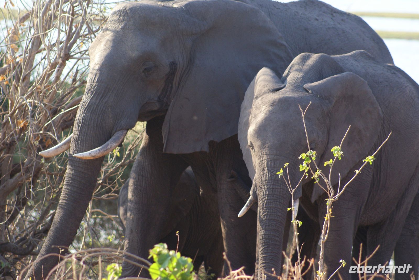 Bevor wir heute Namibia verlassen, statten wir dem nah gelegenen Cultural Village –dem lebenden Museumsdorf –einen Besuch ab. Wir werden von einem Stammesmitglied durch das Dorf geführt und über die verschiedensten Alltagsdinge des Stammes wie Ackerbau, Töpferei, Hausbau, Viehwirtschaft, etc. unterrichtet. Viele Stationen werden live vorgeführt, so sehen wir den Schmied bei seiner Arbeit, wir sehen, wie man Vögel, vorzugsweise Perlhühner, mit einfachen Fallen fängt, lernen, wie ein Haus entsteht und ein Hühnerstall mit darunter befindlicher Falle gefertigt wird. Danach erfolgen noch verschiedene Gesänge und Tänze und zum krönenden Schluss kommt noch der Medizinmann ins Spiel, der den Baobabbaum hinaufklettert und uns somit Glück für die weiterführende Reise bringen soll. Nehmen wir es als gutes Zeichen und ziehen weiter Richtung Katima Mulilo, wo wir uns für einen Mittagssnack einkaufen. Nun ist es nicht mehr weit bis zur Grenze nach Botswana. Dort angekommen, erledigen wir die Formalitäten und schon bald darauf befinden wir uns auf einer Transitstraße, die durch den Chobe Nationalpark führt. Dieser misst 11.700 Km² und beherbergt an die 250.000 Elefanten. Zwei von Ihnen sehen wir schon kurz nach unserer Einfahrt, die beide liegend unter einem Baum ein Mittagsschläfchen halten. Sehr ungewöhnlich und wir staunen über dieses seltene Bild. So manche Elefantenherde entdecken wir noch am Wegesrand, bis wir schließlich Kasane und somit unser Tagesziel erreichen. Hier wartet bereits unser Safari-Jeep auf uns, den wir für eine Nachmittagspirschfahrt gebucht haben. Schnell im neuen Hotel eingecheckt und schon geht es zurück in die Natur zu den Tieren. Wir können uns nicht satt sehen-hunderte Elefanten haben sich rund um den Chobe River versammelt um sich hier mit Nahrung zu versorgen. Umgeben von den Dickhäutern sind wir einfach nur froh, diesen zusätzlichen Ausflug gebucht zu haben, der uns noch so manche Überraschung in Form von Flusspferden, Krokodilen und dem besonders seltenen Honigdachs bereithält. Zurück in unserer neuen Unterkunft genießen wir das erste Abendessen in Botswana bei Marimba-Klängen und lassen den Tag Revue passieren.