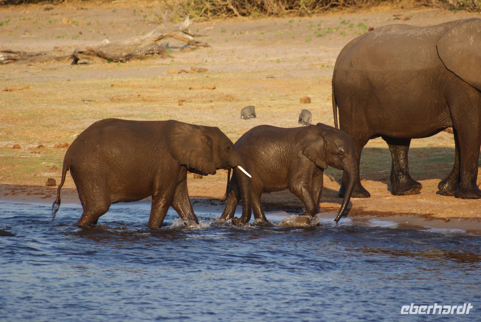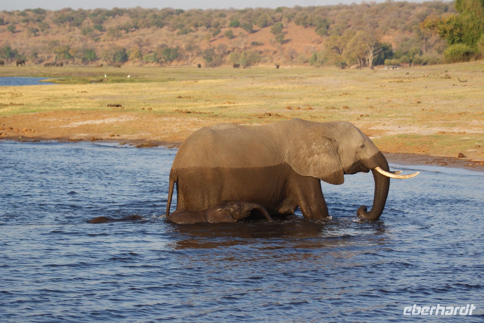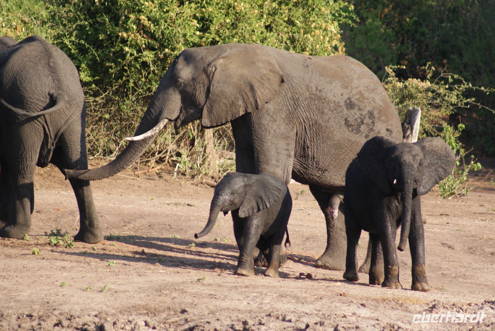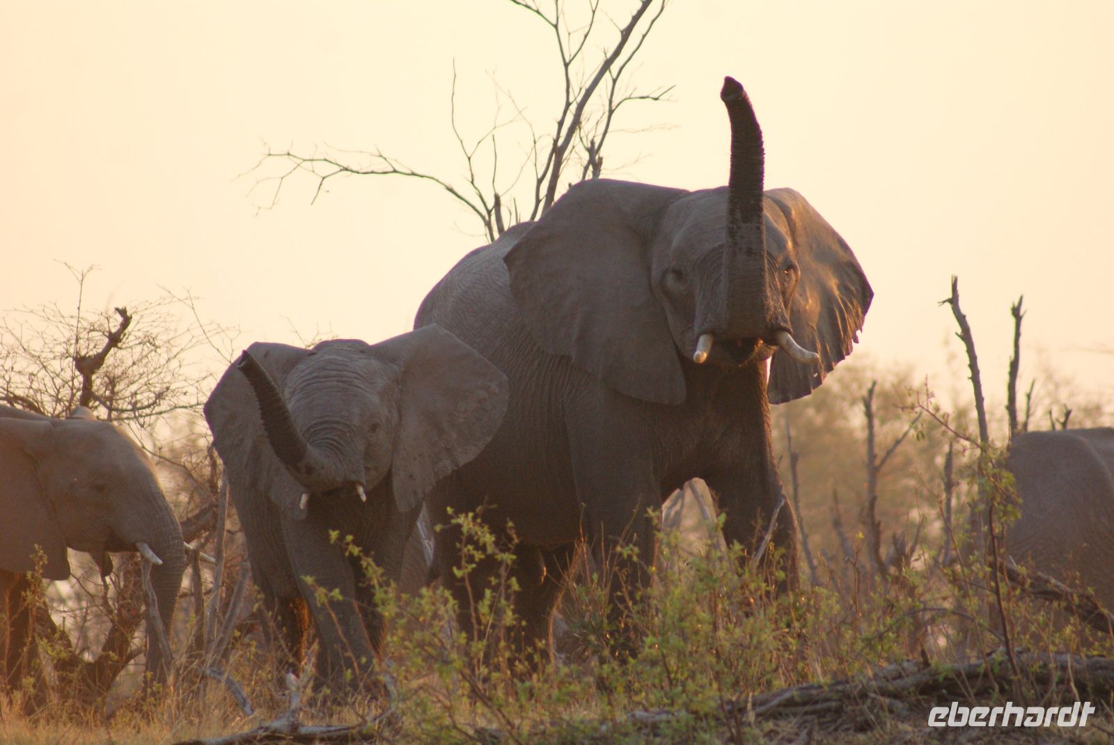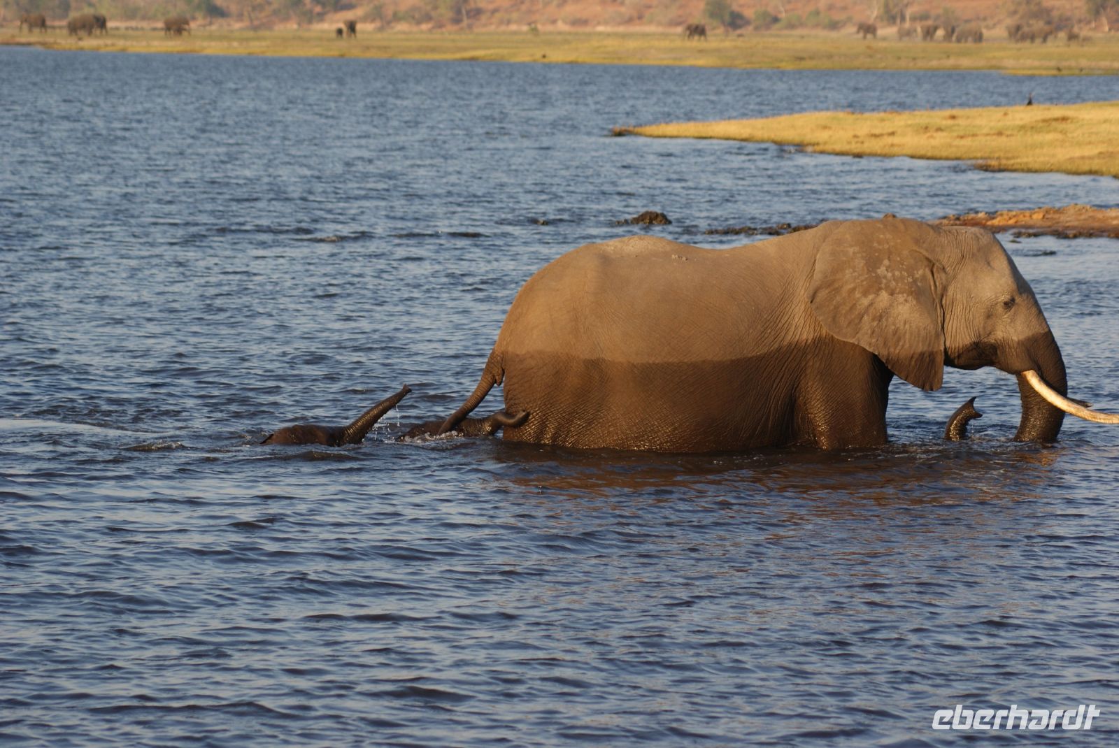 Bevor wir heute Namibia verlassen, statten wir dem nah gelegenen Cultural Village –dem lebenden Museumsdorf –einen Besuch ab. Wir werden von einem Stammesmitglied durch das Dorf geführt und über die verschiedensten Alltagsdinge des Stammes wie Ackerbau, Töpferei, Hausbau, Viehwirtschaft, etc. unterrichtet. Viele Stationen werden live vorgeführt, so sehen wir den Schmied bei seiner Arbeit, wir sehen, wie man Vögel, vorzugsweise Perlhühner, mit einfachen Fallen fängt, lernen, wie ein Haus entsteht und ein Hühnerstall mit darunter befindlicher Falle gefertigt wird. Danach erfolgen noch verschiedene Gesänge und Tänze und zum krönenden Schluss kommt noch der Medizinmann ins Spiel, der den Baobabbaum hinaufklettert und uns somit Glück für die weiterführende Reise bringen soll. Nehmen wir es als gutes Zeichen und ziehen weiter Richtung Katima Mulilo, wo wir uns für einen Mittagssnack einkaufen. Nun ist es nicht mehr weit bis zur Grenze nach Botswana. Dort angekommen, erledigen wir die Formalitäten und schon bald darauf befinden wir uns auf einer Transitstraße, die durch den Chobe Nationalpark führt. Dieser misst 11.700 Km² und beherbergt an die 250.000 Elefanten. Zwei von Ihnen sehen wir schon kurz nach unserer Einfahrt, die beide liegend unter einem Baum ein Mittagsschläfchen halten. Sehr ungewöhnlich und wir staunen über dieses seltene Bild. So manche Elefantenherde entdecken wir noch am Wegesrand, bis wir schließlich Kasane und somit unser Tagesziel erreichen. Hier wartet bereits unser Safari-Jeep auf uns, den wir für eine Nachmittagspirschfahrt gebucht haben. Schnell im neuen Hotel eingecheckt und schon geht es zurück in die Natur zu den Tieren. Wir können uns nicht satt sehen-hunderte Elefanten haben sich rund um den Chobe River versammelt um sich hier mit Nahrung zu versorgen. Umgeben von den Dickhäutern sind wir einfach nur froh, diesen zusätzlichen Ausflug gebucht zu haben, der uns noch so manche Überraschung in Form von Flusspferden, Krokodilen und dem besonders seltenen Honigdachs bereithält. Zurück in unserer neuen Unterkunft genießen wir das erste Abendessen in Botswana bei Marimba-Klängen und lassen den Tag Revue passieren.
