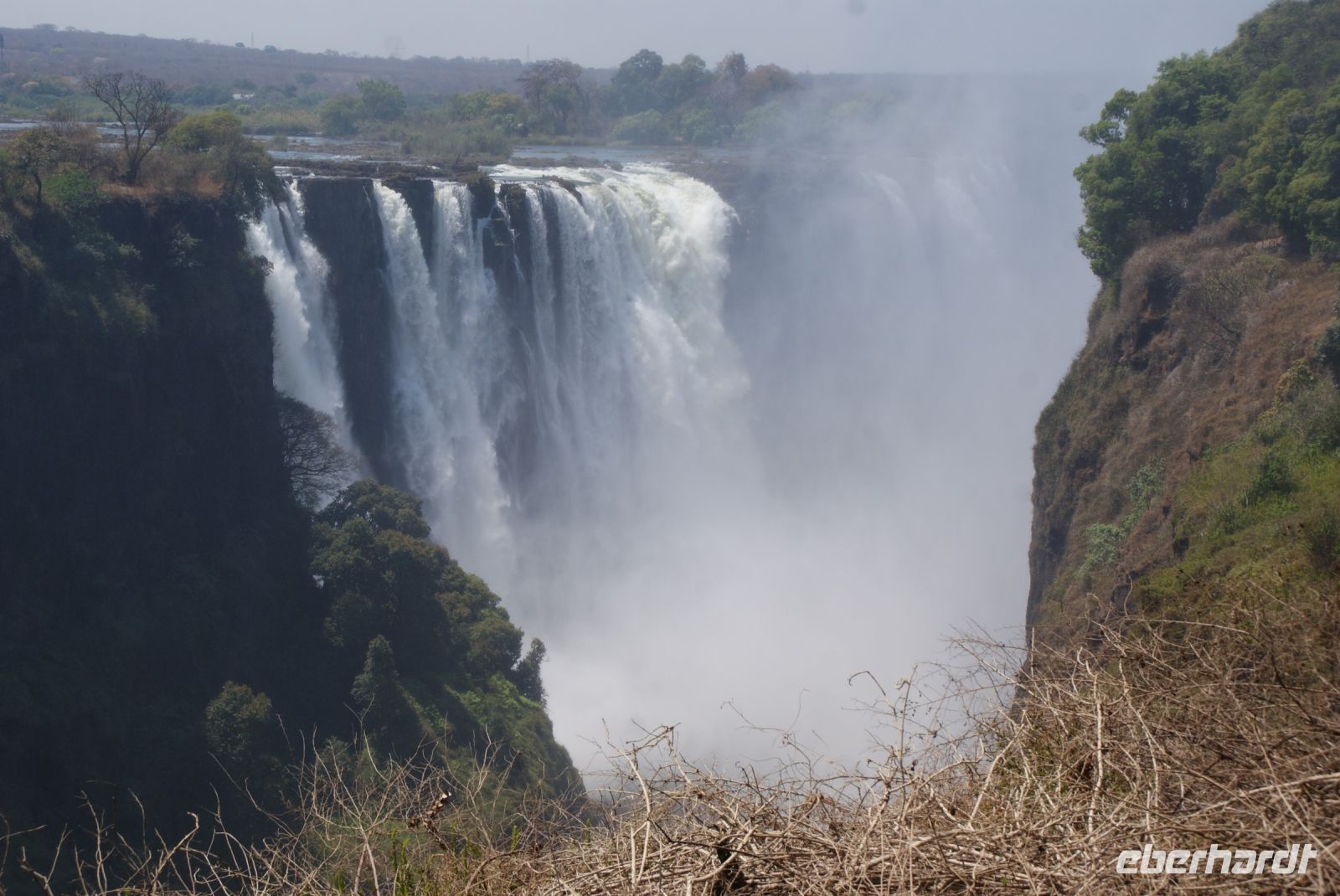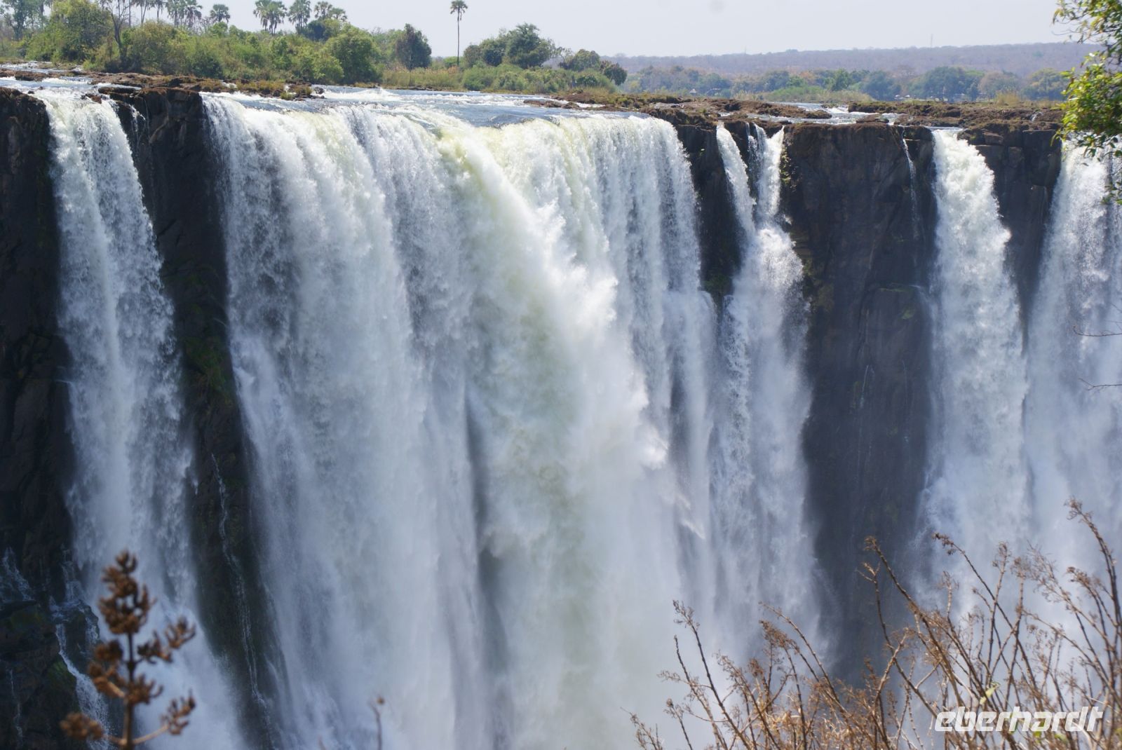 Wir genießen ein ruhiges Frühstück ohne Marimba-Spieler und machen uns früh auf den Weg zur Grenze. Botswana verlassen erschien einfach, natürlich mit Masken, die wir schnell noch holen mussten. Nach Simbabwe einreisen, erforderte etwas mehr Geduld von uns, aber auch dies hat unsere harmonische und stets geduldige Gruppe mit Bravour gemeistert. Nach 1.5 Std. nach Abfahrt Hotel, haben wir alle Grenzformalitäten erledigt und fahren nun in Simbabwe zu den Victoria Fällen. Im gleichnamigen Ort angekommen, schauen wir uns diesen per Durchfahrt an und dann geht es zu den berühmten Fällen, die mit zu den sieben Weltnaturwundern gehören. Diese wurden von dem schottischen Missionar und Afrikareisenden Sir David Livingstone im Jahre 1855 entdeckt, der diese nach der britischen Königin Victoria benannte. So spazieren wir die 16 möglichen Aussichtspunkte des Mosi oa Tunya (Der Rauch, der donnert), wie die Fälle in der einheimischen Sprache heißen, entlang. Wir befinden uns jetzt in der Trockenzeit, sodass die Fälle nicht so viel Wasser wie in der Regenzeit führen. Besser für uns, denn so haben wir eine sehr gute Sicht auf die verschiedenen Bereiche und können die Wasserfälle in Ruhe und beinahe trockenen Fußes genießen. So spazieren wir den breitesten, durchgehenden Wasserfall der Erde entlang und legen insgesamt knapp 4 Km zurück. Herrliche Aufnahmen entstehen und sogar manches Tier wie Kudu, Warzenschweine, Tokos und andere Vögel kreuzen unseren Weg. Bedingt durch die stets aufsteigende Gischt, entstand gegenüberliegend der Fälle ein Regenwald, durch den wir an den Fällen entlang schlendern. Nach so viel Wasser um uns herum, darf ein kühles Getränk zum Abschluss nicht fehlen. Am Nachmittag fahren wir ein letztes Mal per Boot zur abendlichen Fahrt auf den Sambesi. Eine friedliche Stimmung mit tollem Licht, nochmals Elefanten, Hippos und Krokodile, dazu schöne Getränke, runden eine rundum gelungene Reise wunderbar ab.