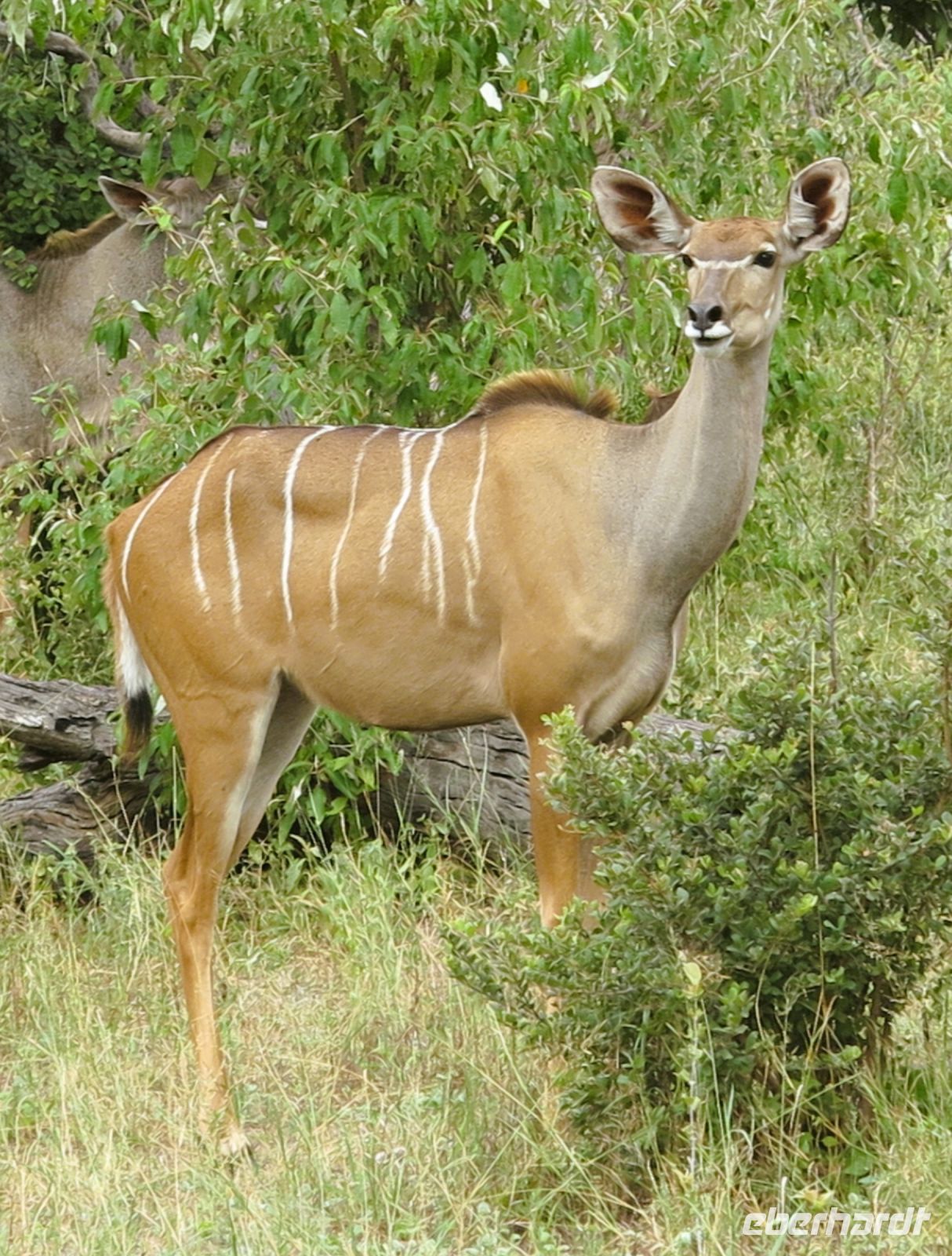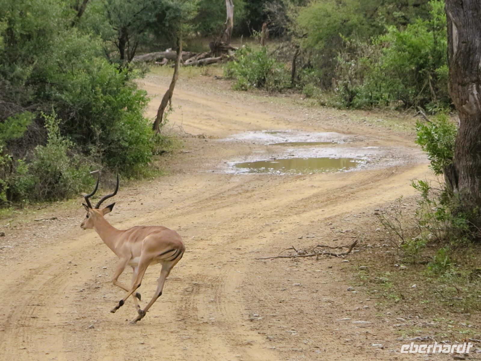 Weiter ging unsere Pirschfahrt. Wir haben viele Tiere gesehen: Zebras, Giraffen, Impalas, Warzenschweine, viele verschiedene Vögel, Moorantilopen und Kudus. Unser Fahrer hatte noch eine lustige Bezeichnung für die Impalas: Löwen McDonald’s. Die Moorantilopen bleiben immer in Wassernähe und besitzen deshalb eine spezielle Hufform, damit sie nicht bzw. kaum im schlammigen Boden einsinken. In unserem Geländewagen hatten wir zeitweise einen größeren Grashüpfer mit an Bord. Zum Glück hat den kaum einer mitbekommen.