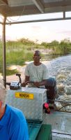 Was wir auf unserer frühmorgendlichen Pirschfahrt nicht gesehen hatten, haben wir jetzt gesehen: Flusspferde, Elefanten (leider nur zwei!), Kaffernbüffel, Impalas, Moorantilopen, Marabus, „fliegende Bananen“, verschiedene Enten-, Gans- und Storcharten. Und nicht zu vergessen, kleinere und ein großes, ca. 4 – 5 m langes, Krokodil, ca. 40 – 50 Jahre alt.