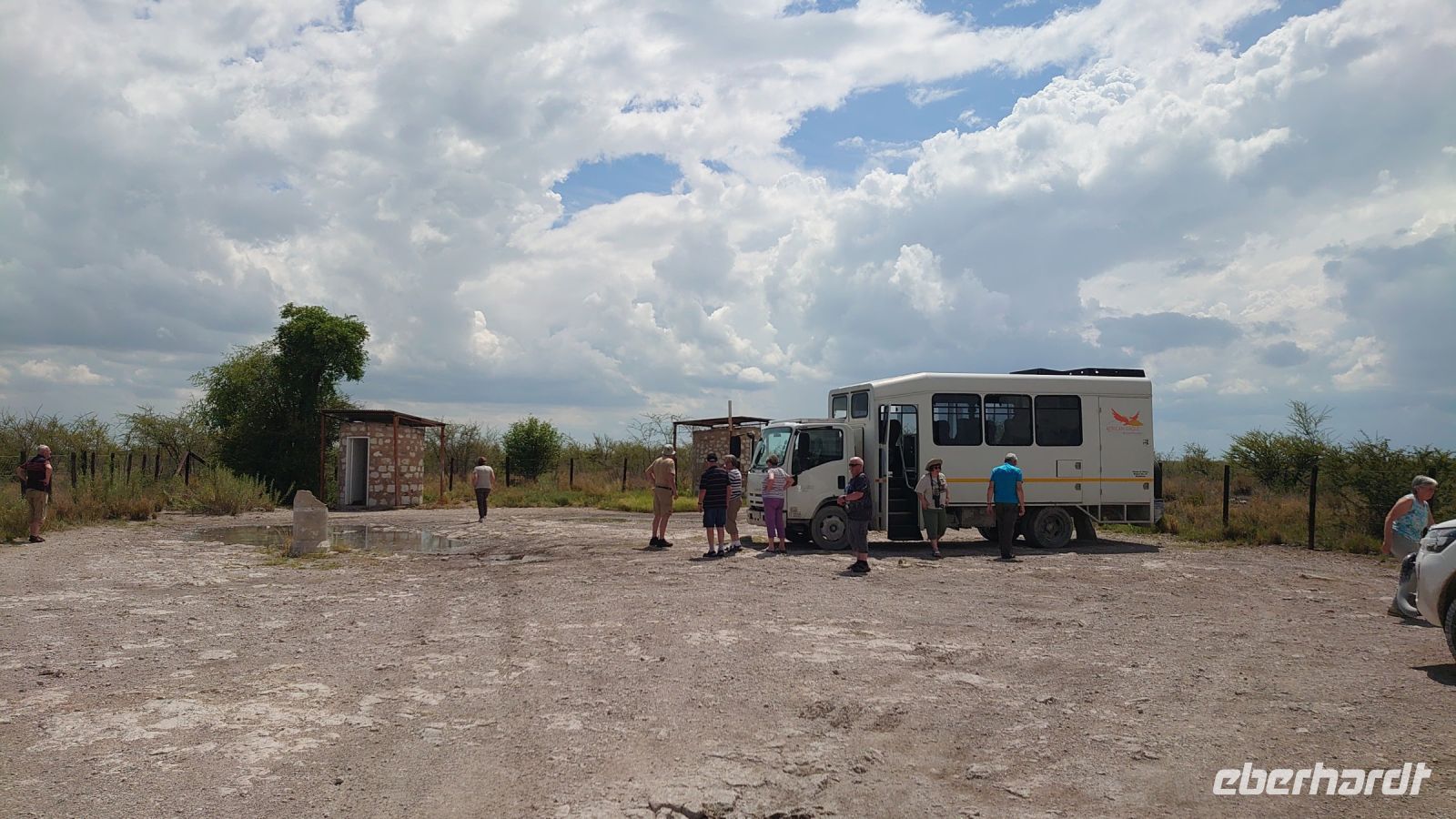In der Nacht hatte es geregnet. Da wir unsere ersten Kilometer auf Sand-Pads (afrikaans für Straße) zurücklegen mussten, wurde uns empfohlen, auf den gleichen Wegen zurück zur Teer-Straße zu fahren, auf denen wir gestern zur Mount Etjo-Safari-Lodge gefahren waren. Für den Weg, den wir eigentlich nehmen wollten, hätten wir ein Allradfahrzeug gebraucht. Auf den 40 km zurück zur Teer-Straße hat uns Maria die rote Erde, Kameldorn-Bäume und Termiten Hügel nähergebracht. Auch Tiere konnten wir entdecken: Kudus, Springböcke und Paviane. Unsere Sand-Pad war durch den Regen stark aufgeweicht. Unweit der Teer-Straße mussten wir sogar eine Wasserdurchfahrt bewältigen. War unproblematisch. Die nächsten anderthalb Stunden ging es zügig gen Norden. Nach etwa 130 km war Outjo erreicht, wo wir eine Pause einlegten. Wer wollte, konnte es sich im Bäckerei-Cafe gemütlich machen, sich im Supermarkt mal umschauen und erstes Geld unter die Leute bringen oder einfach auch nur mal die Beine vertreten. Nach weiteren 100 km war der südliche Eingang des Etoscha Nationalparks am Anderson-Gate erreicht. Wir hatten für unsere erste Erkundung etwa anderthalb Stunden Zeit. Die Nationalparks sind in der Regel von Sonnenaufgang bis Sonnenuntergang geöffnet, zu dieser Zeit etwa von 6:30 – 18:30 Uhr. Tiere haben wir auf unserer ersten kleinen Pirschfahrt nach Okaukuejo mit Abstechern zu Wasserlöchern leider kaum gesehen.
