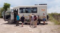 Nun konnte unsere Pirschfahrt beginnen. Die Fahrt ging durch Busch- und Baum-Savanne. Wir konnten viele Tiere, u.a. Moorantilopen, Giraffen und verschiedene Vögel, beobachten. Bei den Warzenschweinen erklärte uns Maria, dass diese auch Radio Africa genannt werden. Warum? Beim Wegrennen richten sie ihren Schwanz auf, der dann wie eine Antenne aussieht. Bei einem großen alten Baobab-Baum legten wir eine Pause ein und haben uns die Füße vertreten. Generell kann man in den Nationalparks nur an wenigen bestimmten Stellen aussteigen. Deshalb wird jede Pause gerne zum Füße vertreten genutzt. Auf der Rückfahrt haben wir dann noch zwei Warane, zwei Schildkröten und Strauße waren gesehen. Abgesehen von Elefanten-Böllerchen (= Elefanten-Dung) wieder nichts von den Big Five!