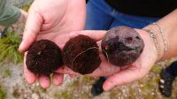Auf unserem Weg nach Rundu machten wir verschiedene Stopps. Maria zeigte uns den Wegweiser zur Fiume Lodge (Bauer sucht Frau lässt grüßen) und erklärte uns die Makalani-Palme mit ihren Früchten. Der innere Kern, die Makalani Nuss, wird mit schönen Schnitzereien zu kleinen Kunstwerken verarbeitet und an Touristen verkauft.