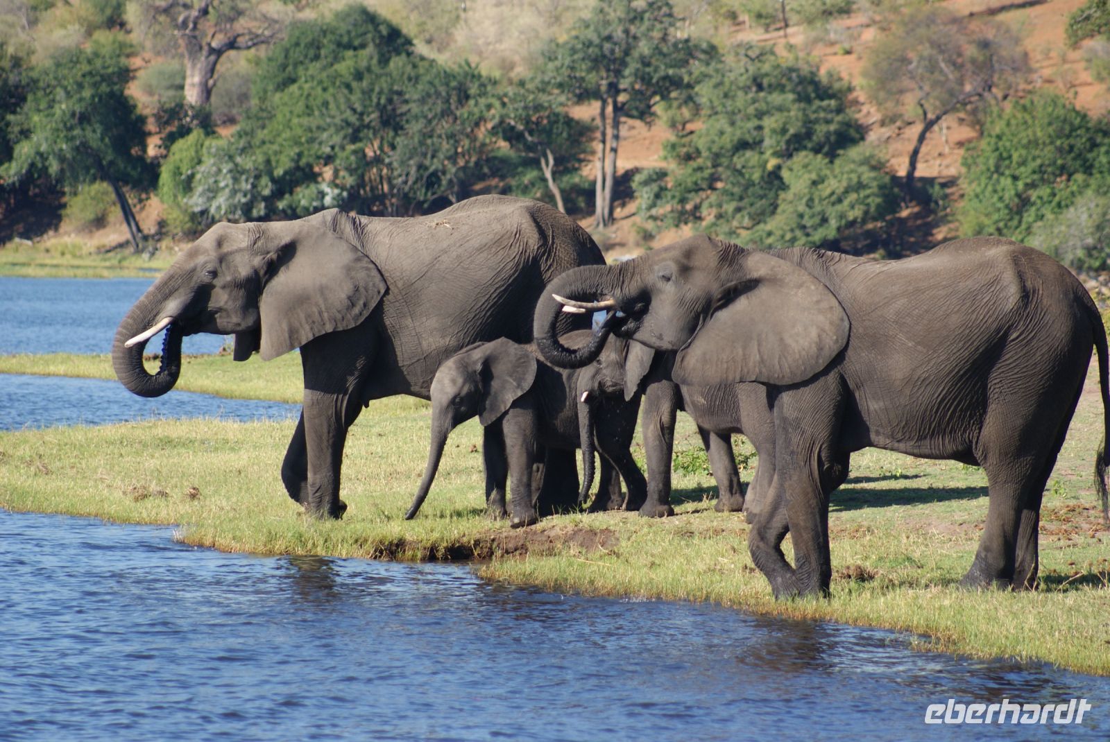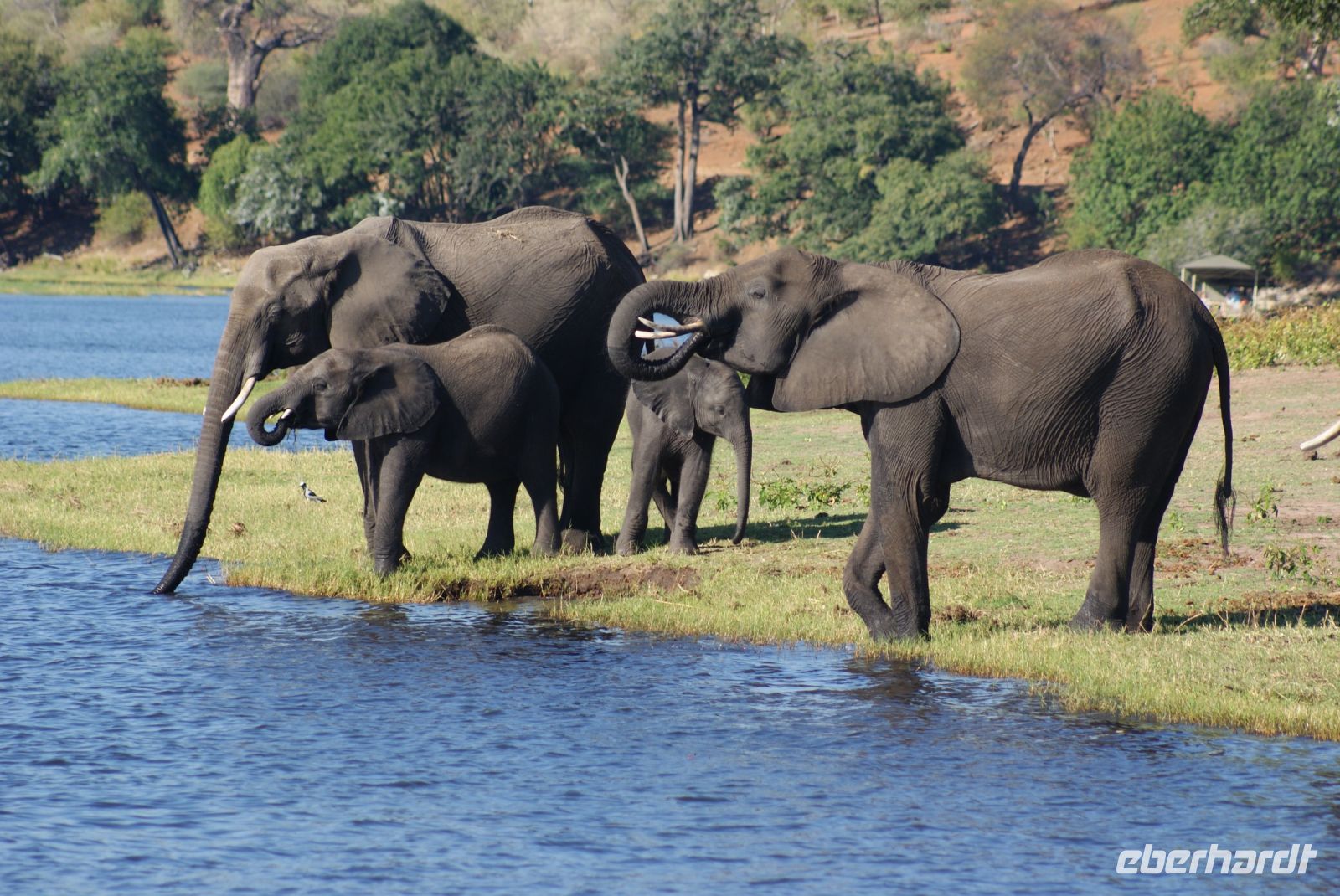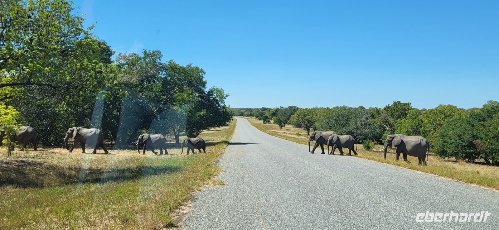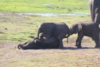 Wir verlassen die Namushasha Lodge und ziehen weiter Richtung Katima Mulilo, welches so viel wie „Feuer wird gelöscht“ bedeutet. Nun ist es nicht mehr weit bis zur Grenze nach Botswana. Dort angekommen, erledigen wir die Formalitäten und schon bald darauf befinden wir uns auf einer Transitstraße, die durch den Chobe Nationalpark führt. Dieser misst 11.700 Km² und beherbergt an die 250.000 Elefanten. So manche Elefantenherde entdecken wir noch am Wegesrand oder kreuzen unsere Route, bis wir schließlich Kasane und somit unser Tagesziel erreichen. Nach einer netten Begrüßung und zügigem Check-in in unsere „Safari-Rooms“, können wir noch einen Mittagssnack genießen. Anschließend heißt es „Heia-Safari“ und unser Safarijeep wartet bereits auf uns, den wir für eine Nachmittagspirschfahrt gebucht haben. Schon geht es zurück in die Natur zu den Tieren. Wir können uns nicht satt sehen-etliche Elefanten, von ganz klein bis ganz groß, haben sich rund um den Chobe River versammelt, um sich hier mit Nahrung zu versorgen oder einfach ein kühlendes Schlammbad zu genießen. Umgeben von den Dickhäutern sind wir einfach nur froh, diesen zusätzlichen Ausflug gebucht zu haben, der uns noch so manche Überraschung in Form von Flusspferden, Krokodilen, Kudus, Schabrackenschakal, Marabus, Paviane, Riesentrappe und Rotschnabeltokos, bereithält. Auf der Rückfahrt durch den Busch entdecken wir noch weitere Elefanten, die sich nachts ins Landesinnere zurückziehen, da es dort zum einen wärmer und geschützter vor Moskitos und Wilderern ist. Zurück in unserer neuen Unterkunft genießen wir ein tolles Grillbuffet in Botswana unter wunderbarem Sternenhimmel und lassen den Tag in geselliger Runde nochmals Revue passieren.