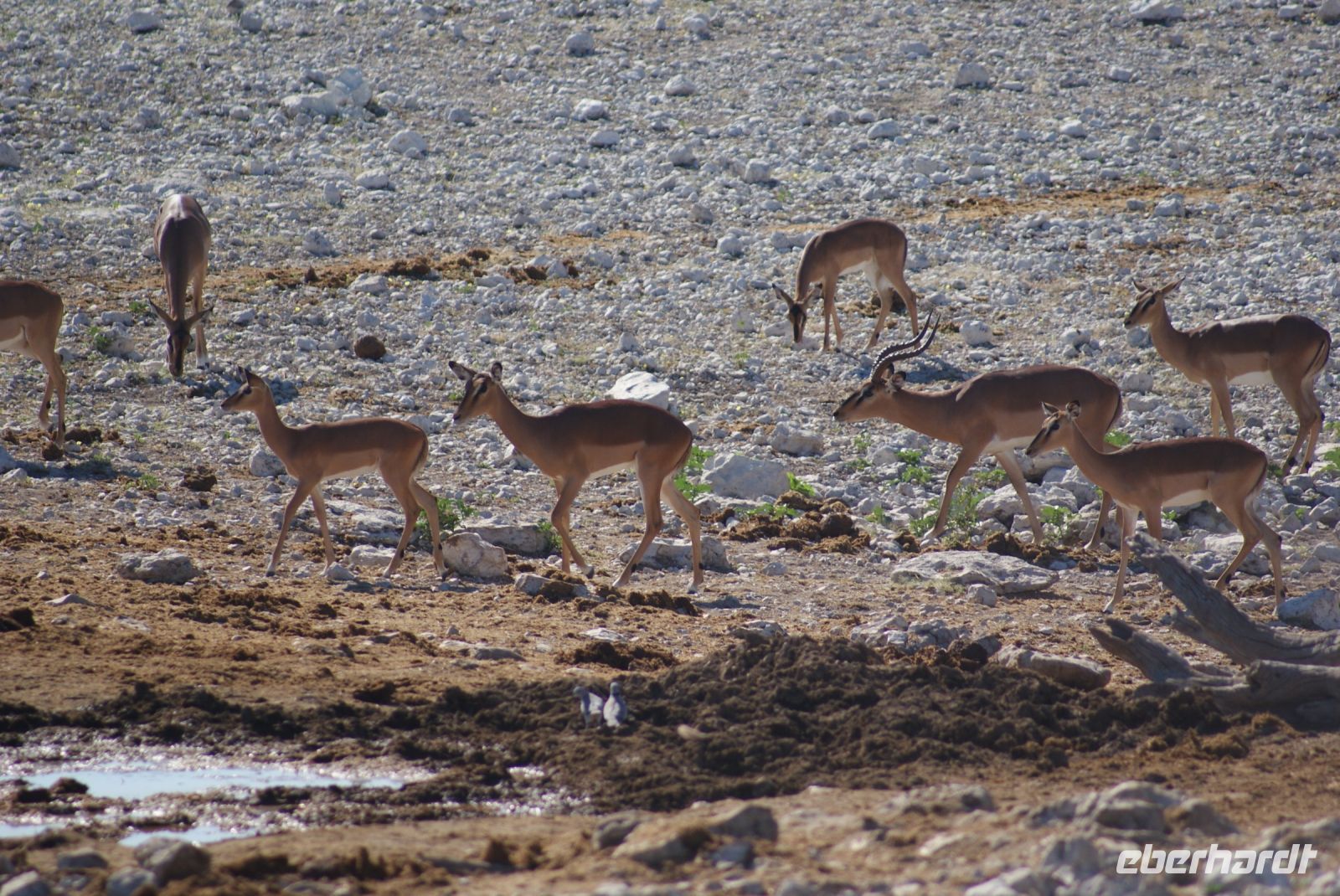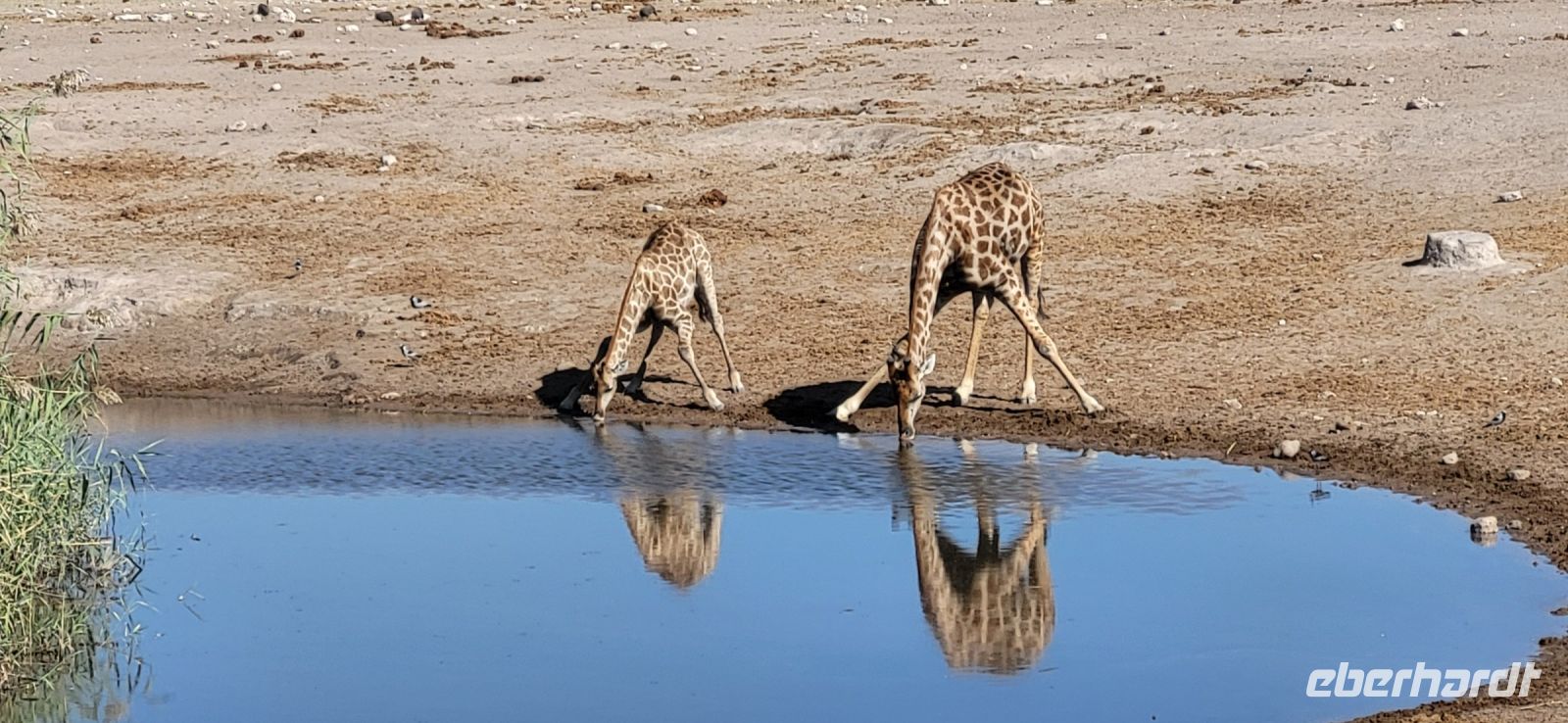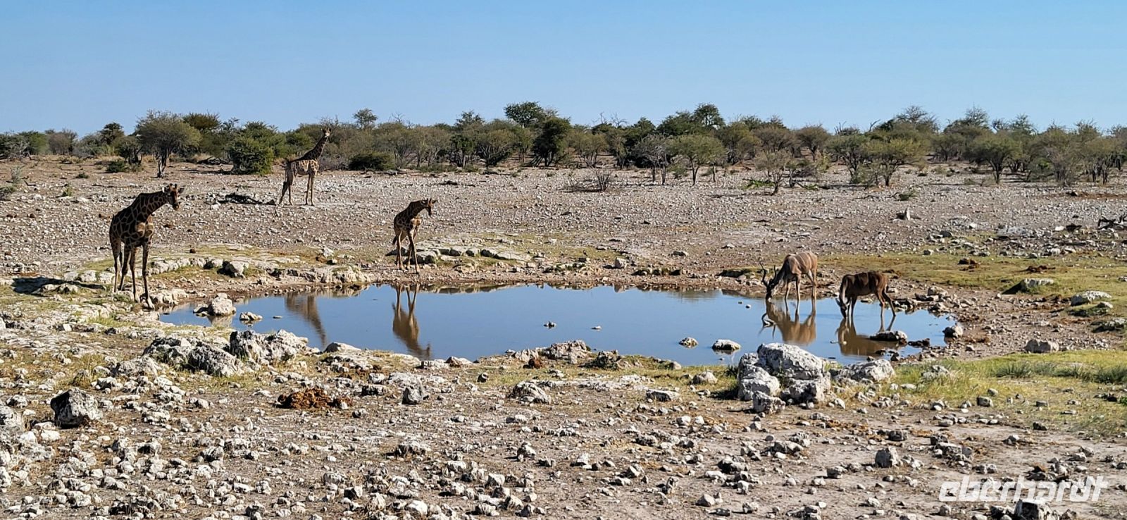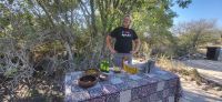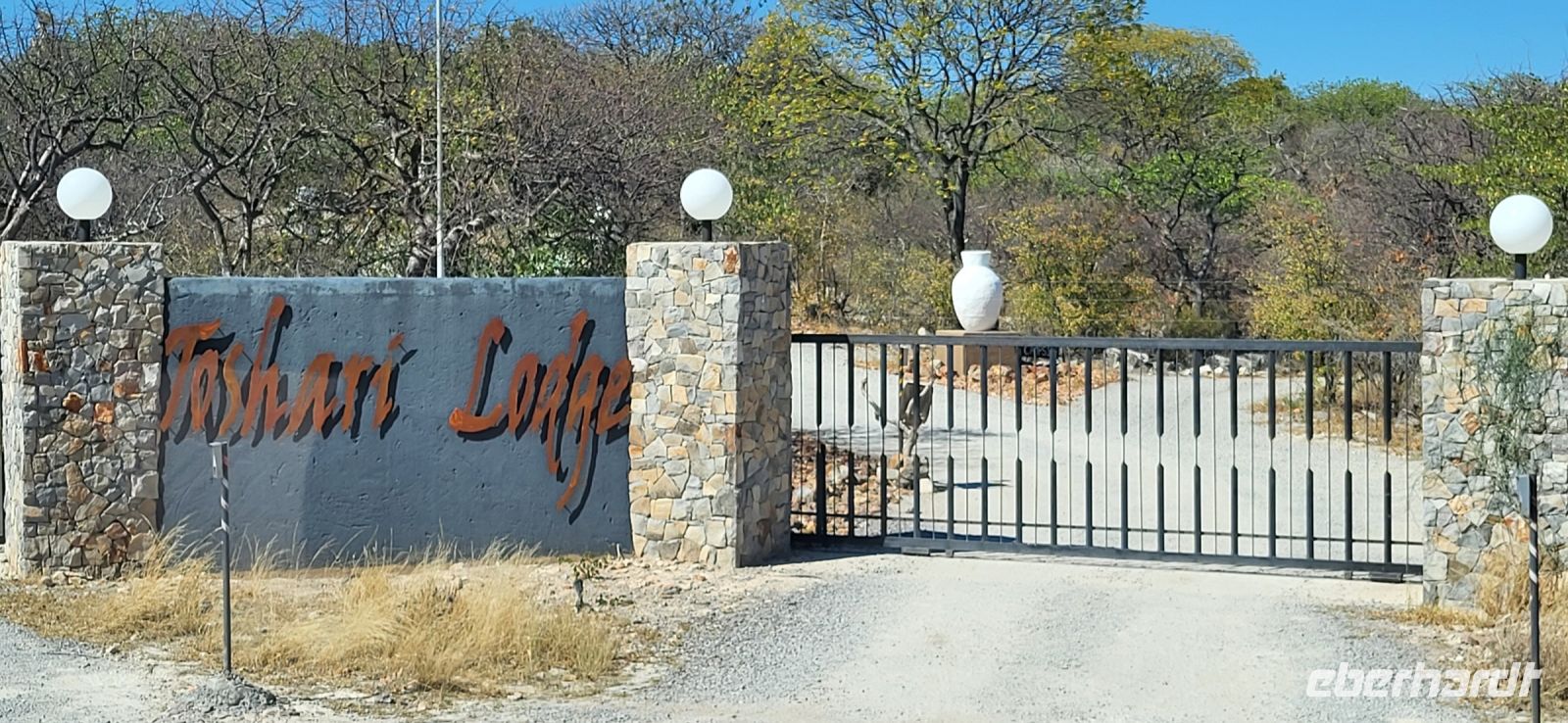 Gut ausgeruht von der gestrigen Anreise aus Deutschland, treffen wir uns zu einem tollen Frühstücksbuffet wieder. Da es nachts und am frühen Morgen noch recht frisch ist, sitzen wir teils sogar am offenen Kamin, wo es dann besonders gemütlich ist. Bestens versorgt starten wir unsere Fahrt Richtung Etosha Nationalpark. Zunächst begrüßt uns Maria musikalisch mit einer Strophe aus dem Südwesterlied „Hart wie Kameldornholz…“, welches einst von Heino eingesungen wurde und als ein altes Pfadfinderlied und die inoffizielle Hymne Namibias bekannt wurde. Unterwegs halten wir nun einige Male und steigen mit Maria aus, um uns beispielsweise mal einen riesigen Termitenhügel aus der Nähe anzuschauen. Einfach unglaublich, mit welcher Rafinesse es diese 2 cm großen Termiten schaffen, eine Klimatisierung innerhalb des Baus zu erschaffen, bei der konstante, angenehme Temperaturen herrschen. Webervogelnester und Tsamma-Melonen zieren ebenfalls unsere Strecke und auch diese begutachten wir aus der Nähe. Die Reise geht über Outjo (= Kleiner Hügel) und wie uns Maria erklärt, verändert sich indessen die Umgebung zu einer Hügellandschaft. Hier haben wir ausreichend Zeit, um im Ort den Spar Supermarkt, die örtliche Bäckerei mit vielen deutschen Spezialitäten und den Souvenirshop zu entern. Am frühen Nachmittag erreichen wir unsere Unterkunft für die nächsten beiden Nächte- die Toshari Lodge. Erst mal einchecken und etwas Pause und dann geht es mit denen, die möchten, zu einer Überraschungspirschfahrt in den Etosha Park. Am Anderson Gate starten wir in den 22.000 Km² großen Park. Den Namen erhielt dieser von der Ableitung „großer, weißer Platz“ und hiermit gemeint ist die riesige Etosha Pfanne, eine weiße, ausgetrocknete Senke mit unfassbaren Dimensionen. Zu Beginn zeigen sich uns etliche Giraffen, Springböcke, ein Gnu, Kudus, zahlreiche Strauße und abschließend gleich drei Spitzmaulnashörner hintereinander. Eine wirklich erfolgreiche erste Safari für einen Teil unserer Gruppe, während der andere Teil es sich in der Lodge am Pool und in der Anlage gemütlich gemacht hat. Zum Tagesabschluss sitzen wir bei einem herrlichen Abendessen in unserer gemütlichen Runde und lernen uns bei einem schönen Austausch näher kennen.