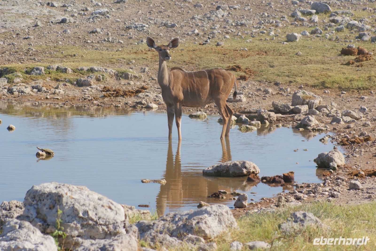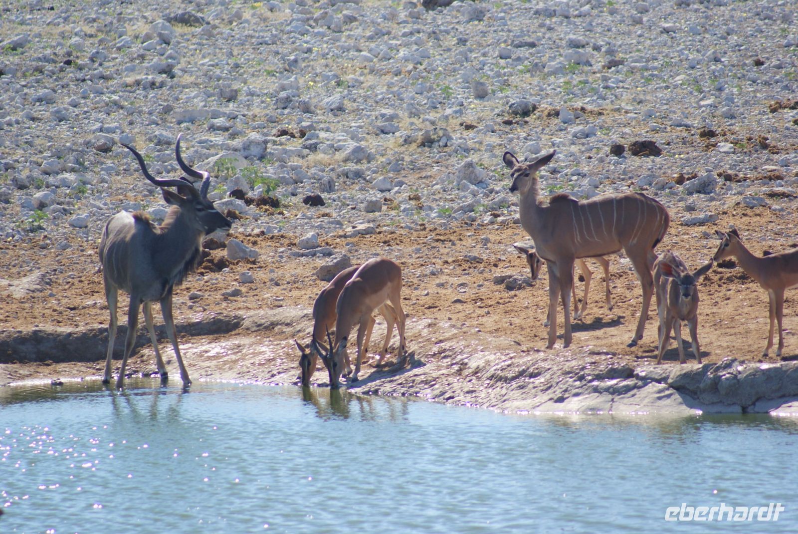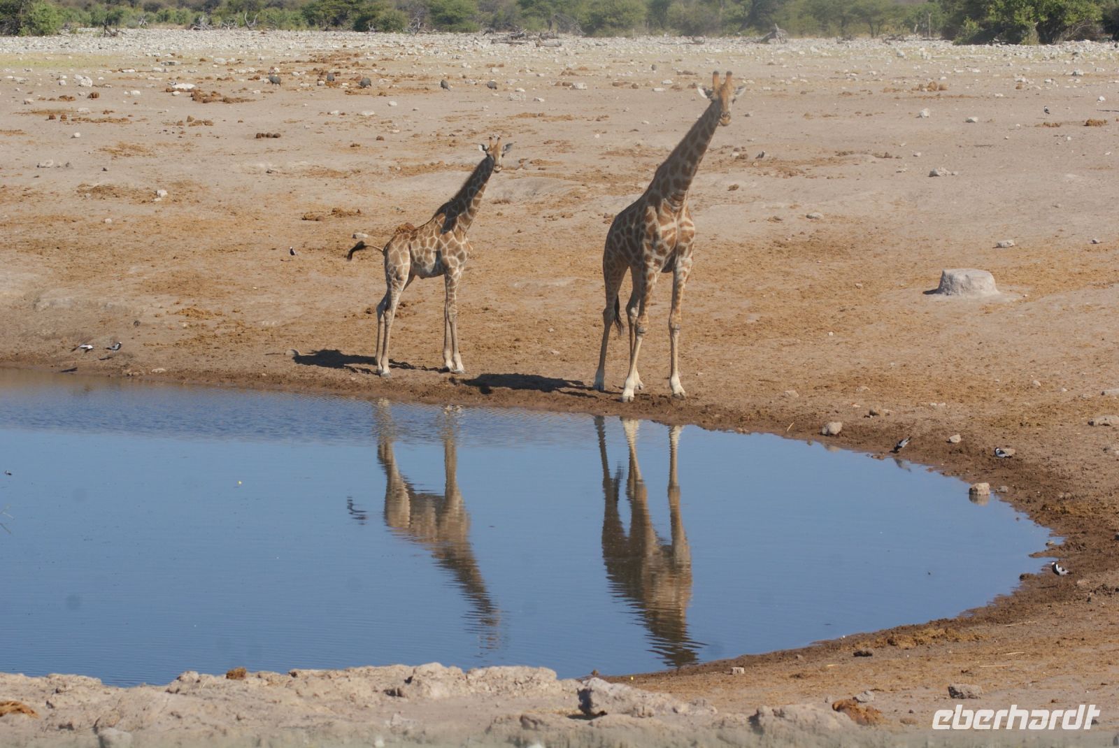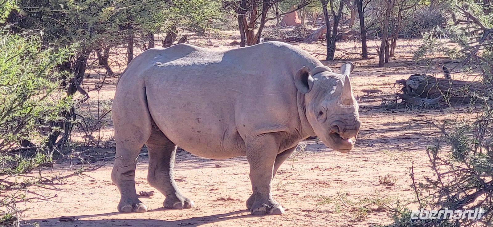 Gut ausgeruht von der gestrigen Anreise aus Deutschland, treffen wir uns zu einem tollen Frühstücksbuffet wieder. Da es nachts und am frühen Morgen noch recht frisch ist, sitzen wir teils sogar am offenen Kamin, wo es dann besonders gemütlich ist. Bestens versorgt starten wir unsere Fahrt Richtung Etosha Nationalpark. Zunächst begrüßt uns Maria musikalisch mit einer Strophe aus dem Südwesterlied „Hart wie Kameldornholz…“, welches einst von Heino eingesungen wurde und als ein altes Pfadfinderlied und die inoffizielle Hymne Namibias bekannt wurde. Unterwegs halten wir nun einige Male und steigen mit Maria aus, um uns beispielsweise mal einen riesigen Termitenhügel aus der Nähe anzuschauen. Einfach unglaublich, mit welcher Rafinesse es diese 2 cm großen Termiten schaffen, eine Klimatisierung innerhalb des Baus zu erschaffen, bei der konstante, angenehme Temperaturen herrschen. Webervogelnester und Tsamma-Melonen zieren ebenfalls unsere Strecke und auch diese begutachten wir aus der Nähe. Die Reise geht über Outjo (= Kleiner Hügel) und wie uns Maria erklärt, verändert sich indessen die Umgebung zu einer Hügellandschaft. Hier haben wir ausreichend Zeit, um im Ort den Spar Supermarkt, die örtliche Bäckerei mit vielen deutschen Spezialitäten und den Souvenirshop zu entern. Am frühen Nachmittag erreichen wir unsere Unterkunft für die nächsten beiden Nächte- die Toshari Lodge. Erst mal einchecken und etwas Pause und dann geht es mit denen, die möchten, zu einer Überraschungspirschfahrt in den Etosha Park. Am Anderson Gate starten wir in den 22.000 Km² großen Park. Den Namen erhielt dieser von der Ableitung „großer, weißer Platz“ und hiermit gemeint ist die riesige Etosha Pfanne, eine weiße, ausgetrocknete Senke mit unfassbaren Dimensionen. Zu Beginn zeigen sich uns etliche Giraffen, Springböcke, ein Gnu, Kudus, zahlreiche Strauße und abschließend gleich drei Spitzmaulnashörner hintereinander. Eine wirklich erfolgreiche erste Safari für einen Teil unserer Gruppe, während der andere Teil es sich in der Lodge am Pool und in der Anlage gemütlich gemacht hat. Zum Tagesabschluss sitzen wir bei einem herrlichen Abendessen in unserer gemütlichen Runde und lernen uns bei einem schönen Austausch näher kennen.