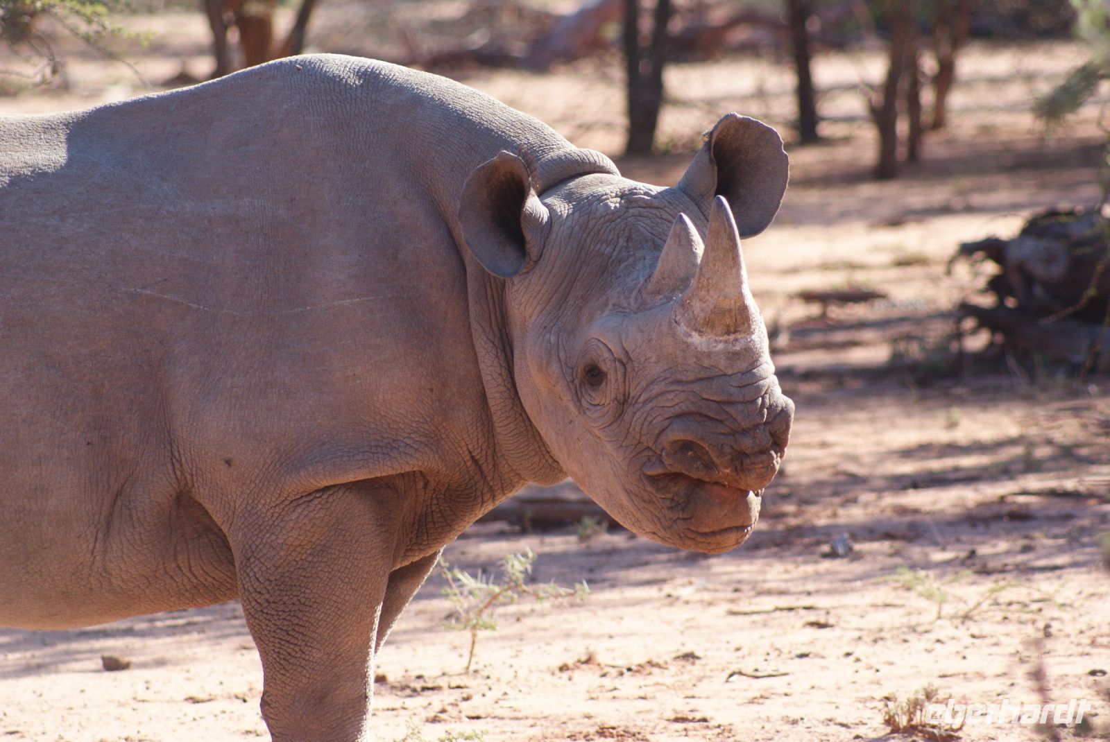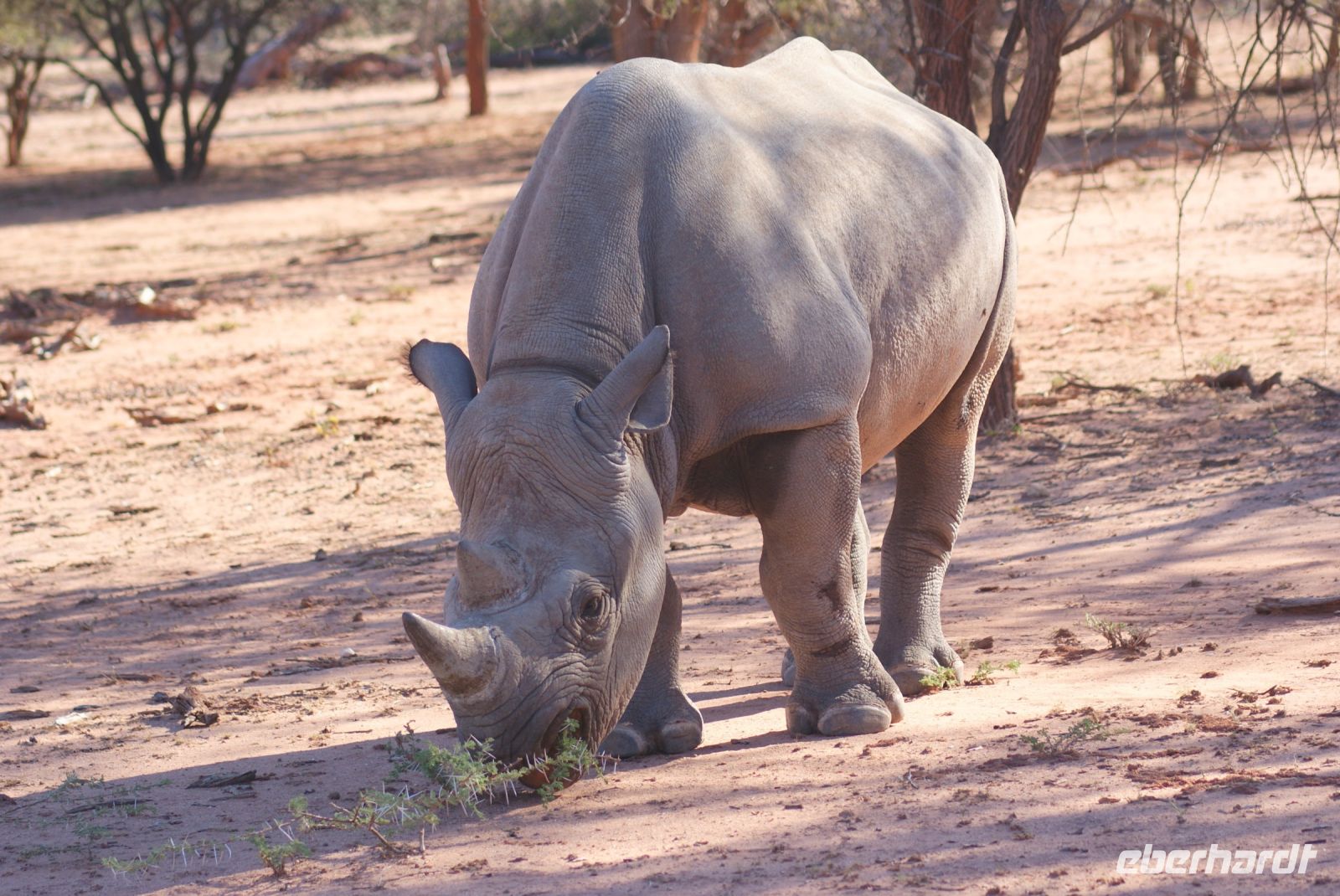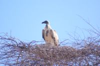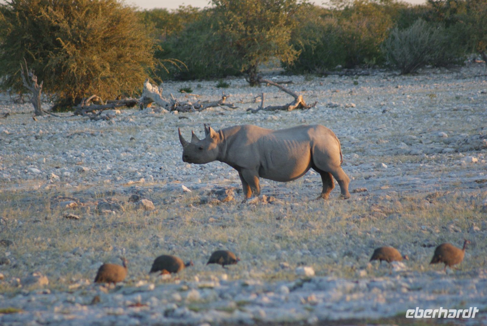 Erneut genießen wir das tolle Frühstück und verlassen erneut zeitig die Anlage und sind wieder eine der ersten im Etosha Nationalpark. Werden wir heute wohl die Big Five sehen? Diese sind ja bekanntlich Elefant, Nashorn, Löwe, Leopard und Büffel, wobei letztere aus dem Park ausgesiedelt wurden, somit hier nur noch Big Four möglich sind. Zunächst aber genießen wir den herrlichen Sonnenaufgang. Schon kurz nach Eintritt in den Park begegnen uns zwei Spitzmaulnashörner, eins sogar mit Kalb. Danach haben wir leider nicht so viel Glück mit den Tiersichtungen, diese scheinen sich ein wenig gegen uns verschworen zu haben. So manche der Tiere vom Vortrag zeigen sich auch heute, dazu noch der Weißbürzelsinghabicht und die wunderschöne Grau-und auch Gabelracke. Am Vormittag halten wir zu einem Toilettenstopp, nachdem unser Fahrzeug bedauerlicherweise nicht mehr anspringt. Mit vereinten Kräften und vielen fleißigen Helfern gelingt es uns, unseren Truck wieder zu starten und die Reise fortzuführen. Zu einem Mittagsstopp halten wir an der Etosha Pfanne und Guide Maria hat einen tollen Mittagssnack für uns vorbereitet. So speisen wir an einem lauschigen Plätzchen und genießen namibianische Köstlichkeiten. Nachmittags hoppeln wir über die sehr schlechte Hauptstraße entlang der Etosha Pfanne Richtung Osten. Hier wurden am Vormittag und Vortag viele Tiere gesichtet, die uns jedoch leider ebenfalls verborgen blieben. So sehen wir nur wenige Tiere, darunter auch Oryxantilopen, Gnus, etc. In Namutoni, welches das älteste Restcamp im Etosha NP ist und einst eine Festung der deutschen Schutztruppe war, stoppen wir nochmals und vertreten uns ein wenig die Beine. 150 Km sind wir nun durch den Etosha Nationalpark gefahren und verlassen diesen über das Lindquist Gate. Am frühen Abend erreichen wir die Minenstadt Tsumeb mit ca. 19.000 Einwohner. Ein netter Empfang durch das Hotelpersonal, noch kurz frisch machen und bald sitzen wir gemeinsam bei deftig, deutscher Hausmannskost zusammen und lassen nochmals den Tag Revue passieren.
