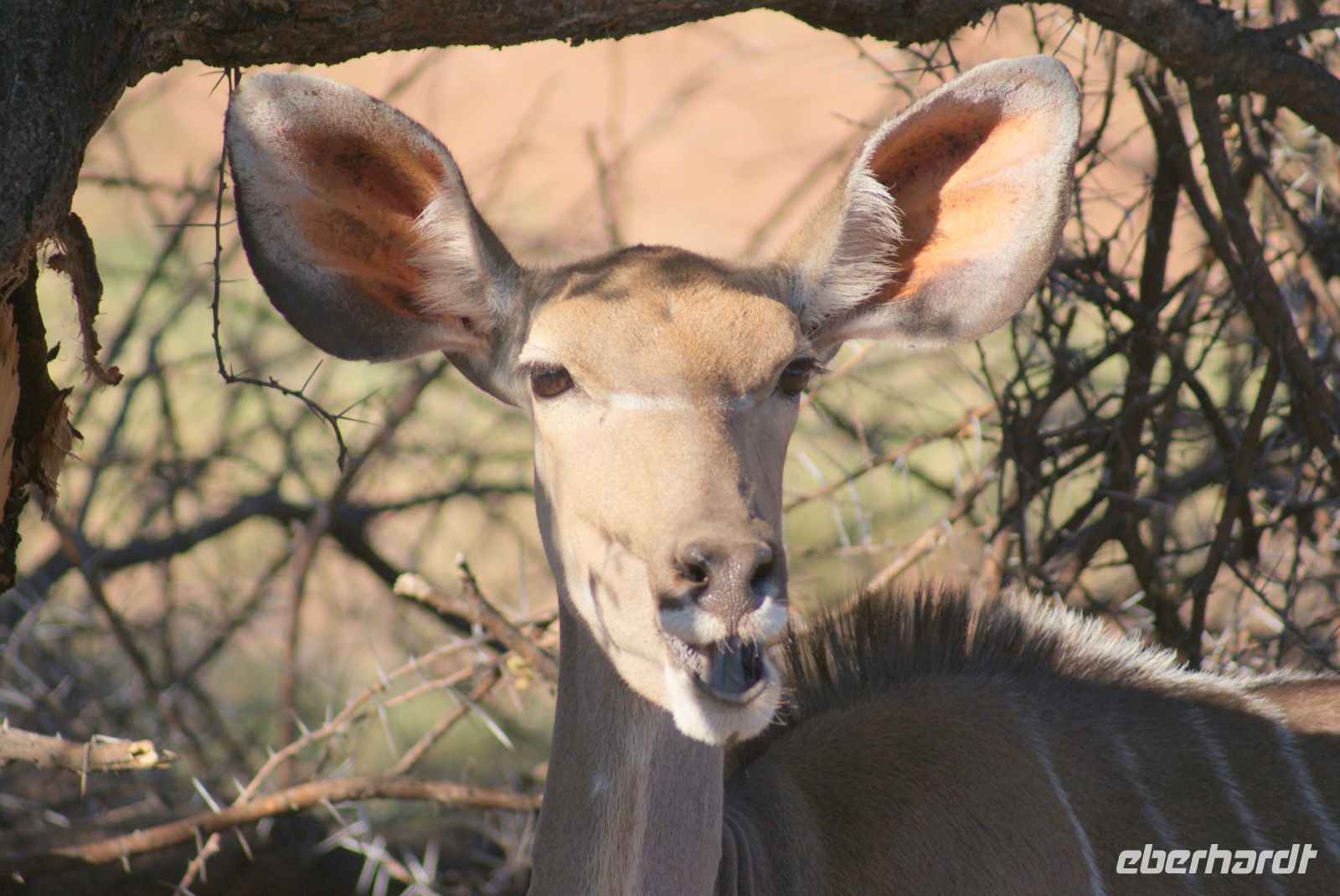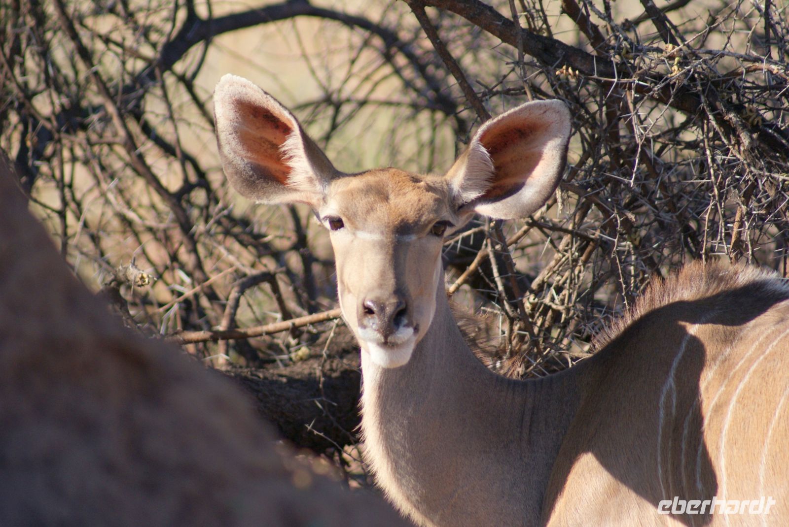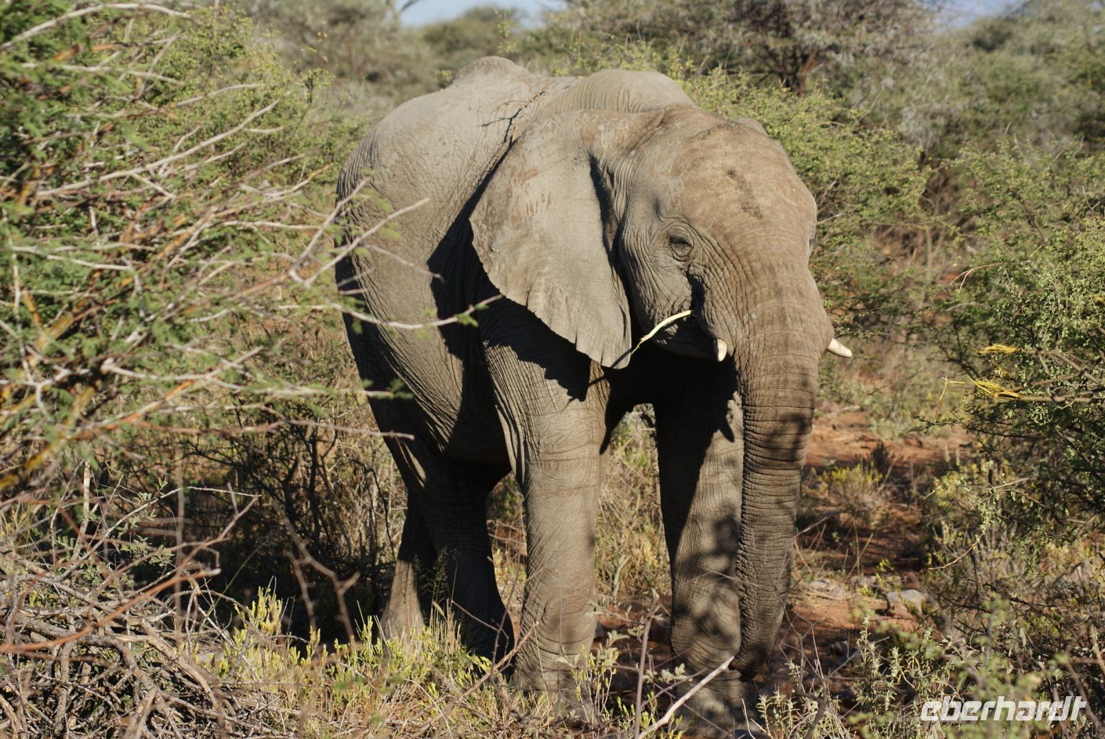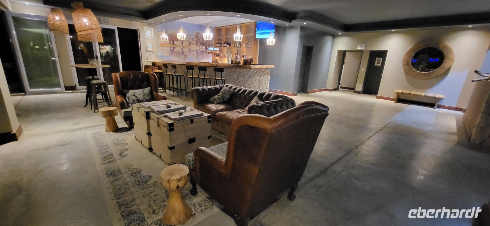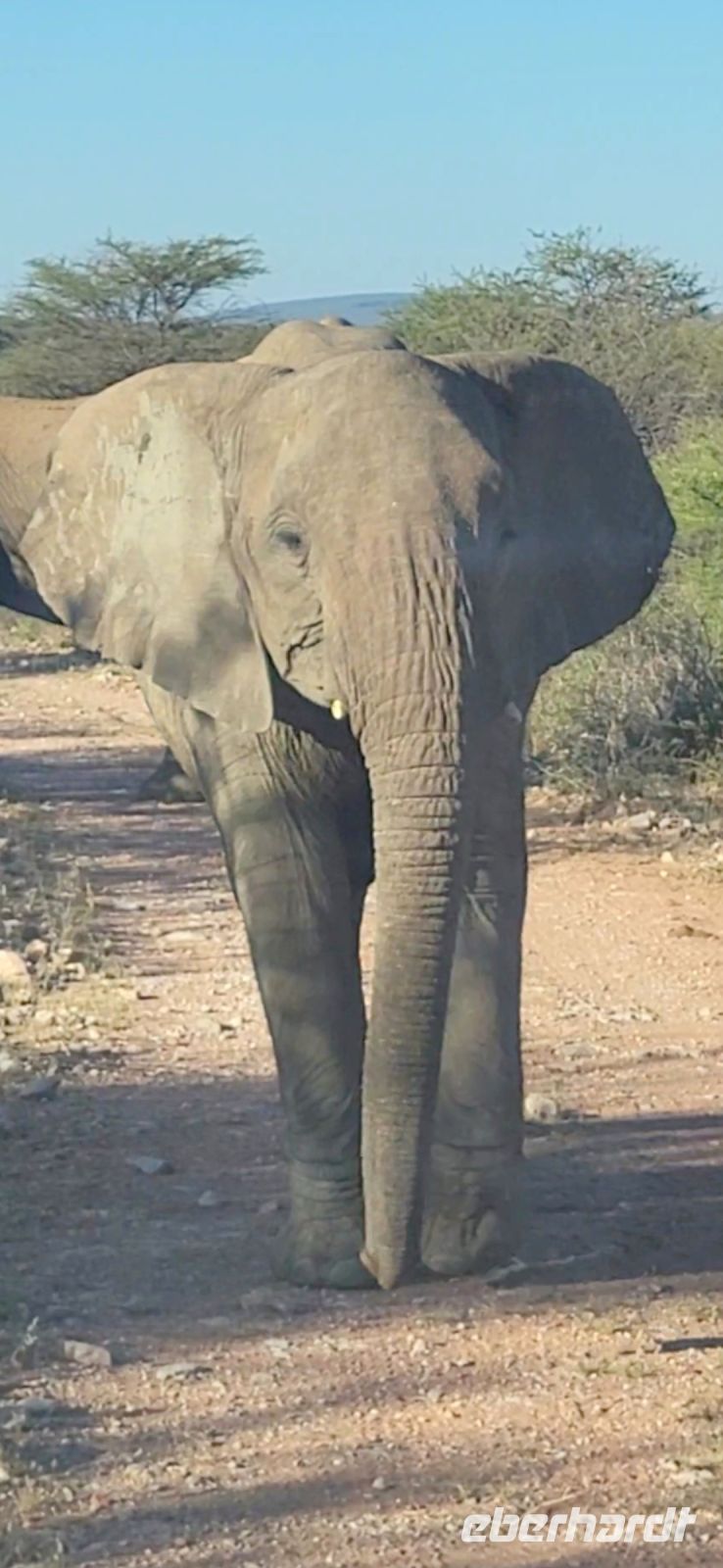 Nach einem ruhigen Flug haben wir es am frühen Morgen endlich geschafft und wir landen auf 1655 m Höhe. Noch schnell die Einreiseprozedur hinter uns bringen und schon nimmt uns unser Driverguide Maria Wittreich herzlich in Empfang. Es sind noch ca. 45 Km, bis wir die Hauptstadt Namibias erreichen und bereits unterwegs erste Eindrücke sammeln. Herrliches Wetter, keine Wolke am Himmel, noch milde Temperaturen. So machen wir uns mit unserem Reisegefährt vertraut, ein umgebauter LKW, der uns als Safaritruck gute Dienste leisten wird. Wir parken an der wunderschönen alten Christuskirche und spazieren von dort aus zu Fuß zum Unabhängigkeitsmuseum (seiner Form wegen auch Kaffeemaschine genannt), weiter zur Alten Feste bis hin zum Tintenpalast. Diese Bauten aus vergangenen Zeiten, sind noch erstaunlich gut erhalten, wenn auch so manchem nicht mehr viel Beachtung widerfährt. Weiter geht es zum mit dem Sparmarkt um uns mit einheimischen Produkten wie Adapter, Mückenpräparaten und einem kleinen Mittagssnack zu versorgen. Wir setzen die Reise fort, um unser Tagesziel, die wunderschöne Mount Etjo Lodge 290 Km weiter zu erreichen. Hier angekommen, machen wir uns kurz frisch und schon steht unsere erste Pirschfahrt zum Sundowner bevor. 2 Safari Guides mit offenen Fahrzeugen führen uns über das Gelände und wir staunen nicht schlecht, was wir am ersten Nachmittag bereits zu sehen bekommen. So kreuzen Impalas, Springböcke, Dik Diks, Giraffen, Frankoline, Riesentrappen, Weißrückengeier sowie Waffenkibitze und weitere unseren Weg und wir genießen die herrliche Stimmung. Etliche Elefanten stehen im Gebüsch oder nah am Wegesrand. Ein junger Bulle will es genau wissen, kommt ganz nah und ertastet mit seinem Rüssel unsere Motorhaube, um herauszufinden, was diese komische Blechbüchse von ihm will-ein besonderer Moment für uns alle. Kurz vor Sonnenuntergang finden wir uns an einem See ein, wo schon einige kalte Getränke auf uns warten . Wir genießen den Ausblick und Augenblick in vollen Zügen. Zurück im Hotel erfolgt ein sehr schmackhaftes Abendessen in der Rundhütte, auch Boma genannt, wo wir am reichhaltigen Buffet bereits erste Wildspezialitäten, aber auch viele andere Köstlichkeiten genießen können.