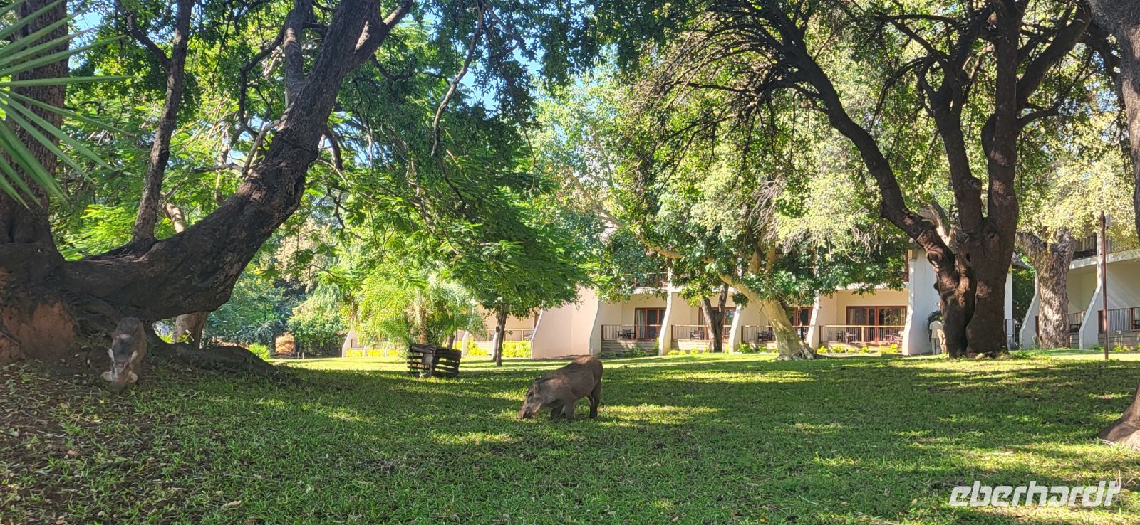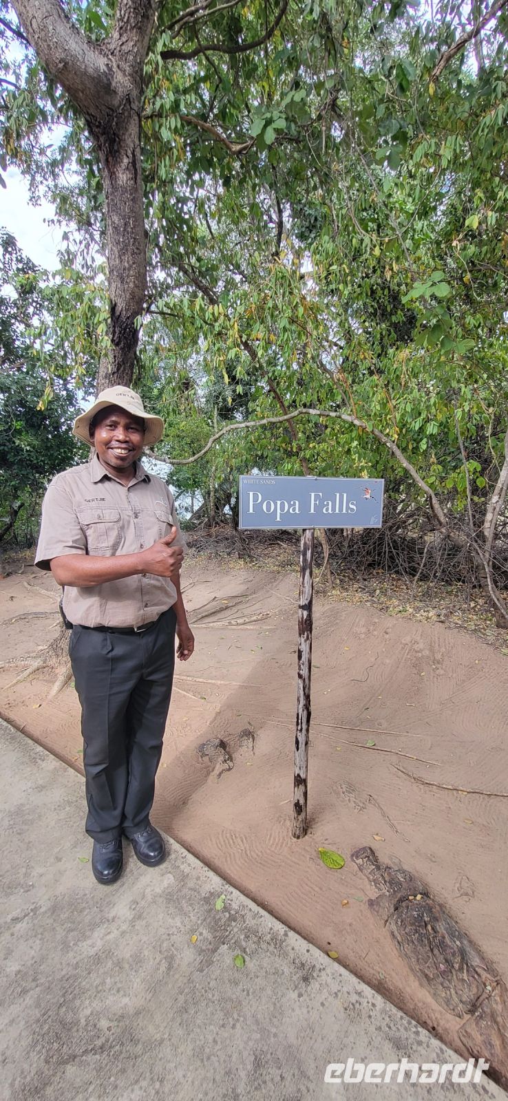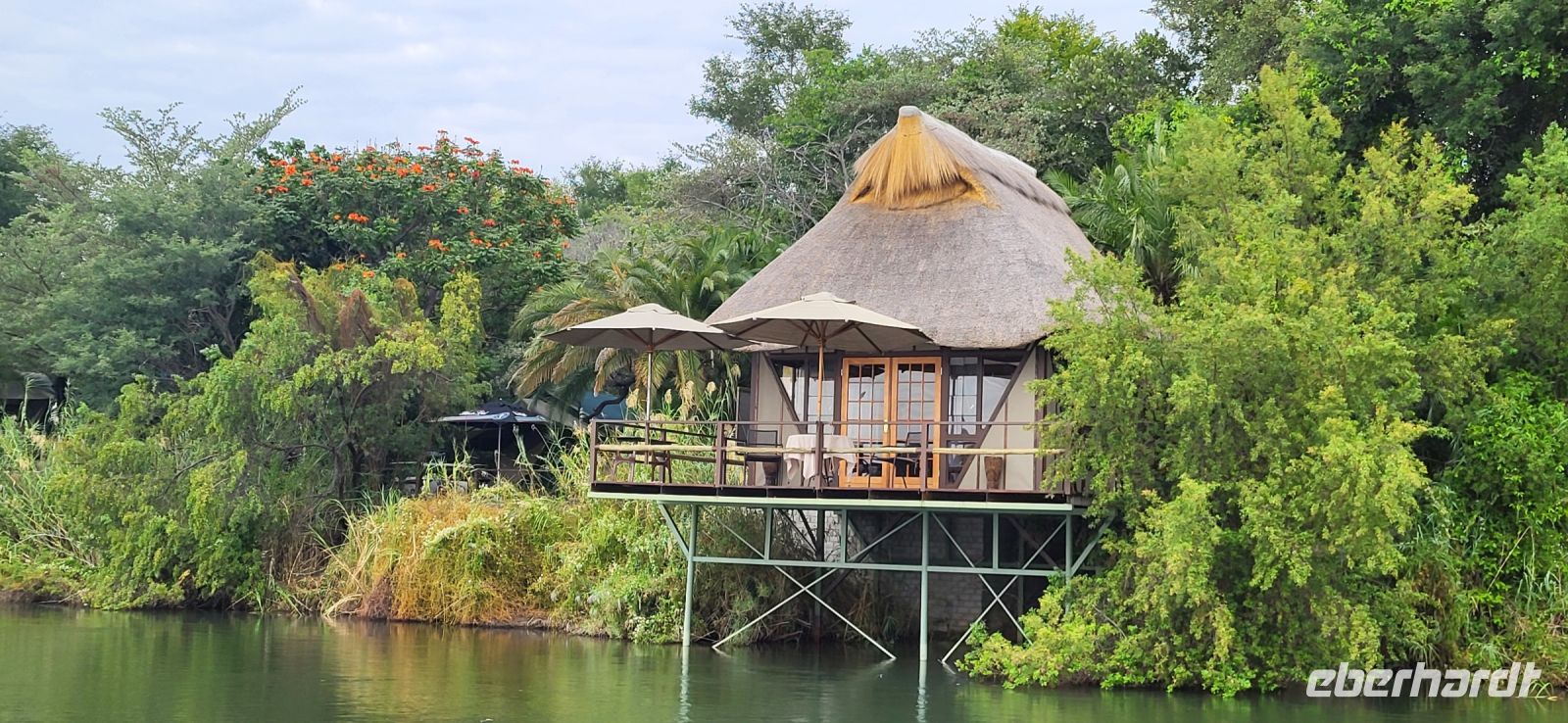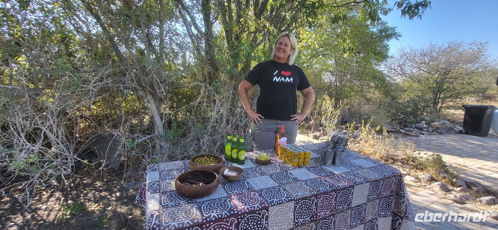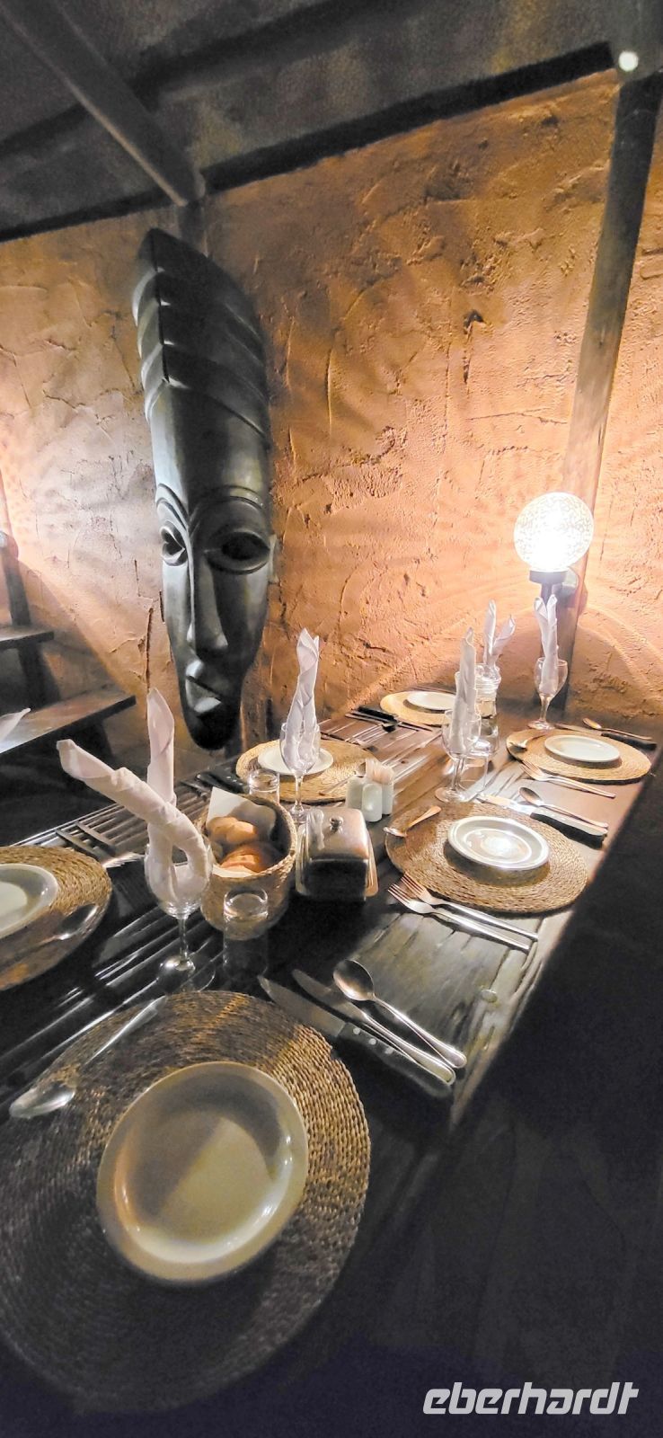 Nach einem sehr reichhaltigen Frühstück verlassen wir die Minenstadt Tsumeb, die noch verschlafen vor uns liegt. Schöne Gebäude und Kirchen aus vergangener, deutscher Zeit halten für uns schöne Eindrücke bereit. Tsumeb wird uns als eine sehr gemütliche und schöne Stadt in Erinnerung bleiben. Weiter geht die Reise, wir haben heute eine lange Strecke vor uns. 530 Km gilt es zu bewältigen, über Grootfontein (Große Quelle) geht es nach Rundu und von dort aus nach Divundu, wo in der Nähe gut versteckt unsere nächste, herrliche Unterkunft liegen wird. Hier im Norden Namibias wird es nun für uns so richtig afrikanisch. Wir sehen viele Grundstücke, wo die Menschen noch in Rundhütten leben, sich das Leben auf der Straße abspielt, das Vieh in Eigenregie unseren Weg kreuzt. Als Überraschung für unsere Gäste gibt es heute ein von Eberhardt TRAVEL organisiertes Mittagspicknick. Hierzu nutzen wir den Mururani Campingplatz, wo wir einen sehr idyllischen Ort vorfinden, bei dem wir ein schönes Picknick und dazu kühle Getränke und ein leckeres Bier anbieten können. So genießen wir die Köstlichkeiten in netter Runde und die Auszeit unserer heutigen Fahrstrecke. Bei den lokalen Holzschnitzern erfolgt ein Zwischenstopp und so manch kleines Hippo oder Elefant wechselt heute den Besitzer. Am späten Nachmittag erreichen wir die am Okavango sehr idyllisch gelegene Ndhovu Safari Lodge und werden vom aus Deutschland ausgewanderten Ralf herzlich in unserer Landessprache willkommen geheißen! Dieser weist uns in die Besonderheiten der Anlage und unserer Luxuszelte ein und wir freuen uns bereits auf unser heutiges, afrikanisches Abendessen. Dieses genießen wir im Restaurant direkt am Okavango Fluss, untermalt vom Rufen so manches Flusspferdes.