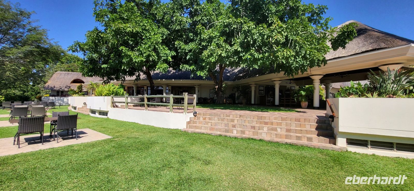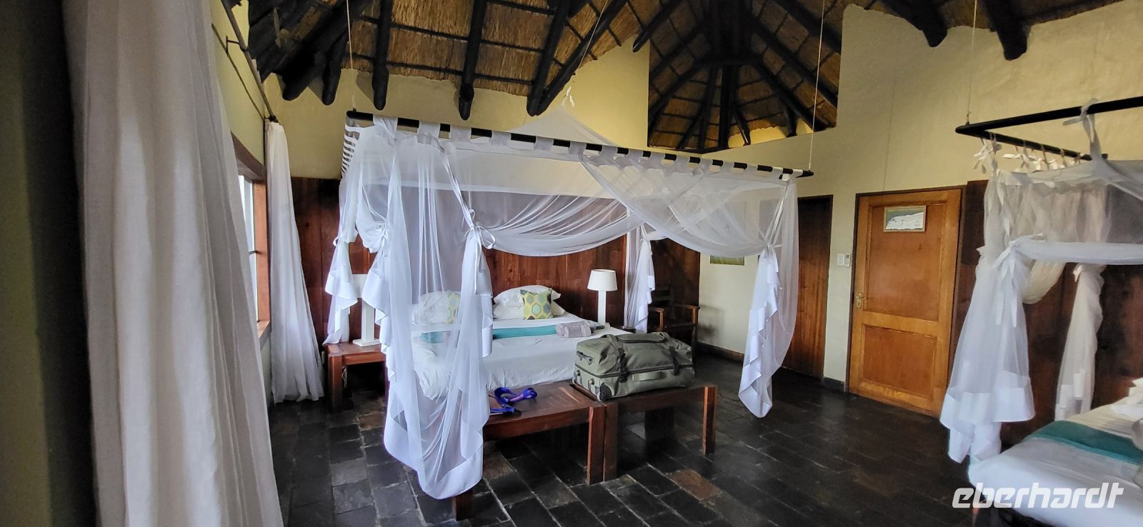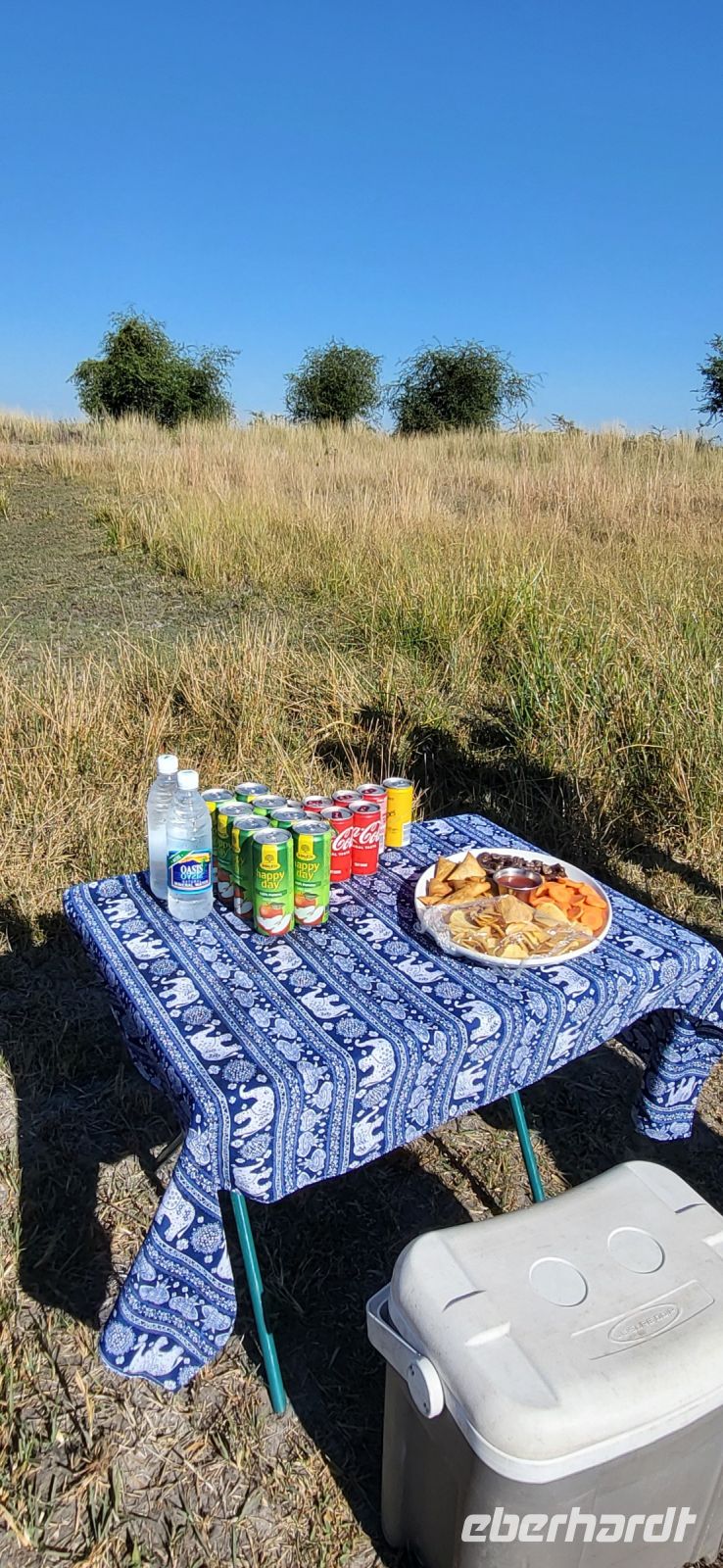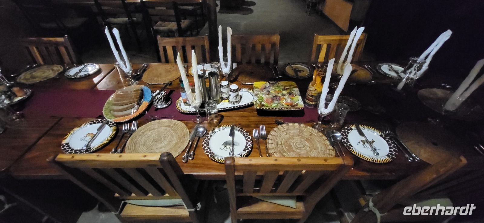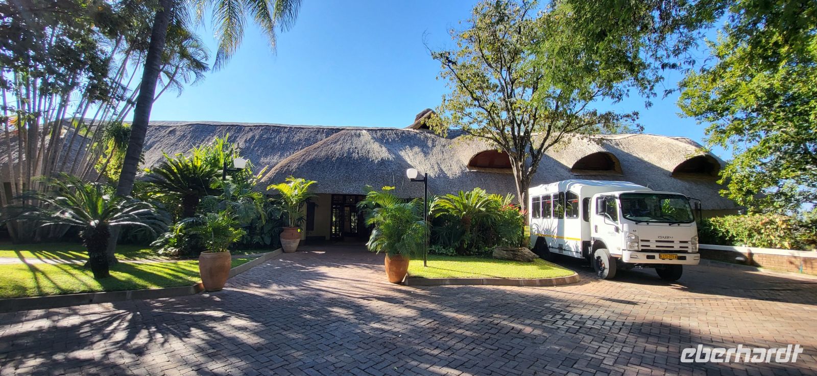 Nach einem sehr reichhaltigen Frühstück verlassen wir die Minenstadt Tsumeb, die noch verschlafen vor uns liegt. Schöne Gebäude und Kirchen aus vergangener, deutscher Zeit halten für uns schöne Eindrücke bereit. Tsumeb wird uns als eine sehr gemütliche und schöne Stadt in Erinnerung bleiben. Weiter geht die Reise, wir haben heute eine lange Strecke vor uns. 530 Km gilt es zu bewältigen, über Grootfontein (Große Quelle) geht es nach Rundu und von dort aus nach Divundu, wo in der Nähe gut versteckt unsere nächste, herrliche Unterkunft liegen wird. Hier im Norden Namibias wird es nun für uns so richtig afrikanisch. Wir sehen viele Grundstücke, wo die Menschen noch in Rundhütten leben, sich das Leben auf der Straße abspielt, das Vieh in Eigenregie unseren Weg kreuzt. Als Überraschung für unsere Gäste gibt es heute ein von Eberhardt TRAVEL organisiertes Mittagspicknick. Hierzu nutzen wir den Mururani Campingplatz, wo wir einen sehr idyllischen Ort vorfinden, bei dem wir ein schönes Picknick und dazu kühle Getränke und ein leckeres Bier anbieten können. So genießen wir die Köstlichkeiten in netter Runde und die Auszeit unserer heutigen Fahrstrecke. Bei den lokalen Holzschnitzern erfolgt ein Zwischenstopp und so manch kleines Hippo oder Elefant wechselt heute den Besitzer. Am späten Nachmittag erreichen wir die am Okavango sehr idyllisch gelegene Ndhovu Safari Lodge und werden vom aus Deutschland ausgewanderten Ralf herzlich in unserer Landessprache willkommen geheißen! Dieser weist uns in die Besonderheiten der Anlage und unserer Luxuszelte ein und wir freuen uns bereits auf unser heutiges, afrikanisches Abendessen. Dieses genießen wir im Restaurant direkt am Okavango Fluss, untermalt vom Rufen so manches Flusspferdes.