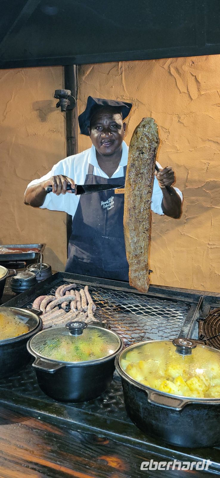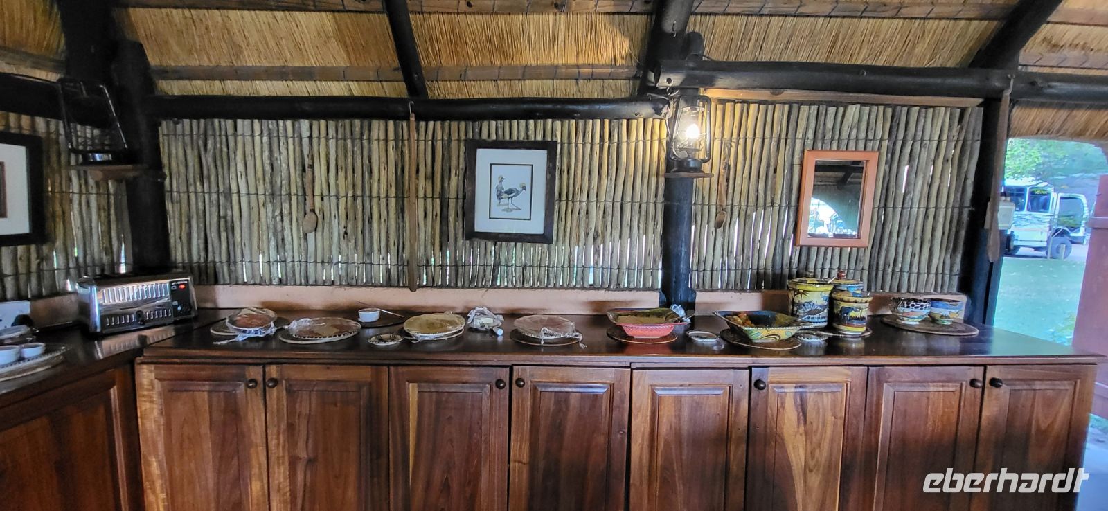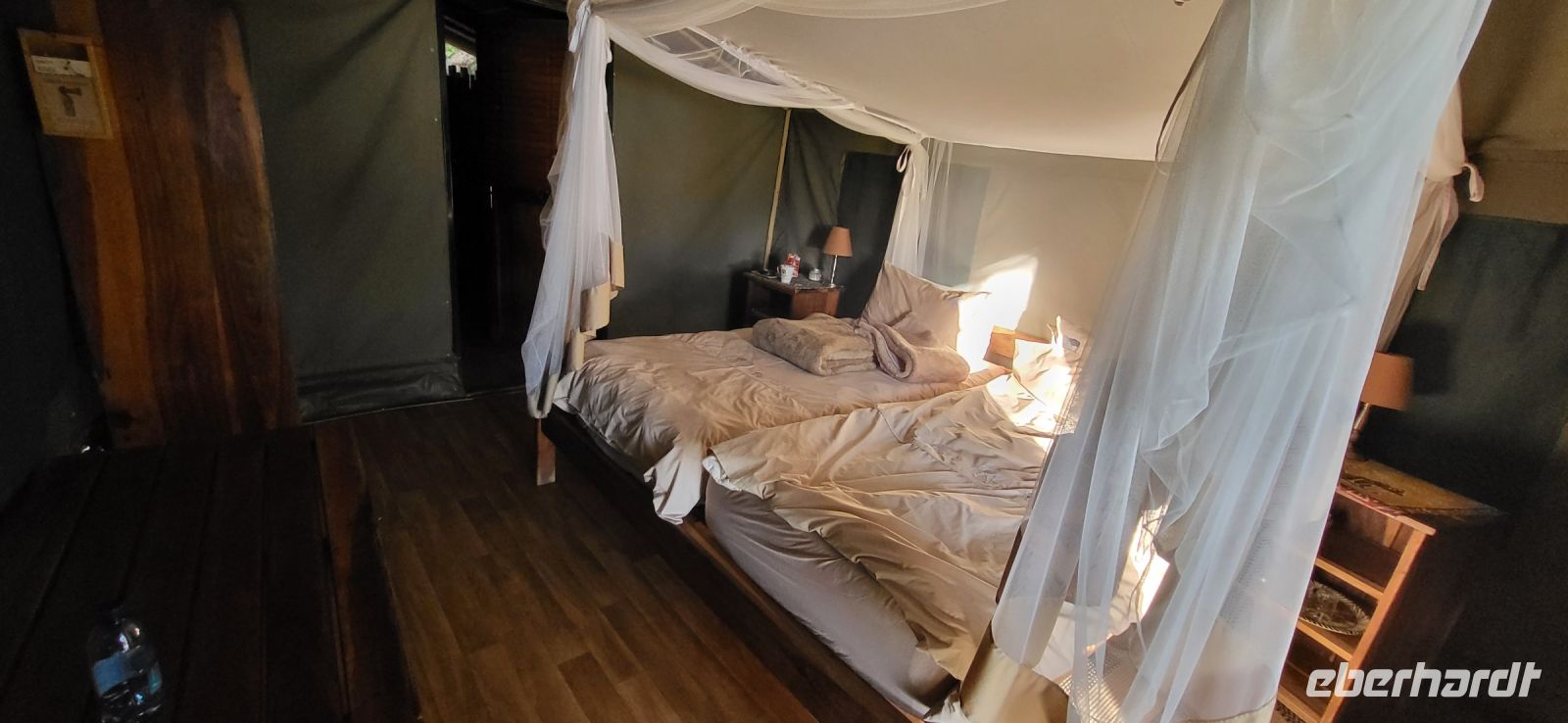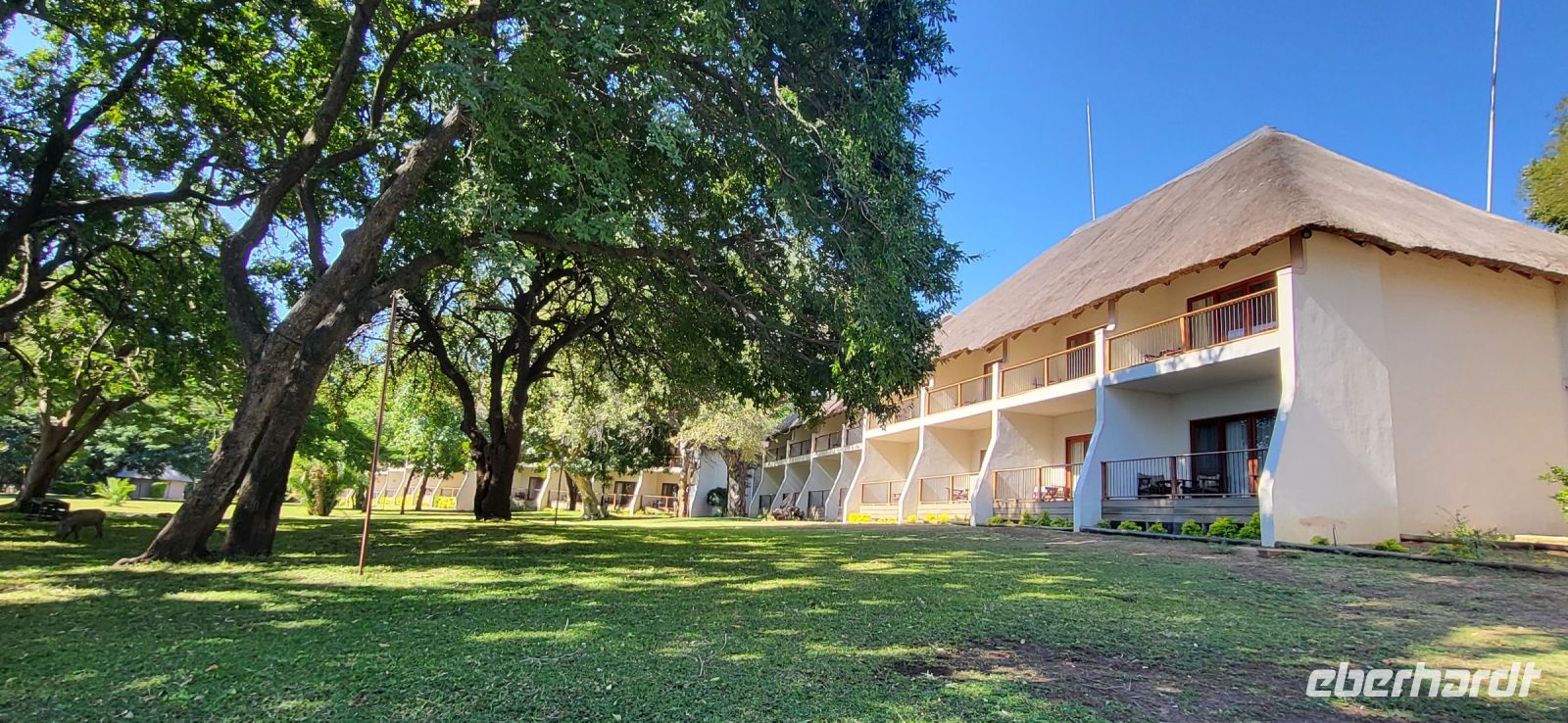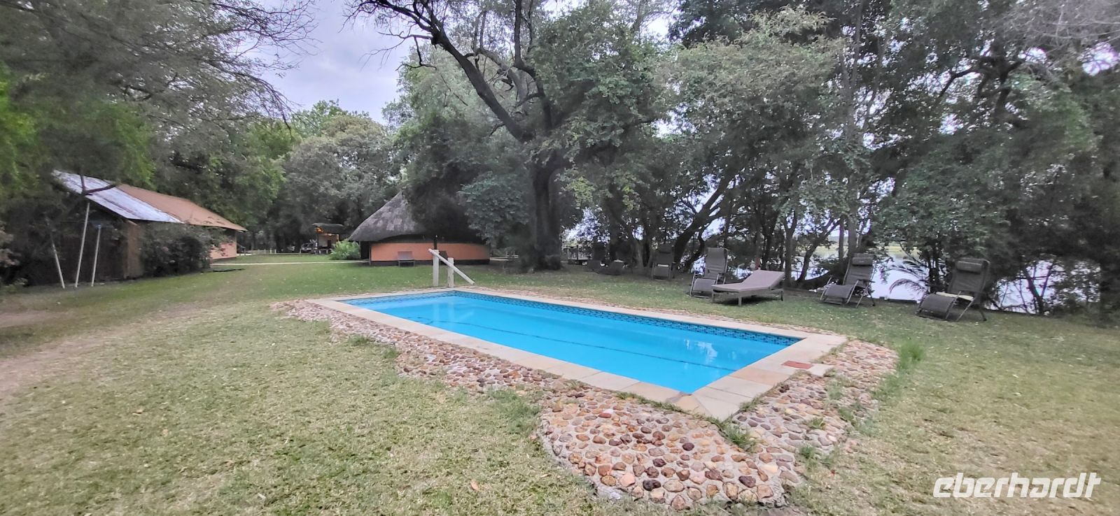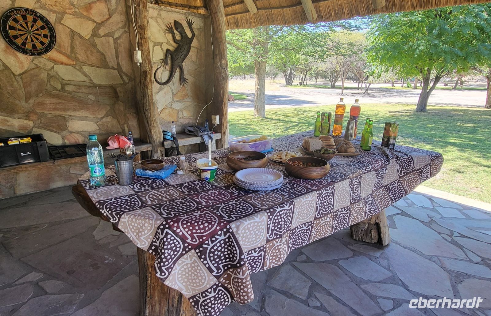 Nach einem sehr reichhaltigen Frühstück verlassen wir die Minenstadt Tsumeb, die noch verschlafen vor uns liegt. Schöne Gebäude und Kirchen aus vergangener, deutscher Zeit halten für uns schöne Eindrücke bereit. Tsumeb wird uns als eine sehr gemütliche und schöne Stadt in Erinnerung bleiben. Weiter geht die Reise, wir haben heute eine lange Strecke vor uns. 530 Km gilt es zu bewältigen, über Grootfontein (Große Quelle) geht es nach Rundu und von dort aus nach Divundu, wo in der Nähe gut versteckt unsere nächste, herrliche Unterkunft liegen wird. Hier im Norden Namibias wird es nun für uns so richtig afrikanisch. Wir sehen viele Grundstücke, wo die Menschen noch in Rundhütten leben, sich das Leben auf der Straße abspielt, das Vieh in Eigenregie unseren Weg kreuzt. Als Überraschung für unsere Gäste gibt es heute ein von Eberhardt TRAVEL organisiertes Mittagspicknick. Hierzu nutzen wir den Mururani Campingplatz, wo wir einen sehr idyllischen Ort vorfinden, bei dem wir ein schönes Picknick und dazu kühle Getränke und ein leckeres Bier anbieten können. So genießen wir die Köstlichkeiten in netter Runde und die Auszeit unserer heutigen Fahrstrecke. Bei den lokalen Holzschnitzern erfolgt ein Zwischenstopp und so manch kleines Hippo oder Elefant wechselt heute den Besitzer. Am späten Nachmittag erreichen wir die am Okavango sehr idyllisch gelegene Ndhovu Safari Lodge und werden vom aus Deutschland ausgewanderten Ralf herzlich in unserer Landessprache willkommen geheißen! Dieser weist uns in die Besonderheiten der Anlage und unserer Luxuszelte ein und wir freuen uns bereits auf unser heutiges, afrikanisches Abendessen. Dieses genießen wir im Restaurant direkt am Okavango Fluss, untermalt vom Rufen so manches Flusspferdes.
