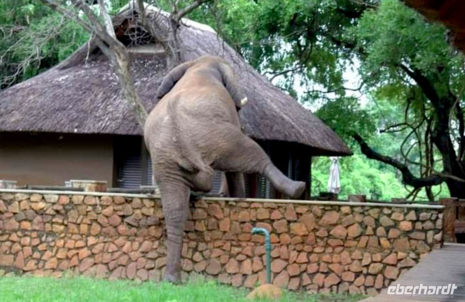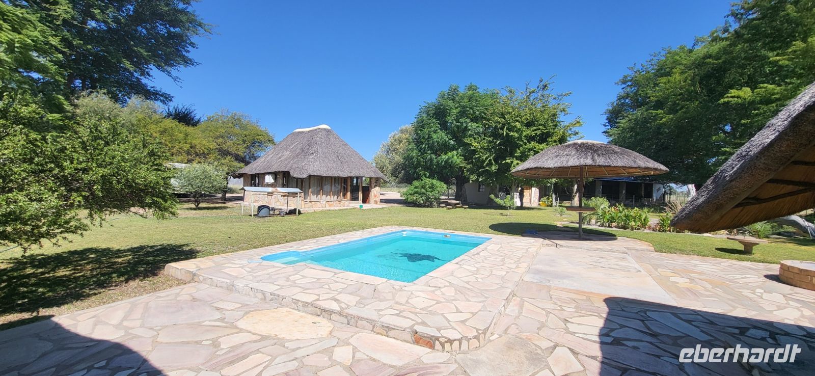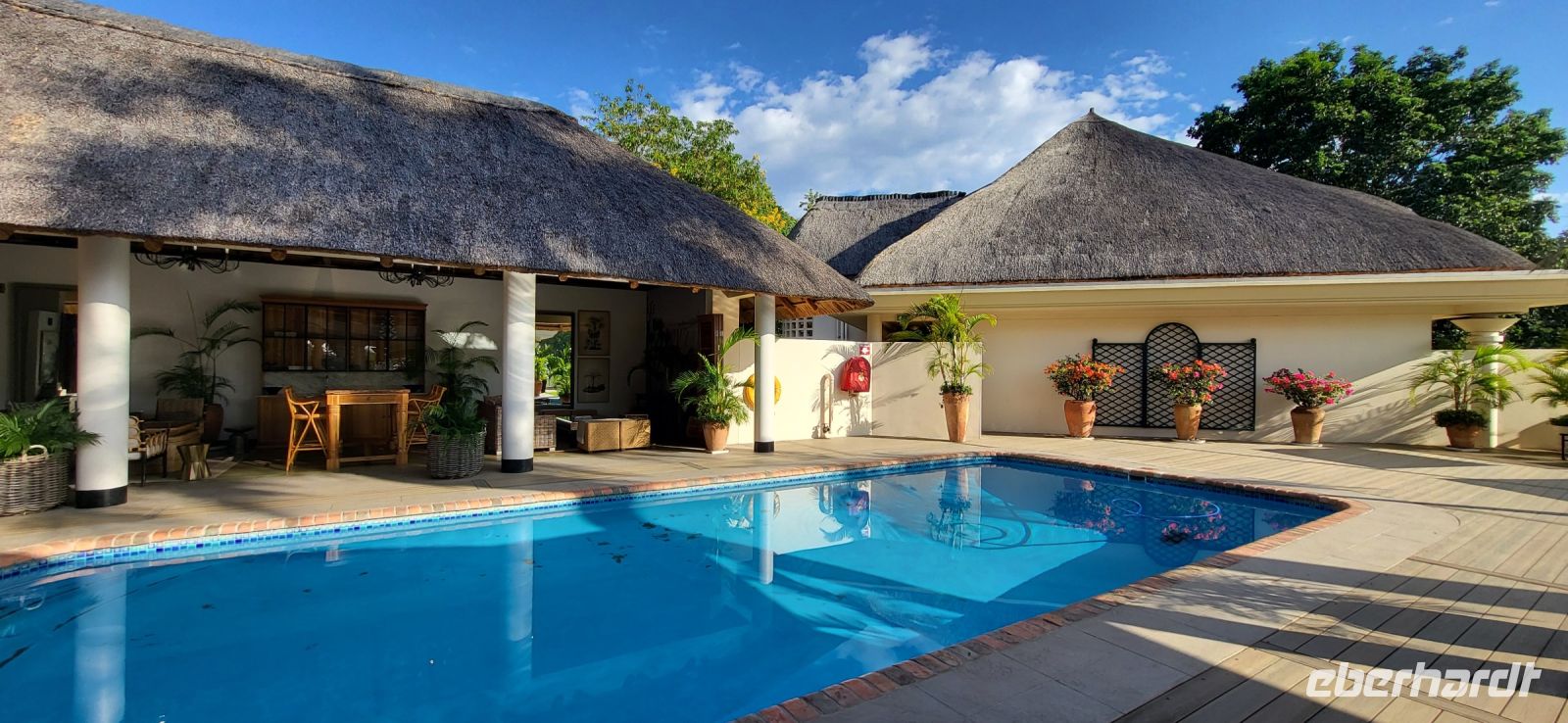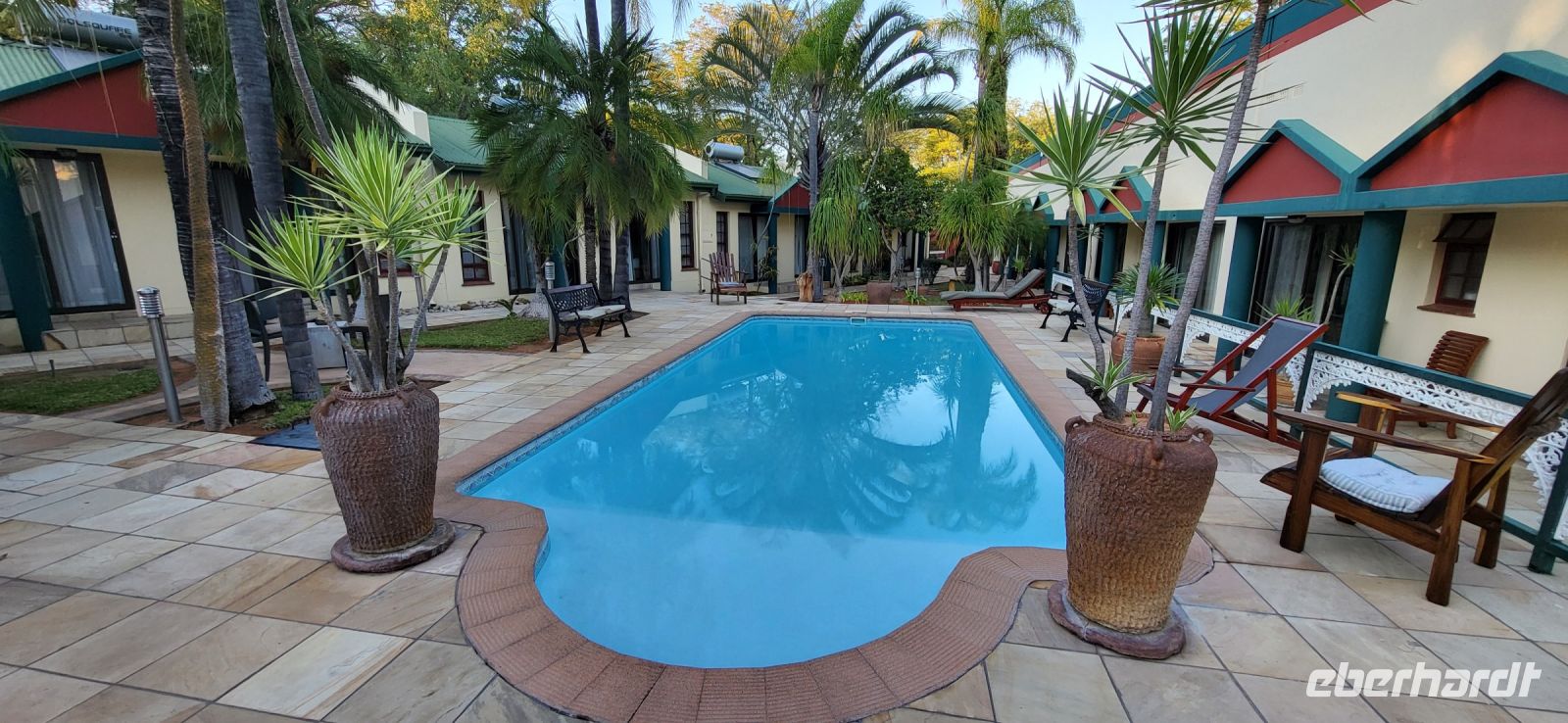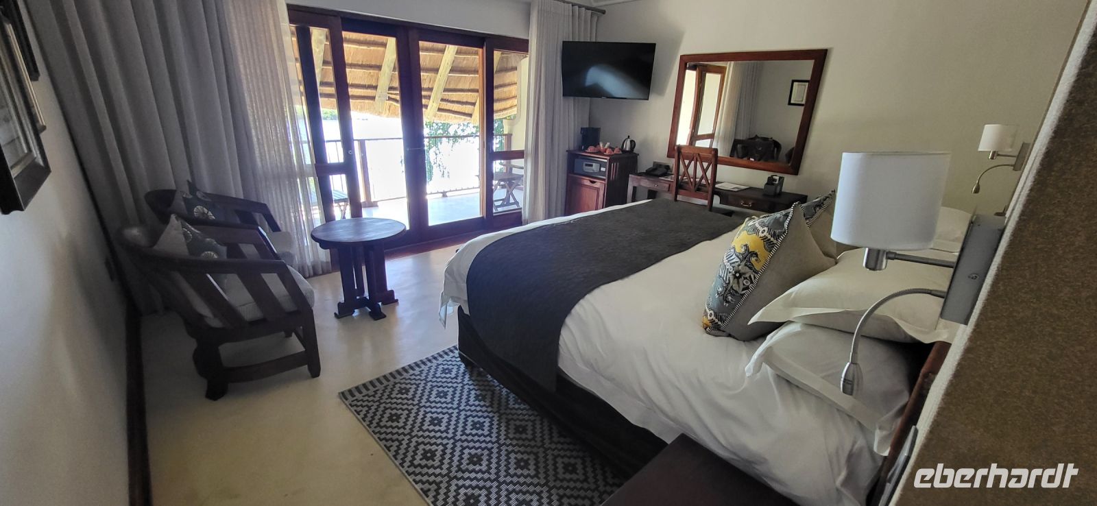Nach einem sehr reichhaltigen Frühstück verlassen wir die Minenstadt Tsumeb, die noch verschlafen vor uns liegt. Schöne Gebäude und Kirchen aus vergangener, deutscher Zeit halten für uns schöne Eindrücke bereit. Tsumeb wird uns als eine sehr gemütliche und schöne Stadt in Erinnerung bleiben. Weiter geht die Reise, wir haben heute eine lange Strecke vor uns. 530 Km gilt es zu bewältigen, über Grootfontein (Große Quelle) geht es nach Rundu und von dort aus nach Divundu, wo in der Nähe gut versteckt unsere nächste, herrliche Unterkunft liegen wird. Hier im Norden Namibias wird es nun für uns so richtig afrikanisch. Wir sehen viele Grundstücke, wo die Menschen noch in Rundhütten leben, sich das Leben auf der Straße abspielt, das Vieh in Eigenregie unseren Weg kreuzt. Als Überraschung für unsere Gäste gibt es heute ein von Eberhardt TRAVEL organisiertes Mittagspicknick. Hierzu nutzen wir den Mururani Campingplatz, wo wir einen sehr idyllischen Ort vorfinden, bei dem wir ein schönes Picknick und dazu kühle Getränke und ein leckeres Bier anbieten können. So genießen wir die Köstlichkeiten in netter Runde und die Auszeit unserer heutigen Fahrstrecke. Bei den lokalen Holzschnitzern erfolgt ein Zwischenstopp und so manch kleines Hippo oder Elefant wechselt heute den Besitzer. Am späten Nachmittag erreichen wir die am Okavango sehr idyllisch gelegene Ndhovu Safari Lodge und werden vom aus Deutschland ausgewanderten Ralf herzlich in unserer Landessprache willkommen geheißen! Dieser weist uns in die Besonderheiten der Anlage und unserer Luxuszelte ein und wir freuen uns bereits auf unser heutiges, afrikanisches Abendessen. Dieses genießen wir im Restaurant direkt am Okavango Fluss, untermalt vom Rufen so manches Flusspferdes.