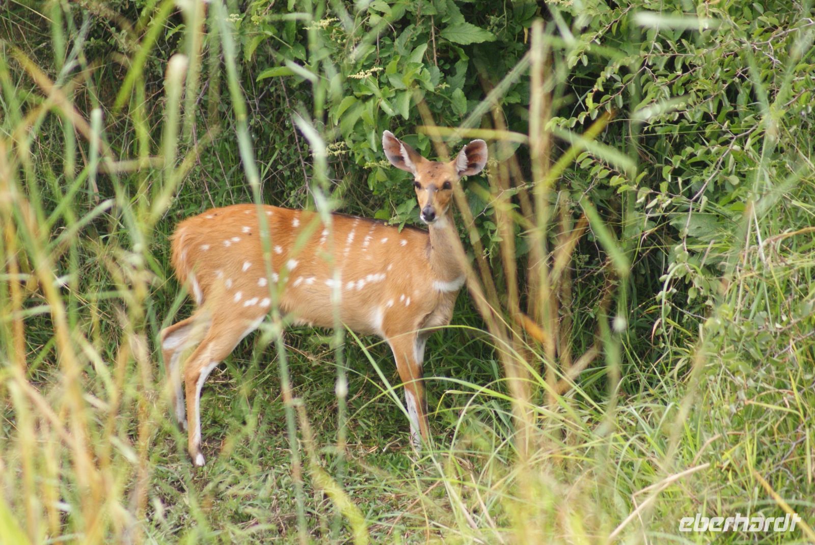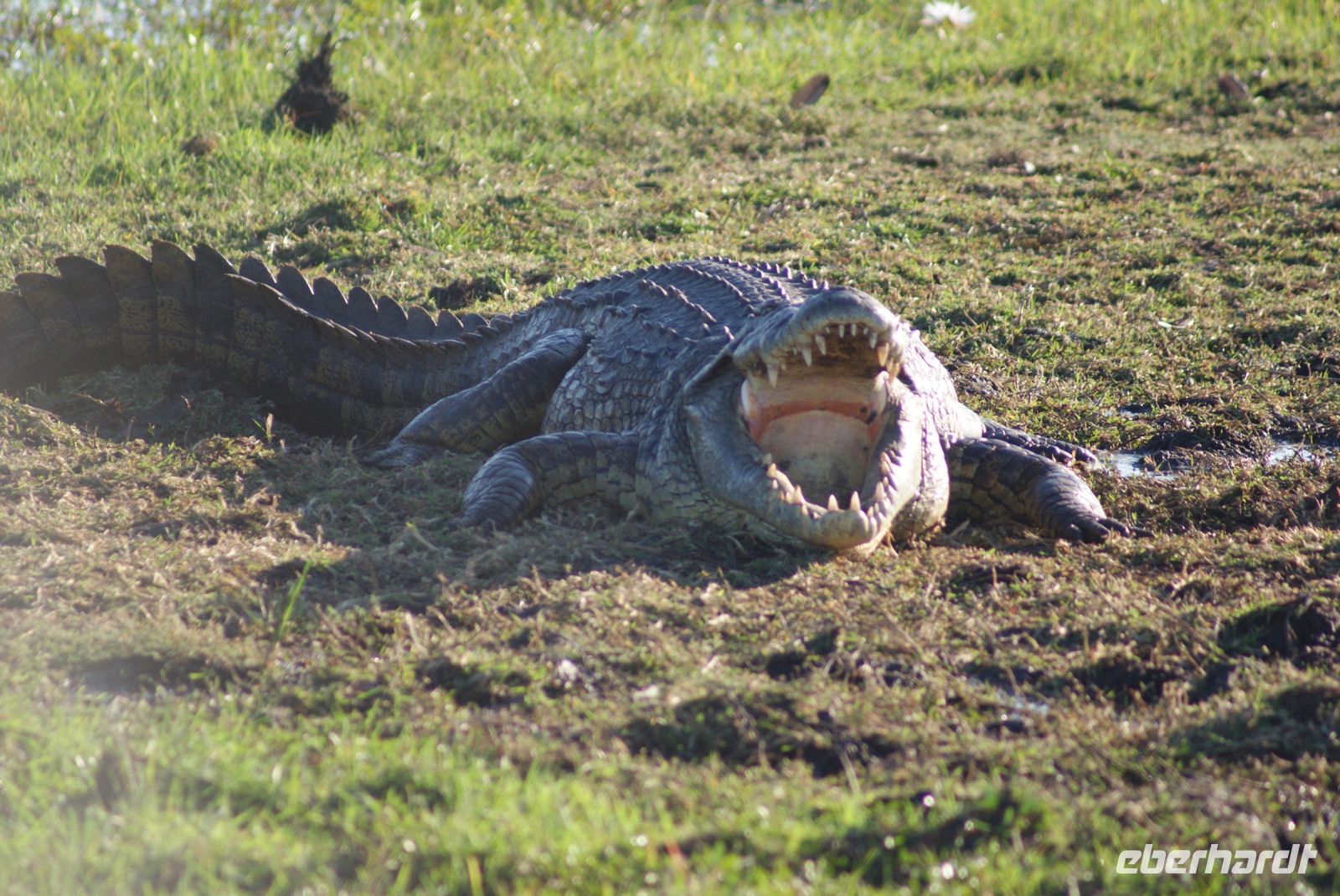 Auf die Hippos in der heutigen Nacht vorbereitet, waren diese eher ruhig, sodass wir gut mit Grillen und Froschklicklauten schlafen konnten. So genießen wir das schmackhafte Buffet, welches für uns bereitsteht und die herrliche Kulisse, die sich uns bietet. Viele Tiere grasen entlang des Flussufers es Buffalo Nationalparks gegenüber und von Lodgebesitzer Ralf steht ein tolles Fernrohr für alle Gäste bereit, damit wir diese noch besser sehen können. Anschließend geht es für uns zunächst mit Bootsführer Michael auf den Okavango, der hier an seiner tiefsten Stelle 3 m misst. Eine herrliche Morgenstimmung erwartet uns, während wir seicht über das Wasser gleiten. Viele schöne Tiersichtungen gilt es zu verzeichnen, darunter Buschböcke, Kudus, Krokodile ganz nah am Ufer. Ein Wasserwaran versucht sich an die Webervogelnester anzuschleichen … Viele interessante Vögel wie Sporngänse, Graulärmvogel, auch „Go away bird“ genannt, Senegalkuckuck, Bienenfresser, Schwalben, Goliathreiher, Kingfisher und den sogenannten Jesusvogel-African Jacana kreuzen unsere Strecke. Mittags kehren wir zurück und haben nach einem kleinen Snack noch etwas Freizeit, um die schöne Atmosphäre hier am Fluss genießen zu können. Nachmittags geht es beinah vollzählig mit unserem Safaritruck in den Mahango/Bwabwata Nationalpark. Hier sehen wir wieder so manche Tiere, wie zahlreiche Warzenschweine, die seltenen Riedböcke, die nur in dieser Region zu sehen sind. Zur späteren Stunde entdecken wir doch noch einige Elefanten im Park, die friedlich grasen oder unseren Weg kreuzen. Wir sind uns einig, es war eine sehr schöne Pirschfahrt durch den afrikanischen Busch. Abends wird für alle Gäste der Lodge wieder ein tolles Abendessen bereitet, jedoch treffen wir uns zum Schluss auf ein kühles Getränk, um gemeinsam auf den schönen und erlebnisreichen Tag anzustoßen. Kurz bevor wir in den Schlaf schlummern, gibt es noch ein wenig Gänsehautfeeling, als sich Elefanten und Löwen ein Scharmützel im gegenüberliegenden Nationalpark lieferten …
