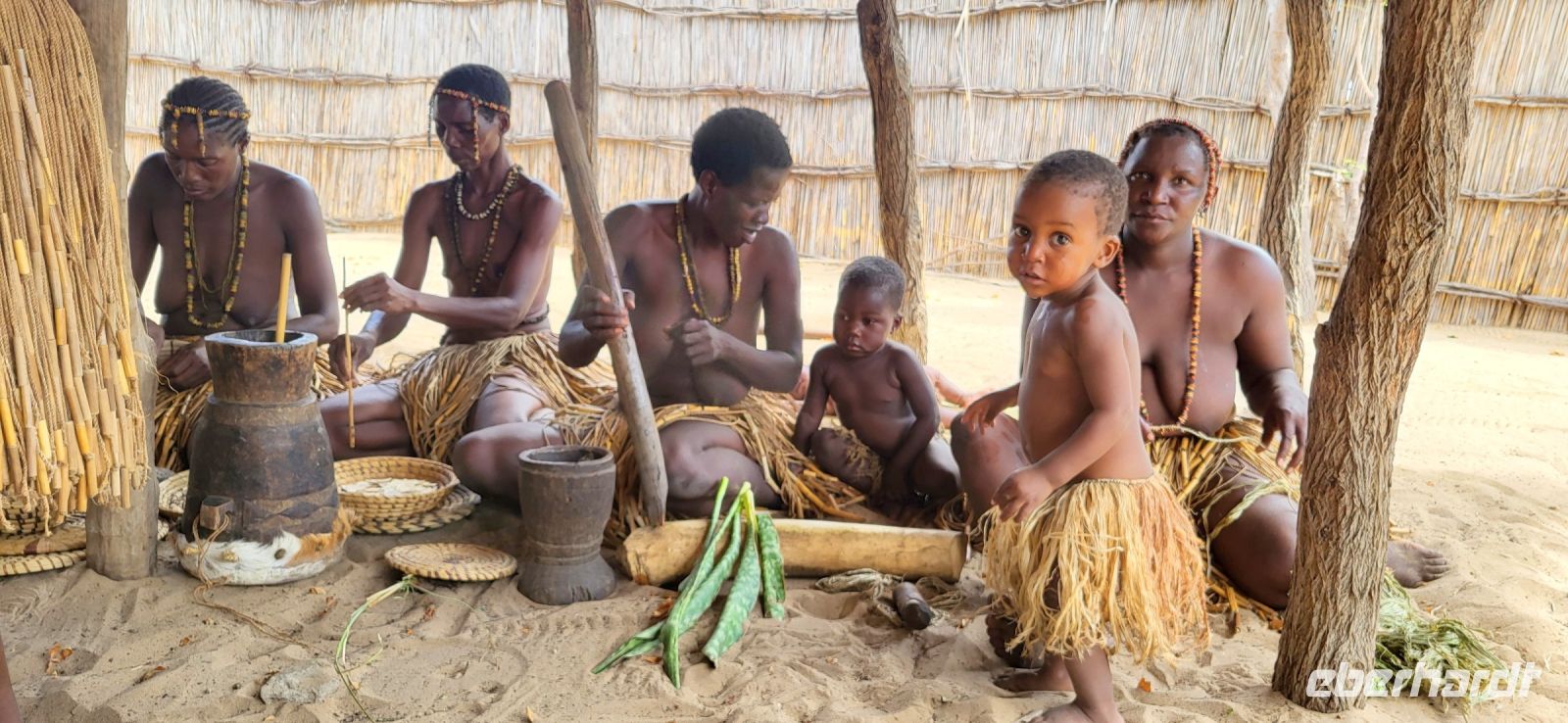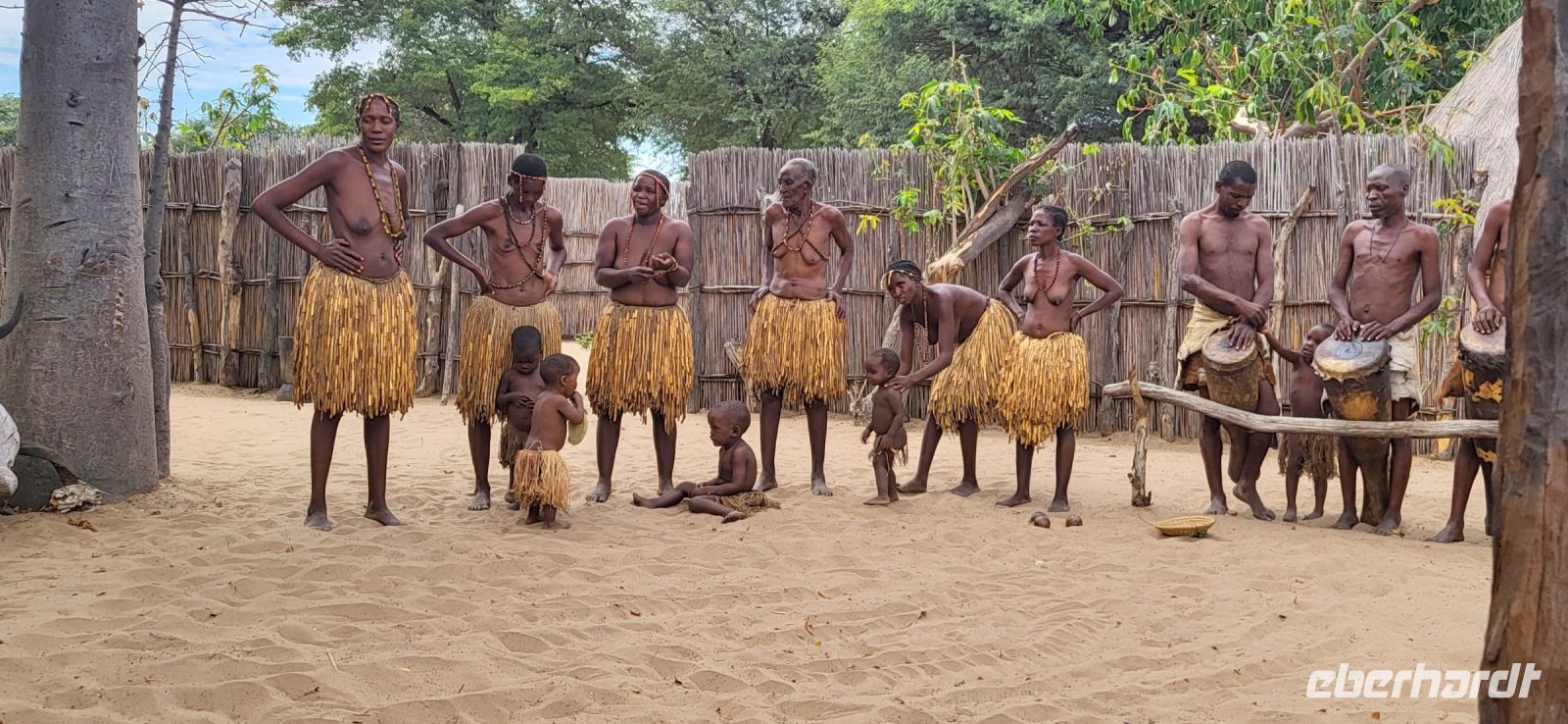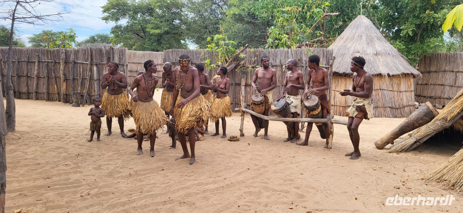 Nach einer doch noch geruhsamen Nacht, einem wunderschönen Sonnenaufgang und einem köstlichen Frühstück mit Blick auf den Fluss, verabschieden wir uns von Lodgebesitzer Ralf und ziehen weiter entlang der Sambesi Region Richtung Osten. Wir durchfahren den Bwabwata Nationalpark und befinden uns nun zwischen zwei Ländern. Zur rechten Seite liegt Botswana, zur linken Seite Angola, wir auf der Transitstraße noch in Namibia. Elefantenwarnschilder weisen darauf hin, dass jederzeit mit den Dickhäutern zu rechnen ist. Heute jedoch ist es ziemlich ruhig auf unserer Strecke, so dass wir gut vorankommen und Maria die Zeit nutzt, um uns viel Wissenswertes über Namibia nahezubringen. So hören wir beispielsweise zum Gesundheitssystem und dazu, dass die gesundheitliche Versorgung für die Bevölkerung beinahe kostenlos ist. Im Rentenalter sieht es weniger rosig aus, die staatliche Rente beläuft sich auf 1000 N$, rund 50 € pro Monat. Am frühen Nachmittag besuchen wir ein sogenanntes „Lebendes Museum“ und die hier ansässige Volksgruppe der Mafwe. In deren Besucherdorf sehen wir, wie auf traditionelle Weise gelebt und gearbeitet wurde. Schöne Gesänge und Tänze werden zum Besten gegeben, man weist uns in die Kunst des Fallenstellens ein und auch Schmiedearbeiten, bei denen Äxte und Spere gefertigt werden, dürfen wir beobachten. Die Mafwe Frauen zeigen uns schöne und mühsame Handarbeiten, aus denen Schmuck und nützliche Küchenutensilien entstehen. Natürlich gilt unser Augenmerk den vielen kleinen Kindern, die uns ebenso mit großen Augen bestaunen. Nachdem wir uns verabschiedet haben, erleben wir ein ungeplantes Abenteuer. Wir haben uns im tiefen Sand vor dem Dorf festgefahren… Viele helfende Hände innerhalb der Gruppe, aber auch anderen Reiseleitern (Danke an Gian-Paolo) und den Mafwe Männern geben ihr Bestes, um uns aus der misslichen Lage zu befreien. Großer Jubel, als dies schließlich auch gelingt. TIA „This is Africa“ Am Nachmittag erreichen die wunderschöne Namushasha Lodge, welche idyllisch am Kwando liegt. Wir genießen die verbleibenden Stunden in unseren komfortablen Unterkünften und lassen die Seele mit Blick auf Fluss und Landschaft dahinter baumeln. Erste Hippos tauschen direkt vor unseren Augen auf, welche wir morgen auf der Bootstour genauer sehen werden. Abends erfolgt ein sehr köstliches Abendessen vom Buffet, welches wir auf der Terrasse der Lodge unter dem Sternenhimmel mehr als zu schätzen wissen.
