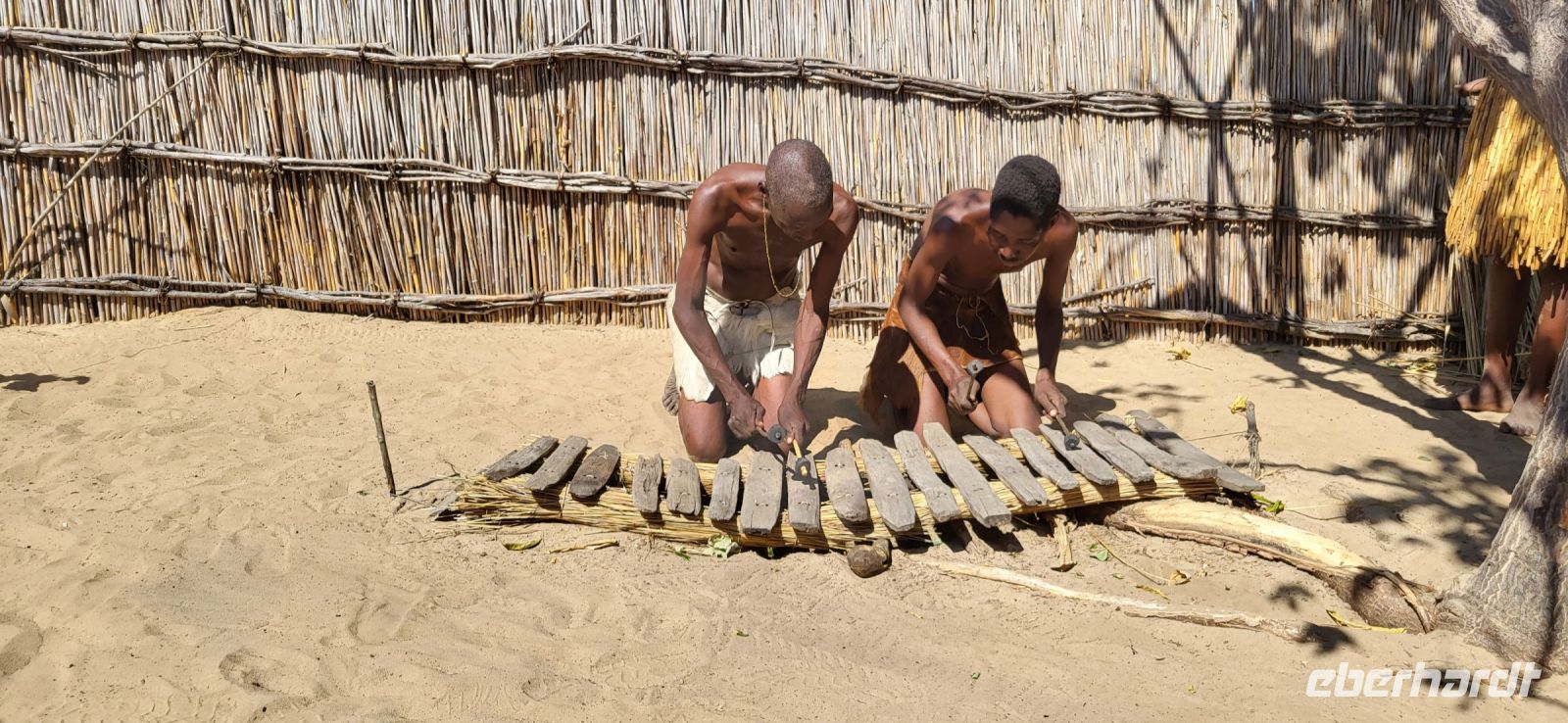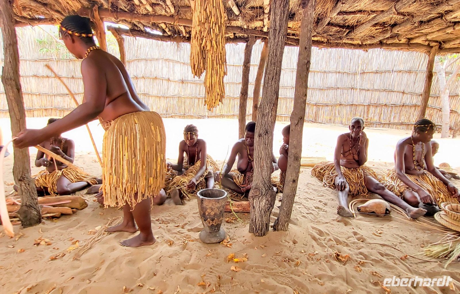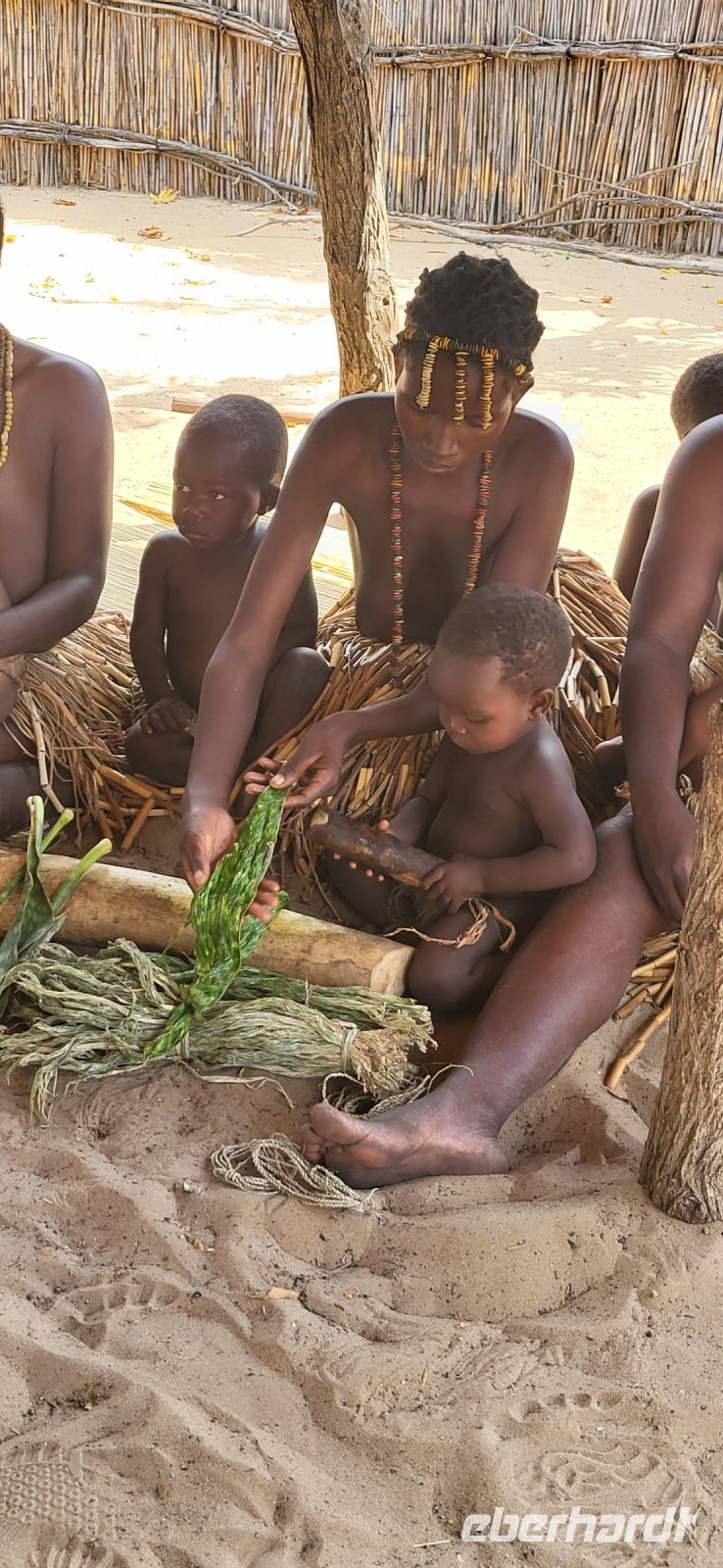 Nach einer doch noch geruhsamen Nacht, einem wunderschönen Sonnenaufgang und einem köstlichen Frühstück mit Blick auf den Fluss, verabschieden wir uns von Lodgebesitzer Ralf und ziehen weiter entlang der Sambesi Region Richtung Osten. Wir durchfahren den Bwabwata Nationalpark und befinden uns nun zwischen zwei Ländern. Zur rechten Seite liegt Botswana, zur linken Seite Angola, wir auf der Transitstraße noch in Namibia. Elefantenwarnschilder weisen darauf hin, dass jederzeit mit den Dickhäutern zu rechnen ist. Heute jedoch ist es ziemlich ruhig auf unserer Strecke, so dass wir gut vorankommen und Maria die Zeit nutzt, um uns viel Wissenswertes über Namibia nahezubringen. So hören wir beispielsweise zum Gesundheitssystem und dazu, dass die gesundheitliche Versorgung für die Bevölkerung beinahe kostenlos ist. Im Rentenalter sieht es weniger rosig aus, die staatliche Rente beläuft sich auf 1000 N$, rund 50 € pro Monat. Am frühen Nachmittag besuchen wir ein sogenanntes „Lebendes Museum“ und die hier ansässige Volksgruppe der Mafwe. In deren Besucherdorf sehen wir, wie auf traditionelle Weise gelebt und gearbeitet wurde. Schöne Gesänge und Tänze werden zum Besten gegeben, man weist uns in die Kunst des Fallenstellens ein und auch Schmiedearbeiten, bei denen Äxte und Spere gefertigt werden, dürfen wir beobachten. Die Mafwe Frauen zeigen uns schöne und mühsame Handarbeiten, aus denen Schmuck und nützliche Küchenutensilien entstehen. Natürlich gilt unser Augenmerk den vielen kleinen Kindern, die uns ebenso mit großen Augen bestaunen. Nachdem wir uns verabschiedet haben, erleben wir ein ungeplantes Abenteuer. Wir haben uns im tiefen Sand vor dem Dorf festgefahren… Viele helfende Hände innerhalb der Gruppe, aber auch anderen Reiseleitern (Danke an Gian-Paolo) und den Mafwe Männern geben ihr Bestes, um uns aus der misslichen Lage zu befreien. Großer Jubel, als dies schließlich auch gelingt. TIA „This is Africa“ Am Nachmittag erreichen die wunderschöne Namushasha Lodge, welche idyllisch am Kwando liegt. Wir genießen die verbleibenden Stunden in unseren komfortablen Unterkünften und lassen die Seele mit Blick auf Fluss und Landschaft dahinter baumeln. Erste Hippos tauschen direkt vor unseren Augen auf, welche wir morgen auf der Bootstour genauer sehen werden. Abends erfolgt ein sehr köstliches Abendessen vom Buffet, welches wir auf der Terrasse der Lodge unter dem Sternenhimmel mehr als zu schätzen wissen.
