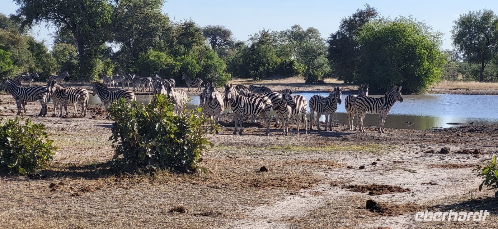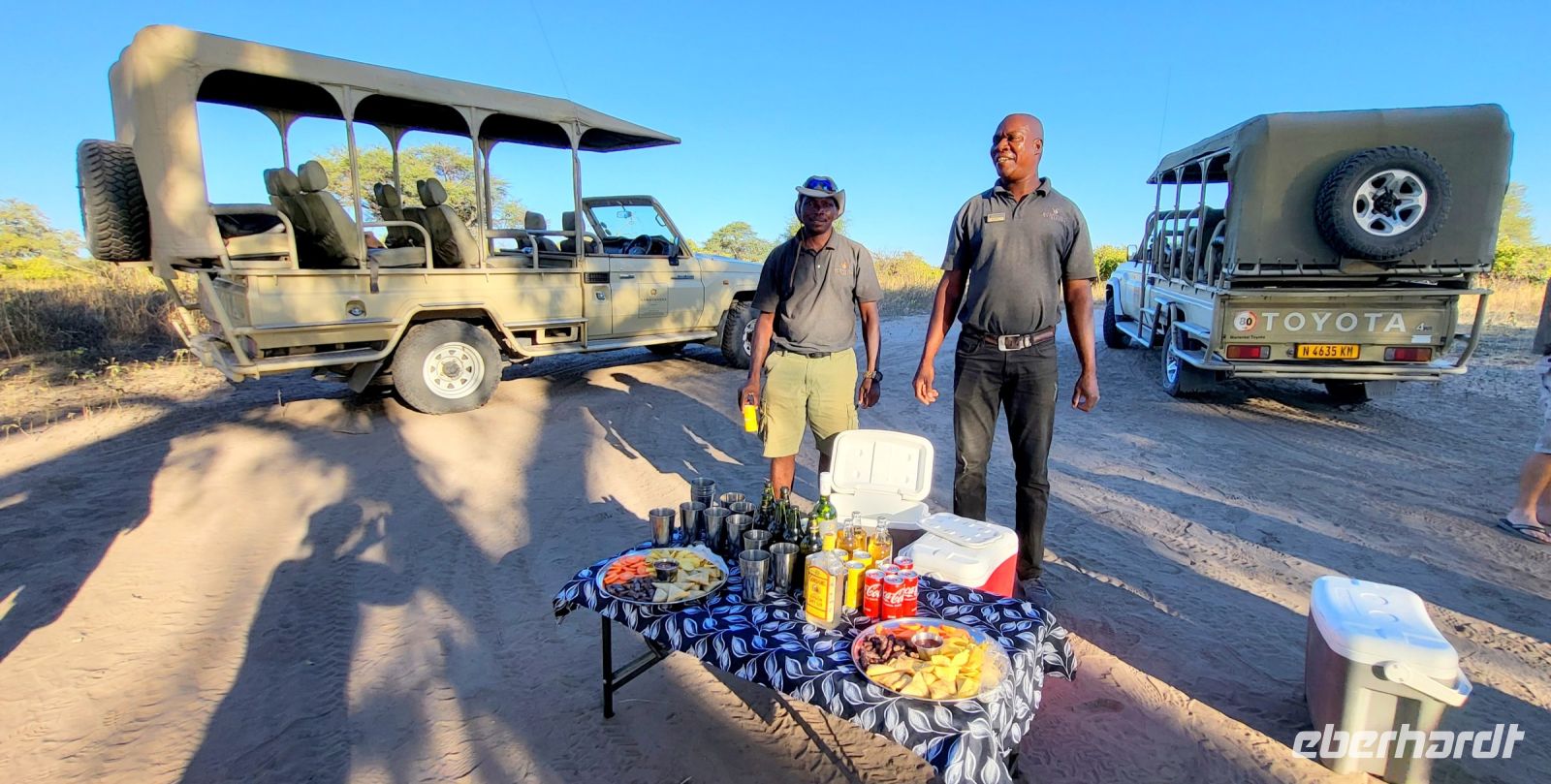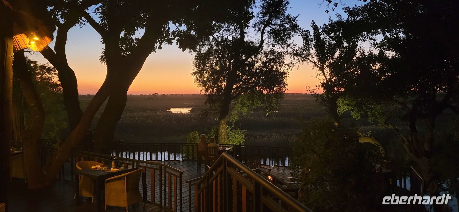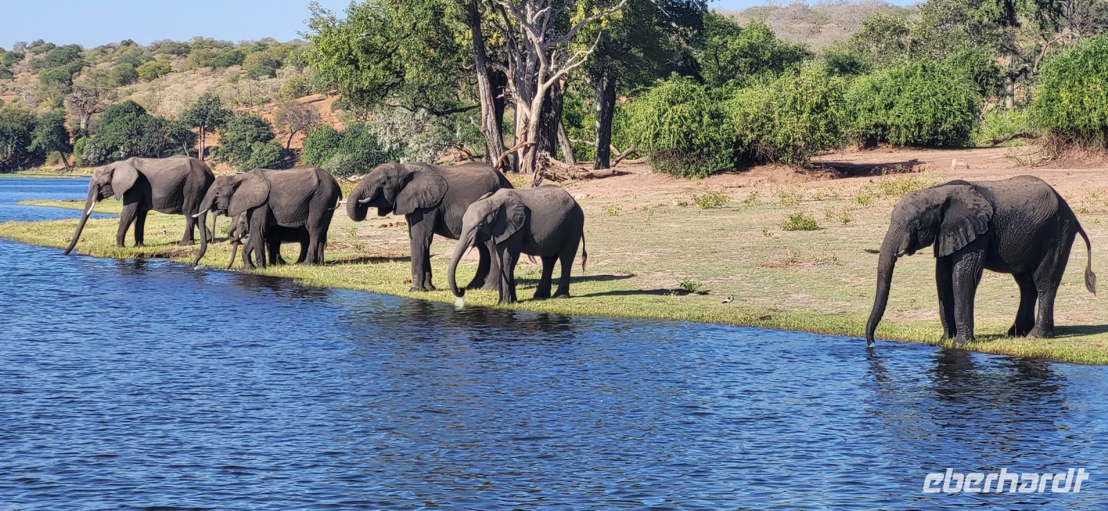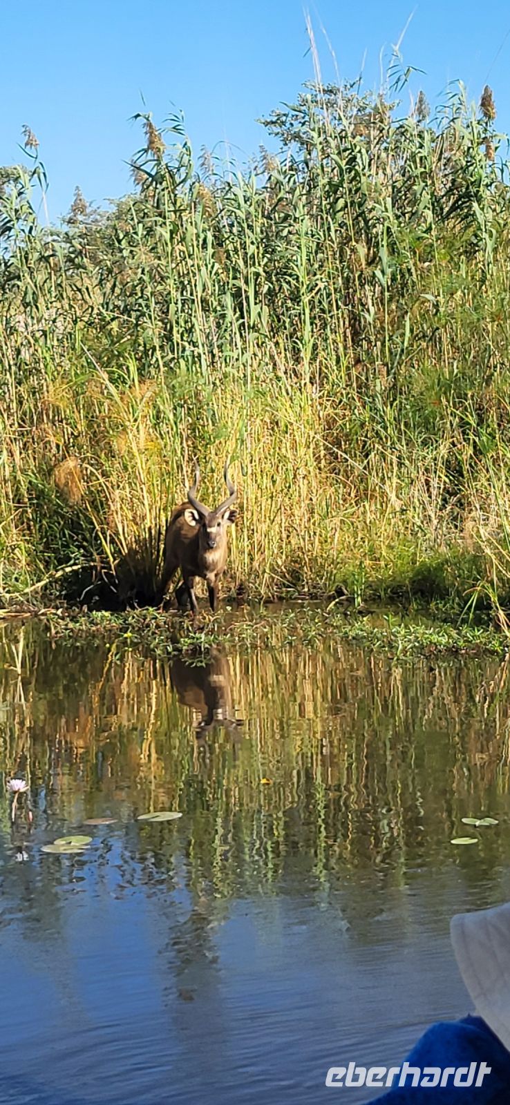 Eine herrlich ruhige Nacht liegt hinter uns, die lediglich von den Geräuschen der Natur begleitet wurde. Dazu die Klicklaute der Frösche und Grunzen der Flusspferde, was wollen wir mehr. So treffen wir uns gut gelaunt zum reichhaltigen Frühstück und verlassen im Anschluss die Lodge per Boot, um mit Guide Cacous auf dem Wasser die herrliche Flusslandschaft zu genießen. Auf unserem Boot hat ein Rotkappenschwalbenpaar mit dem Nestbau direkt über dem Funkempfänger begonnen und sie lassen sich weder durch uns an Bord noch durch das Fahrtempo beirren. Viele weitere Schwalben, Bienenfresser, Eisvögel, graue Lärmvögel säumen unsere Strecke, geben ihre Flugakrobatik zum Besten. Zu sehen ist auch der afrikanische Jacana, der auch „Jesusvogel“ genannt wird (kann durch sein geringes Gewicht auf den Blättern im Wasser laufen). Da der Fluss hier in Lodgenähe eher schmal ist, teilen wir uns die Strecke mit den dort verweilenden Hippos, die uns nur mit Augen und Ohren sichtbar aus kurzer Distanz beäugen. Aber alles gut-als es ihnen zu nah wird, tauchen sie ab und sind zumindest für uns wieder unsichtbar. Auf halber Strecke geht es an Land und wir stoßen bei einem kühlen Getränk und leckeren Knabbereien auf den schönen Vormittag an. Guide Cacous fertigt eine Kette aus einer wunderschönen Seerose und erneut erfreuen wir uns an den Dingen, die die Natur bereithält. Zurück in der Lodge heißt es die nächsten Stunden genießen, einen Mittagssnack einnehmen oder einfach mal den Klängen der Umgebung lauschen, bevor es am Nachmittag weiter zur 3-stündigen Pirschfahrt mit offenen Jeeps geht. Zunächst werden wir mit dem uns schon bekannten Boot an eine Zubringerstelle gebracht, wo wir in die offenen Fahrzeuge umsteigen. Nun mit Guide Aldrin und Boster unterwegs, bekomen wir so manch seltene Tiere zu Gesicht. Hierzu zählt die vom Aussterben bedrohte Rappenantilope sowie die Lechwe (Sumpf)-Antilopen, die es hauptsächlich hier in den Sumpfgebieten gibt. Vorbei am Leberwurstbaum mit seinen bis zu 6 Kg schweren Früchten, weist uns Guide Aldrin darauf hin, dass es nicht ratsam ist, unter einem solchen zu zelten… Gut, dass wir noch eine weitere Nacht gebucht haben. Zum ersten Mal auf unserer Reise durch Namibia sehen wir nun zahlreiche Büffel, die als das bekanntlich gefährlichste Tier der „Big Five“ gelten und die im Etosha Nationalpark nicht mehr vorhanden sind. Auch Elefanten geben sich die Ehre, mit einer großen Herde mit ca. 20 Tieren am Wasserloch, wo diese genüsslich trinken und wir sie in aller Ruhe beobachten können. Bei einem kühlen Getränk an am sogenannten „Hufeisen“ Platz, mit Blick auf den sich dort entlang schlengelnden Kwando zieht ein stattlicher Elefantenbulle unweit unserer Jeeps vobei und lässt sich zum Glück nicht beeindrucken.. Zurück zur Lodge geht es wieder per Boot und die anschließende Rückfahrt lässt uns still die Ereignisse Revue passieren und wir sind dankbar all dies hier erlebt zu haben. Ein letztes Abendessen unter dem namibianischen Sternenhimmel erfolgt hier am Kwando bevor wir morgen weiter nach Botswana ziehen. Abschließend zeigt uns Maria noch per Laserpointer außerhalb der Lodge den unglaublichen Sternenhimmel und erklärt uns so manches Sternbild. So finden wir nun zielsicher das Kreuz des Südens und die benachbarten Sterne.