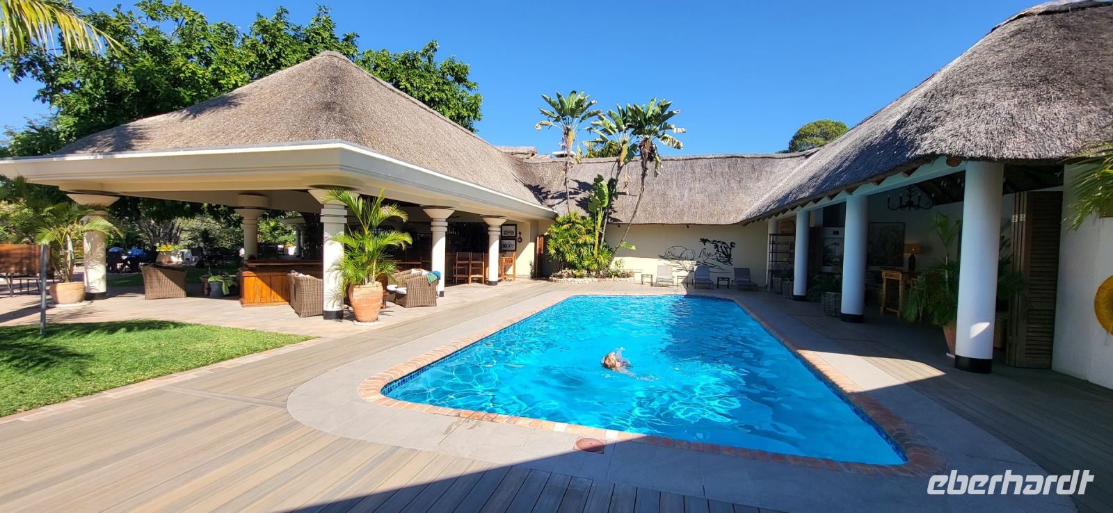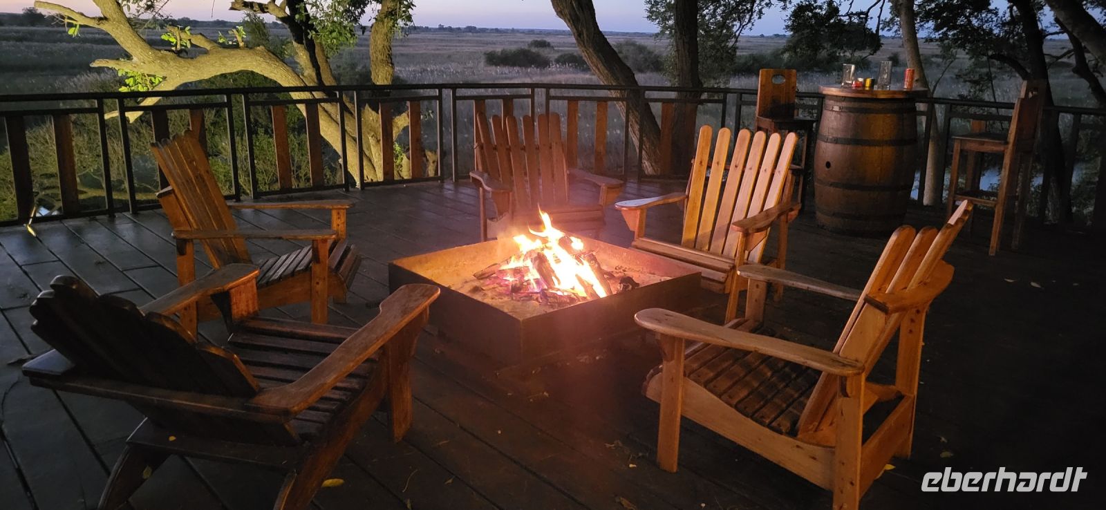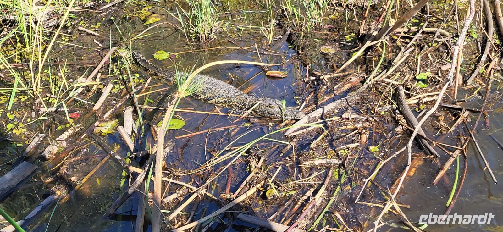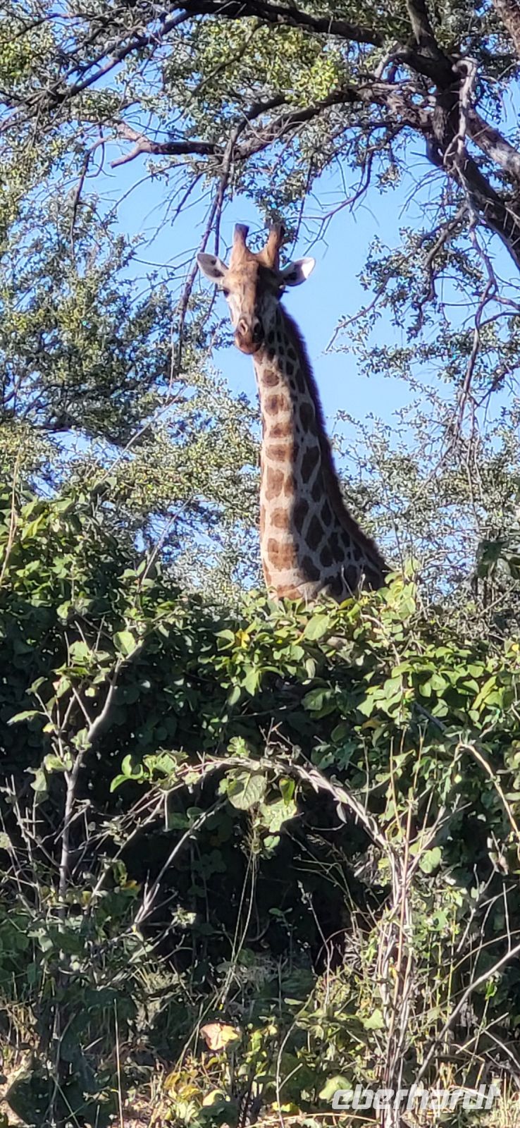 Eine herrlich ruhige Nacht liegt hinter uns, die lediglich von den Geräuschen der Natur begleitet wurde. Dazu die Klicklaute der Frösche und Grunzen der Flusspferde, was wollen wir mehr. So treffen wir uns gut gelaunt zum reichhaltigen Frühstück und verlassen im Anschluss die Lodge per Boot, um mit Guide Cacous auf dem Wasser die herrliche Flusslandschaft zu genießen. Auf unserem Boot hat ein Rotkappenschwalbenpaar mit dem Nestbau direkt über dem Funkempfänger begonnen und sie lassen sich weder durch uns an Bord noch durch das Fahrtempo beirren. Viele weitere Schwalben, Bienenfresser, Eisvögel, graue Lärmvögel säumen unsere Strecke, geben ihre Flugakrobatik zum Besten. Zu sehen ist auch der afrikanische Jacana, der auch „Jesusvogel“ genannt wird (kann durch sein geringes Gewicht auf den Blättern im Wasser laufen). Da der Fluss hier in Lodgenähe eher schmal ist, teilen wir uns die Strecke mit den dort verweilenden Hippos, die uns nur mit Augen und Ohren sichtbar aus kurzer Distanz beäugen. Aber alles gut-als es ihnen zu nah wird, tauchen sie ab und sind zumindest für uns wieder unsichtbar. Auf halber Strecke geht es an Land und wir stoßen bei einem kühlen Getränk und leckeren Knabbereien auf den schönen Vormittag an. Guide Cacous fertigt eine Kette aus einer wunderschönen Seerose und erneut erfreuen wir uns an den Dingen, die die Natur bereithält. Zurück in der Lodge heißt es die nächsten Stunden genießen, einen Mittagssnack einnehmen oder einfach mal den Klängen der Umgebung lauschen, bevor es am Nachmittag weiter zur 3-stündigen Pirschfahrt mit offenen Jeeps geht. Zunächst werden wir mit dem uns schon bekannten Boot an eine Zubringerstelle gebracht, wo wir in die offenen Fahrzeuge umsteigen. Nun mit Guide Aldrin und Boster unterwegs, bekomen wir so manch seltene Tiere zu Gesicht. Hierzu zählt die vom Aussterben bedrohte Rappenantilope sowie die Lechwe (Sumpf)-Antilopen, die es hauptsächlich hier in den Sumpfgebieten gibt. Vorbei am Leberwurstbaum mit seinen bis zu 6 Kg schweren Früchten, weist uns Guide Aldrin darauf hin, dass es nicht ratsam ist, unter einem solchen zu zelten… Gut, dass wir noch eine weitere Nacht gebucht haben. Zum ersten Mal auf unserer Reise durch Namibia sehen wir nun zahlreiche Büffel, die als das bekanntlich gefährlichste Tier der „Big Five“ gelten und die im Etosha Nationalpark nicht mehr vorhanden sind. Auch Elefanten geben sich die Ehre, mit einer großen Herde mit ca. 20 Tieren am Wasserloch, wo diese genüsslich trinken und wir sie in aller Ruhe beobachten können. Bei einem kühlen Getränk an am sogenannten „Hufeisen“ Platz, mit Blick auf den sich dort entlang schlengelnden Kwando zieht ein stattlicher Elefantenbulle unweit unserer Jeeps vobei und lässt sich zum Glück nicht beeindrucken.. Zurück zur Lodge geht es wieder per Boot und die anschließende Rückfahrt lässt uns still die Ereignisse Revue passieren und wir sind dankbar all dies hier erlebt zu haben. Ein letztes Abendessen unter dem namibianischen Sternenhimmel erfolgt hier am Kwando bevor wir morgen weiter nach Botswana ziehen. Abschließend zeigt uns Maria noch per Laserpointer außerhalb der Lodge den unglaublichen Sternenhimmel und erklärt uns so manches Sternbild. So finden wir nun zielsicher das Kreuz des Südens und die benachbarten Sterne.