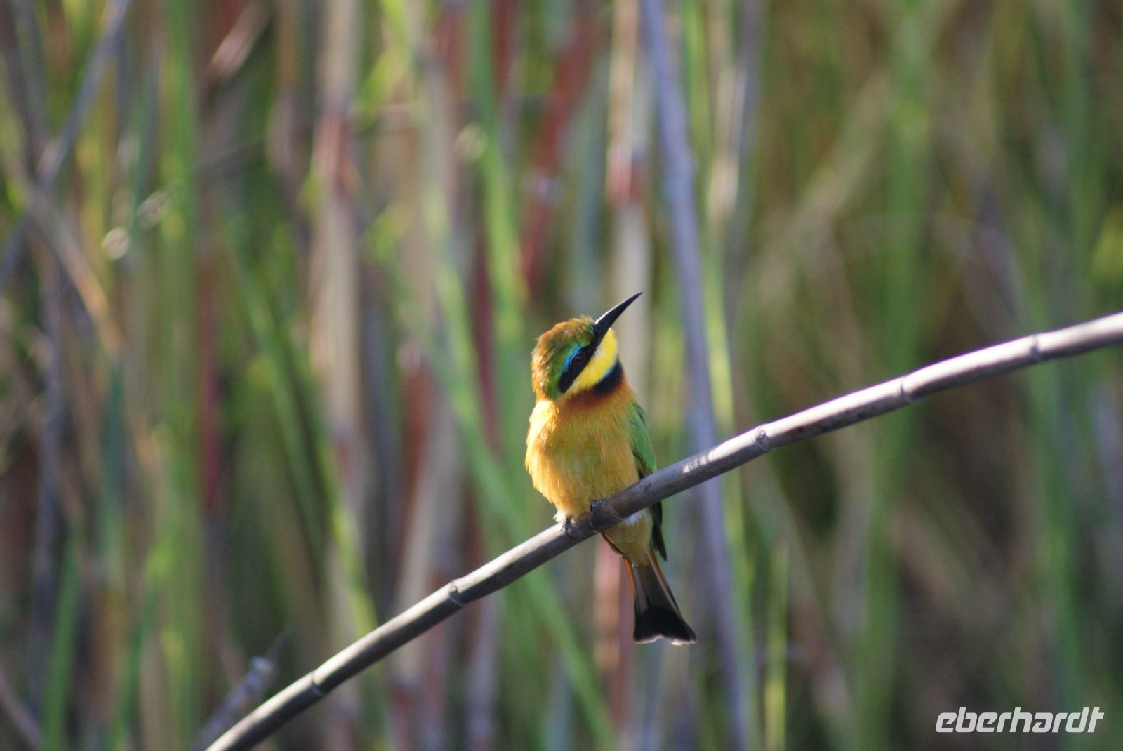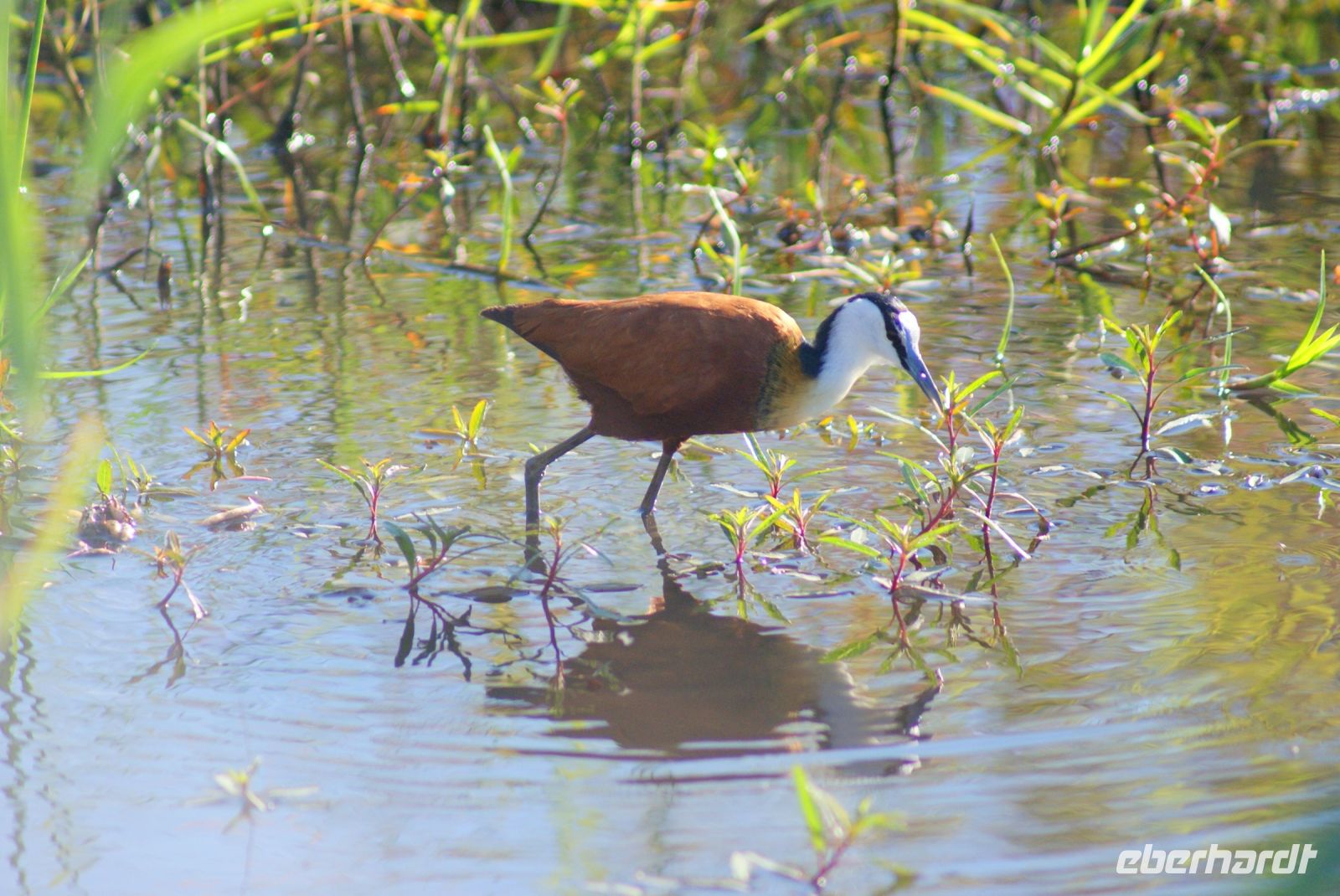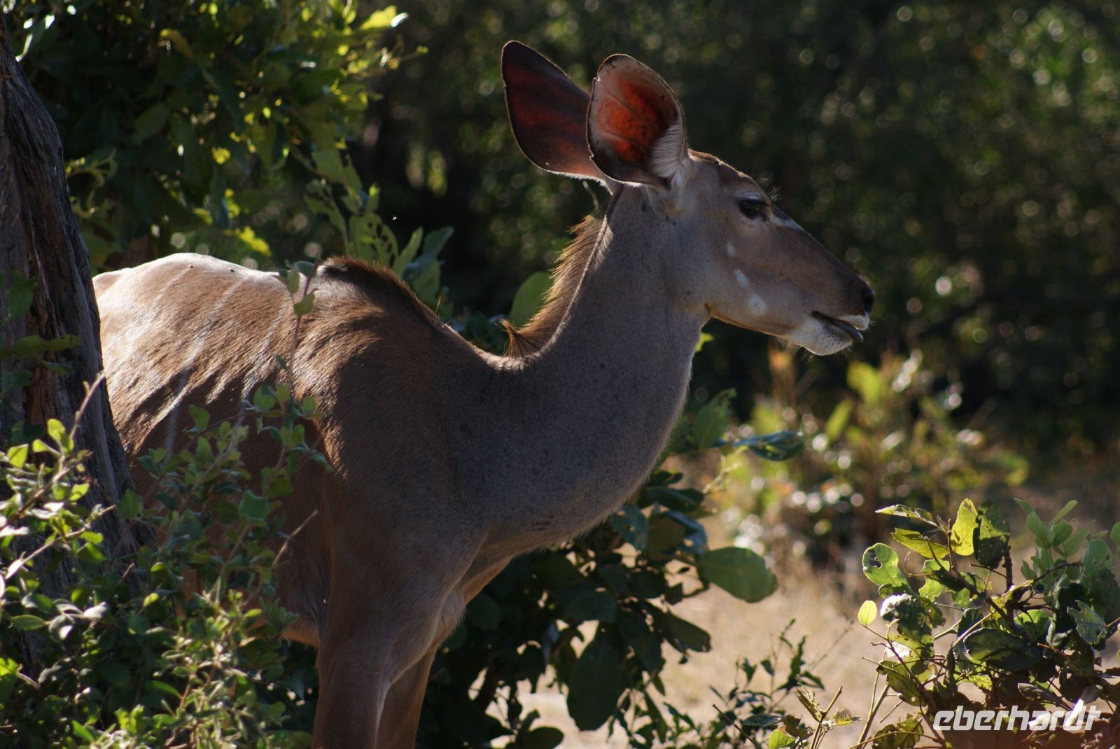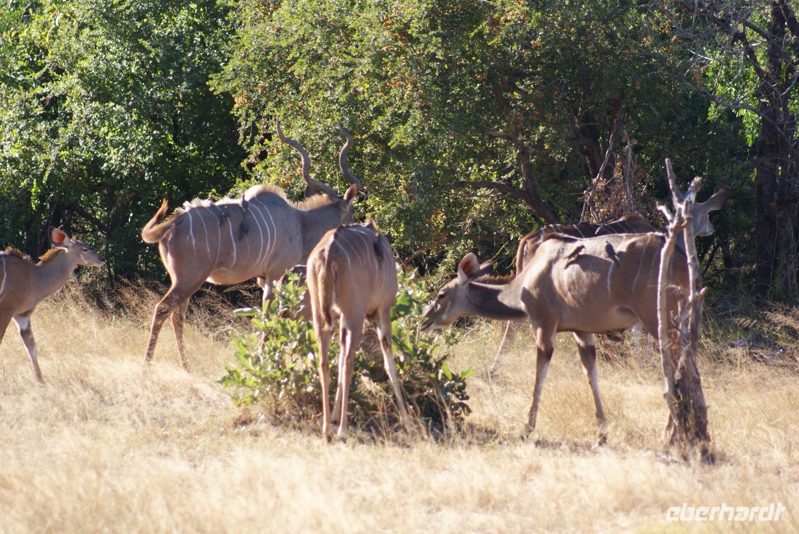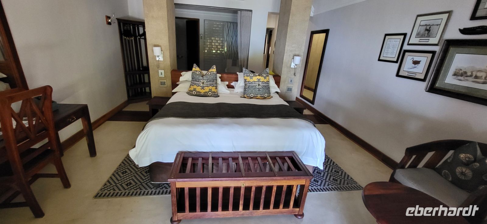 Eine herrlich ruhige Nacht liegt hinter uns, die lediglich von den Geräuschen der Natur begleitet wurde. Dazu die Klicklaute der Frösche und Grunzen der Flusspferde, was wollen wir mehr. So treffen wir uns gut gelaunt zum reichhaltigen Frühstück und verlassen im Anschluss die Lodge per Boot, um mit Guide Cacous auf dem Wasser die herrliche Flusslandschaft zu genießen. Auf unserem Boot hat ein Rotkappenschwalbenpaar mit dem Nestbau direkt über dem Funkempfänger begonnen und sie lassen sich weder durch uns an Bord noch durch das Fahrtempo beirren. Viele weitere Schwalben, Bienenfresser, Eisvögel, graue Lärmvögel säumen unsere Strecke, geben ihre Flugakrobatik zum Besten. Zu sehen ist auch der afrikanische Jacana, der auch „Jesusvogel“ genannt wird (kann durch sein geringes Gewicht auf den Blättern im Wasser laufen). Da der Fluss hier in Lodgenähe eher schmal ist, teilen wir uns die Strecke mit den dort verweilenden Hippos, die uns nur mit Augen und Ohren sichtbar aus kurzer Distanz beäugen. Aber alles gut-als es ihnen zu nah wird, tauchen sie ab und sind zumindest für uns wieder unsichtbar. Auf halber Strecke geht es an Land und wir stoßen bei einem kühlen Getränk und leckeren Knabbereien auf den schönen Vormittag an. Guide Cacous fertigt eine Kette aus einer wunderschönen Seerose und erneut erfreuen wir uns an den Dingen, die die Natur bereithält. Zurück in der Lodge heißt es die nächsten Stunden genießen, einen Mittagssnack einnehmen oder einfach mal den Klängen der Umgebung lauschen, bevor es am Nachmittag weiter zur 3-stündigen Pirschfahrt mit offenen Jeeps geht. Zunächst werden wir mit dem uns schon bekannten Boot an eine Zubringerstelle gebracht, wo wir in die offenen Fahrzeuge umsteigen. Nun mit Guide Aldrin und Boster unterwegs, bekomen wir so manch seltene Tiere zu Gesicht. Hierzu zählt die vom Aussterben bedrohte Rappenantilope sowie die Lechwe (Sumpf)-Antilopen, die es hauptsächlich hier in den Sumpfgebieten gibt. Vorbei am Leberwurstbaum mit seinen bis zu 6 Kg schweren Früchten, weist uns Guide Aldrin darauf hin, dass es nicht ratsam ist, unter einem solchen zu zelten… Gut, dass wir noch eine weitere Nacht gebucht haben. Zum ersten Mal auf unserer Reise durch Namibia sehen wir nun zahlreiche Büffel, die als das bekanntlich gefährlichste Tier der „Big Five“ gelten und die im Etosha Nationalpark nicht mehr vorhanden sind. Auch Elefanten geben sich die Ehre, mit einer großen Herde mit ca. 20 Tieren am Wasserloch, wo diese genüsslich trinken und wir sie in aller Ruhe beobachten können. Bei einem kühlen Getränk an am sogenannten „Hufeisen“ Platz, mit Blick auf den sich dort entlang schlengelnden Kwando zieht ein stattlicher Elefantenbulle unweit unserer Jeeps vobei und lässt sich zum Glück nicht beeindrucken.. Zurück zur Lodge geht es wieder per Boot und die anschließende Rückfahrt lässt uns still die Ereignisse Revue passieren und wir sind dankbar all dies hier erlebt zu haben. Ein letztes Abendessen unter dem namibianischen Sternenhimmel erfolgt hier am Kwando bevor wir morgen weiter nach Botswana ziehen. Abschließend zeigt uns Maria noch per Laserpointer außerhalb der Lodge den unglaublichen Sternenhimmel und erklärt uns so manches Sternbild. So finden wir nun zielsicher das Kreuz des Südens und die benachbarten Sterne.