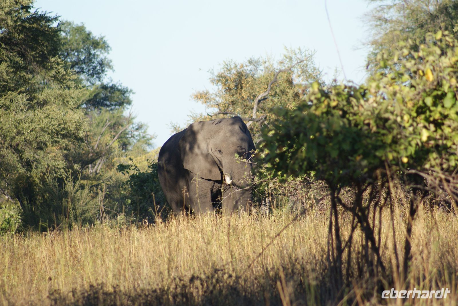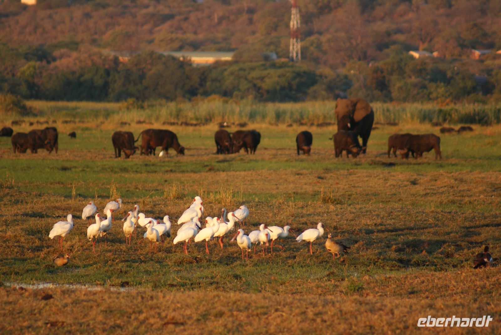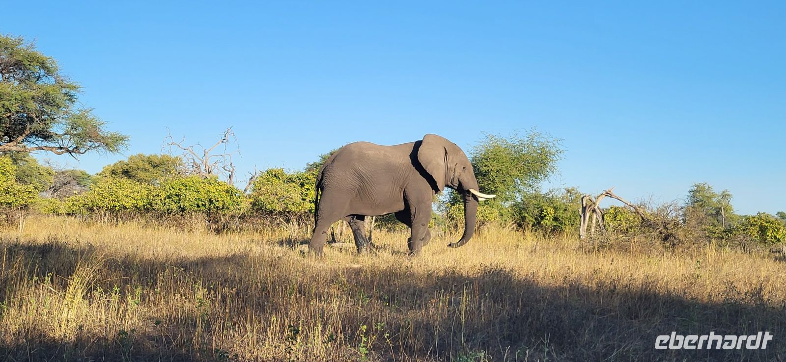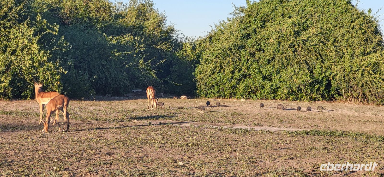 Noch im Dunkeln um 05.45 Uhr treffen wir uns alle auf dem Parkplatz, um zu unserer heutigen Pirschfahrt aufzubrechen. Guide Matteo und Kollege begrüßen uns freundlich und wir fahren bei noch kühlen Temperaturen in den Chobe Nationalpark. Da wir schon gestern einige Elefanten gesehen haben, bitten wir die Guides, die Löwen und andere Katzen für uns zu finden. Zunächst haben wir jedoch das Glück einen davon eilenden Honidachs zu entdecken sowie einen Schabrakenschakal auf offener Fläche. Weiter geht es Richtung Fluss. Wie schon gedacht, ist heute Morgen die Fläche und um den Chobe Fluss ohne Elefanten, da sich diese in der Nacht in den Buschbereich verziehen und erst am Vormittag zum Trinken erscheinen. So sehen wir nur ein paar Hippos, die friedlich grasen oder sich im Wasser aufhalten. Impalas, Kudus und so manche Pavianhorde säumen unseren Weg. Etliche Impalaherden grasen friedlich und auch die Marabus stehen noch immer in den kahlen Bäumen und haben sich noch nicht vom Schlafgemach entfernt. Hier waren sie vor nächtlichen Räubern sicher. Anschließend erfolgt ein Morgenkaffee mitten im Busch. Wir bitten unseren Guide nochmals nach Löwen Ausschau zu halten, jedoch gelingt es uns heute leider nicht! Was soll’s, es war trotzdem eine schöne Pirschfahrt, bei der wir schließlich doch noch so manche Elefanten unweit unserer Fahrzeuge entdecken konnten und somit kehren wir zur Lodge zurück und frühstücken erst mal ausgiebig. Die Mittagszeit genießt jeder nach seinem Geschmack und spaziert vielleicht ein bisschen durch Kasane, bevor wir uns nachmittags zur Safari per Boot einfinden. Wir erleben wunderbare Stunden an Bord und sehen die Tiere nun vom Wasser aus. Ein tolles Erlebnis, Elefanten, Wasserböcke, Krokodile, Flusspferde, Störche, Büffel zu sehen, wie diese friedlich grasen und sich durch uns nicht stören lassen. Ein riesiger Elefantenbulle ist in unmittelbarer Nähe und macht es sich auf einer kleinen Insel gemütlich, um dort das für ihn schmackhafte Gras zu vertilgen-welch ein toller Augenblick. Der anschließende Sonnenuntergang lässt viele schöne Aufnahmen entstehen, die wir alle lang in Erinnerung behalten werden.