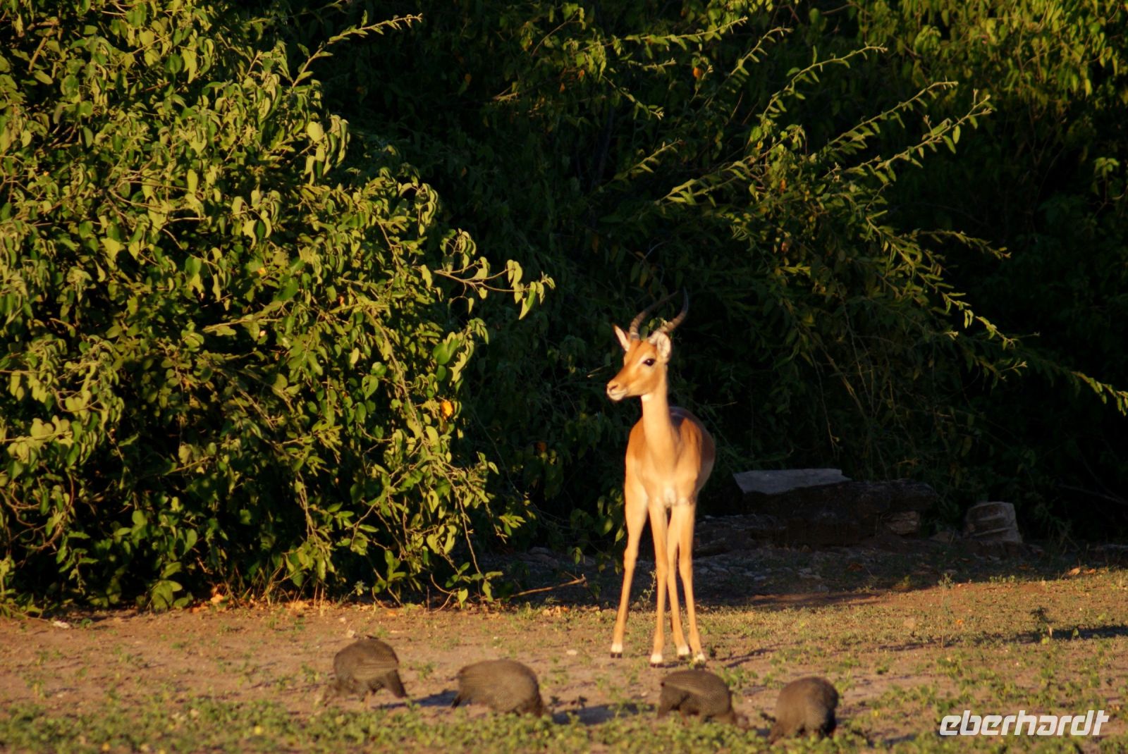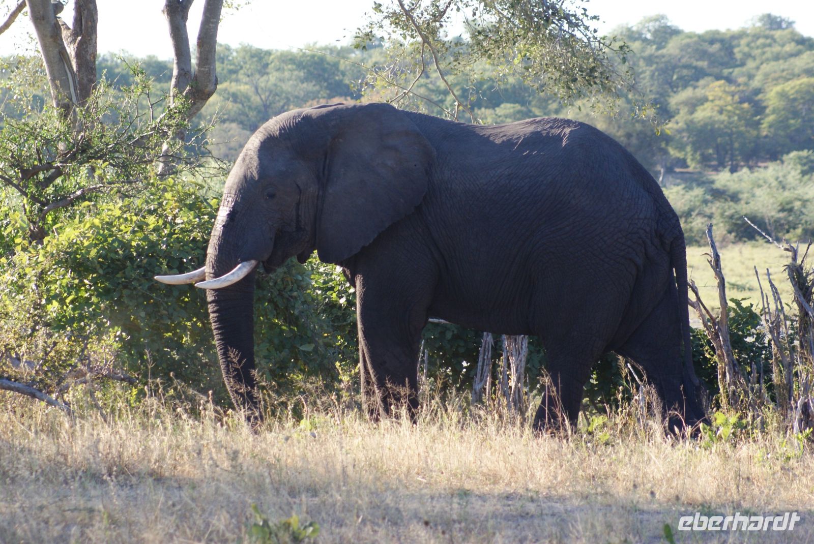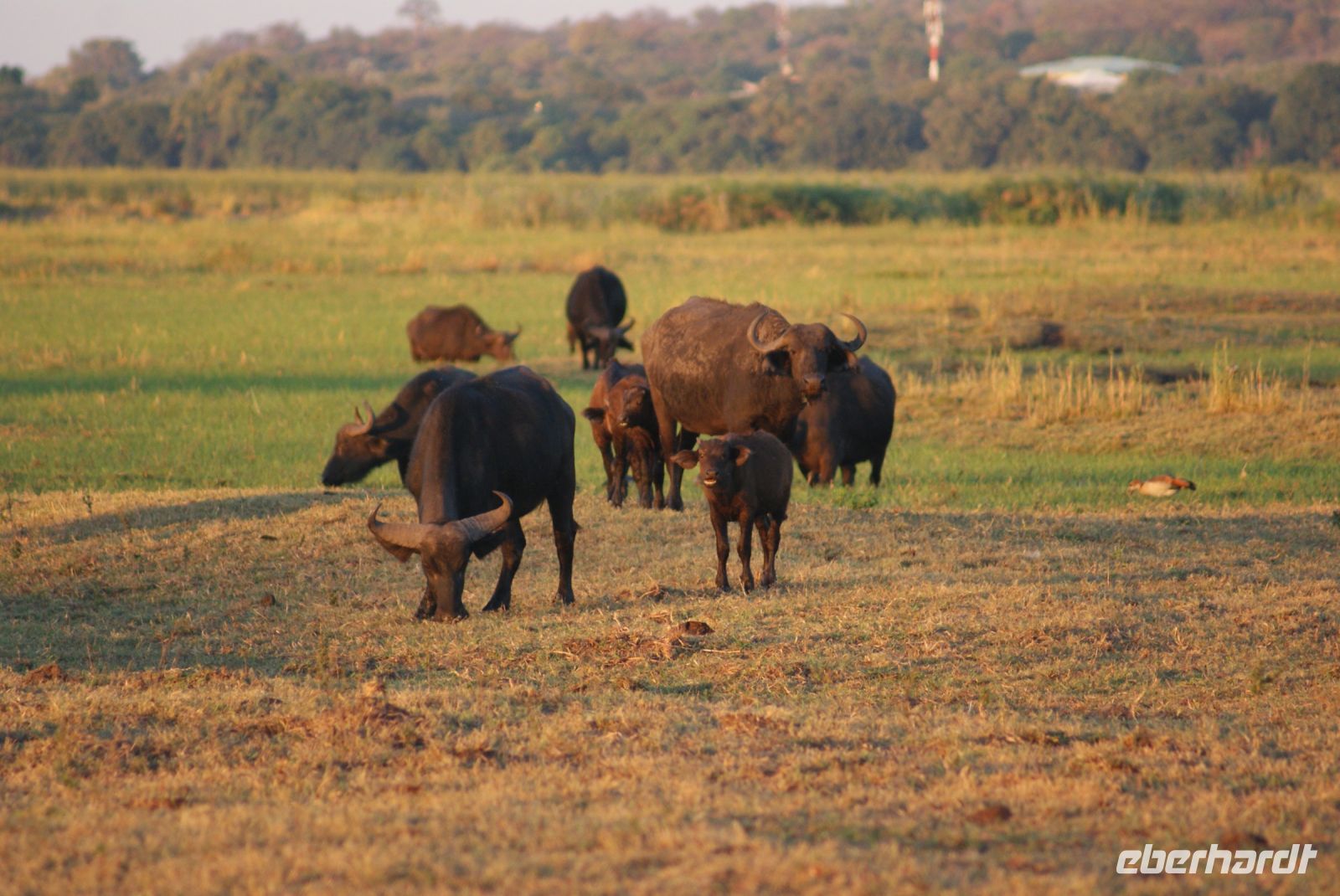 Noch im Dunkeln um 05.45 Uhr treffen wir uns alle auf dem Parkplatz, um zu unserer heutigen Pirschfahrt aufzubrechen. Guide Matteo und Kollege begrüßen uns freundlich und wir fahren bei noch kühlen Temperaturen in den Chobe Nationalpark. Da wir schon gestern einige Elefanten gesehen haben, bitten wir die Guides, die Löwen und andere Katzen für uns zu finden. Zunächst haben wir jedoch das Glück einen davon eilenden Honidachs zu entdecken sowie einen Schabrakenschakal auf offener Fläche. Weiter geht es Richtung Fluss. Wie schon gedacht, ist heute Morgen die Fläche und um den Chobe Fluss ohne Elefanten, da sich diese in der Nacht in den Buschbereich verziehen und erst am Vormittag zum Trinken erscheinen. So sehen wir nur ein paar Hippos, die friedlich grasen oder sich im Wasser aufhalten. Impalas, Kudus und so manche Pavianhorde säumen unseren Weg. Etliche Impalaherden grasen friedlich und auch die Marabus stehen noch immer in den kahlen Bäumen und haben sich noch nicht vom Schlafgemach entfernt. Hier waren sie vor nächtlichen Räubern sicher. Anschließend erfolgt ein Morgenkaffee mitten im Busch. Wir bitten unseren Guide nochmals nach Löwen Ausschau zu halten, jedoch gelingt es uns heute leider nicht! Was soll’s, es war trotzdem eine schöne Pirschfahrt, bei der wir schließlich doch noch so manche Elefanten unweit unserer Fahrzeuge entdecken konnten und somit kehren wir zur Lodge zurück und frühstücken erst mal ausgiebig. Die Mittagszeit genießt jeder nach seinem Geschmack und spaziert vielleicht ein bisschen durch Kasane, bevor wir uns nachmittags zur Safari per Boot einfinden. Wir erleben wunderbare Stunden an Bord und sehen die Tiere nun vom Wasser aus. Ein tolles Erlebnis, Elefanten, Wasserböcke, Krokodile, Flusspferde, Störche, Büffel zu sehen, wie diese friedlich grasen und sich durch uns nicht stören lassen. Ein riesiger Elefantenbulle ist in unmittelbarer Nähe und macht es sich auf einer kleinen Insel gemütlich, um dort das für ihn schmackhafte Gras zu vertilgen-welch ein toller Augenblick. Der anschließende Sonnenuntergang lässt viele schöne Aufnahmen entstehen, die wir alle lang in Erinnerung behalten werden.