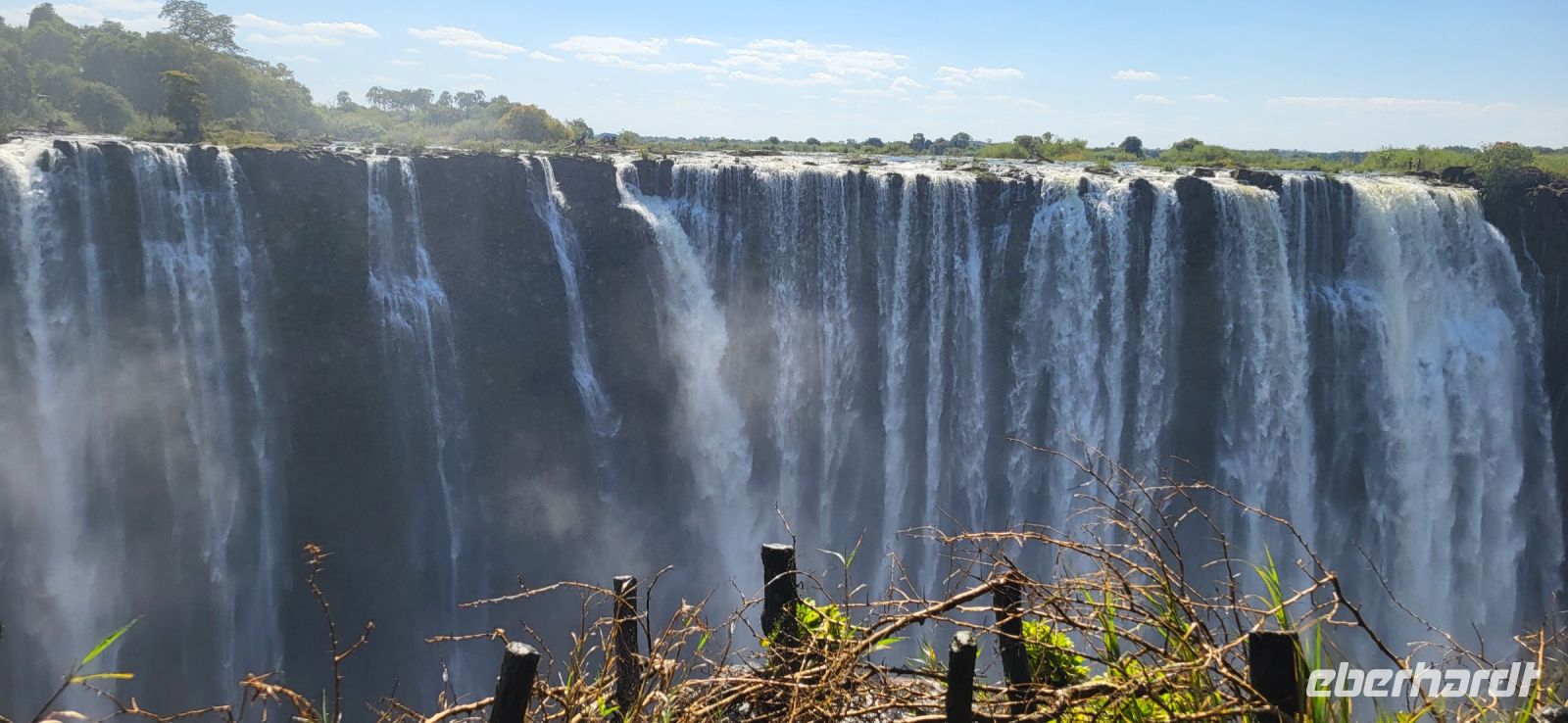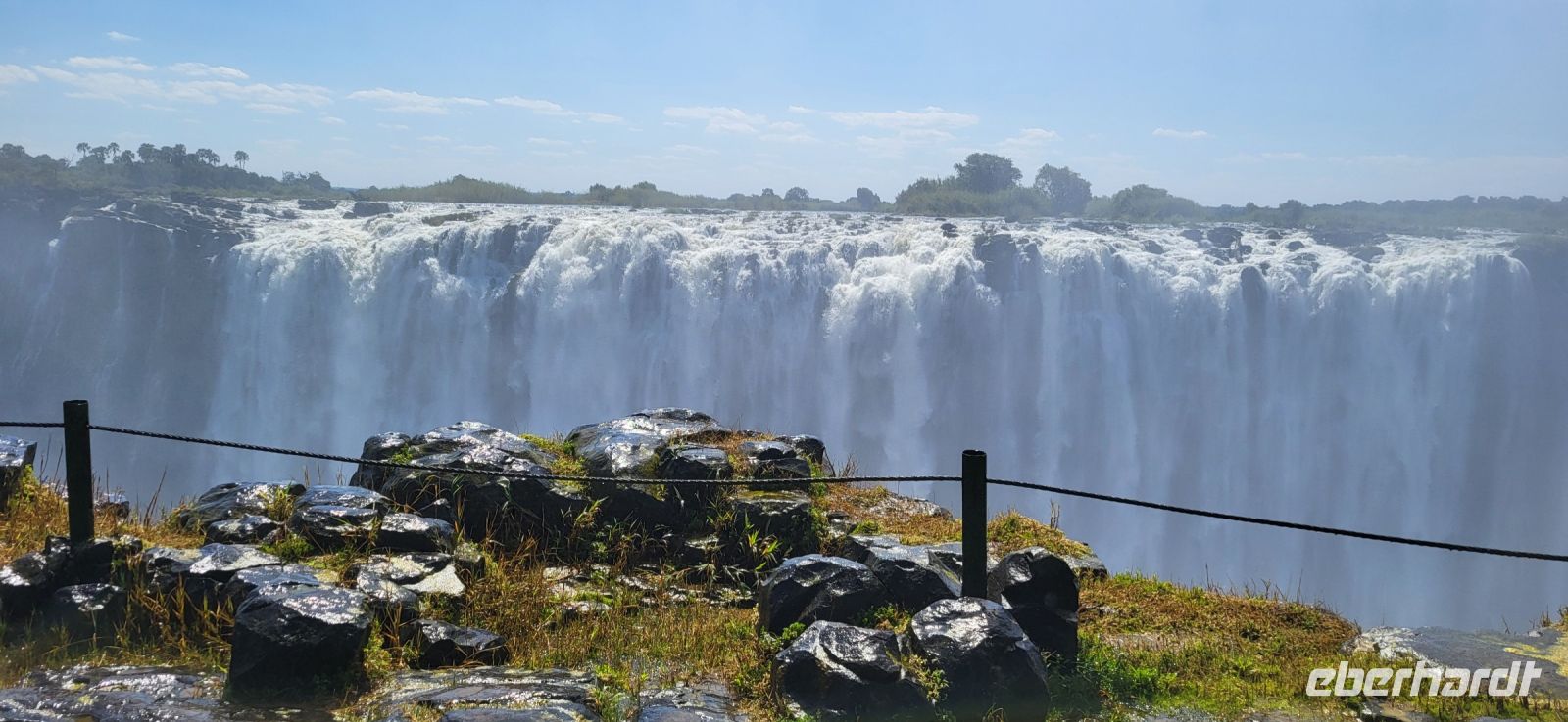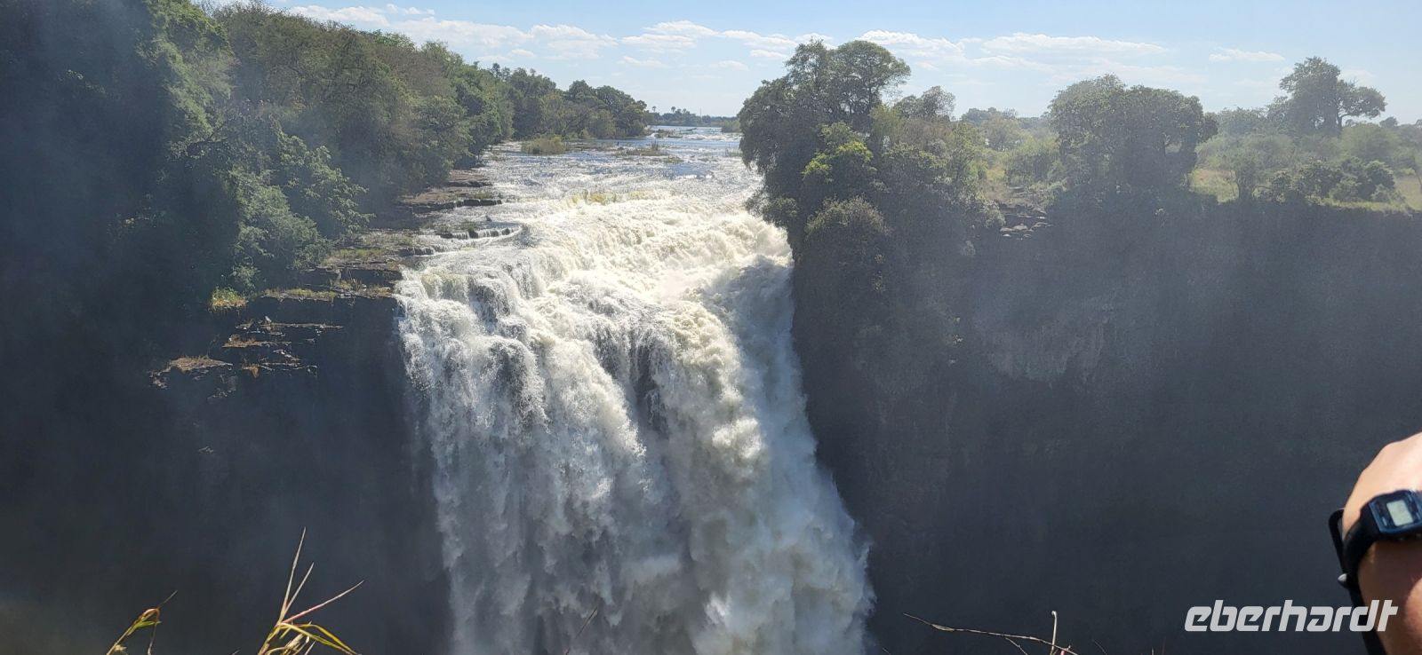 Wir genießen ein ruhiges Frühstück und machen uns auf den Weg zur Grenze. Schnell haben wir alle Grenzformalitäten erledigt, da alles durch Maria schon vorab bestens vorbereitet und organisiert wurde. Weiter geht es nun durch Simbabwe zu den Victoria Fällen. Unterwegs durchfahren wir wieder eine Transitstaße durch den Nationalpark und halten nach Tieren Ausschau. Heute ist es jedoch noch recht ruhig, sodass wir zügig in Vic Falls ankommen und zunächst den 1200 Jahre alten Baobabbaum außerhalb des Ortes anschauen. 22 m Umfang und 24 m Höhe erwarten uns und es bleibt nur, ihn staunend zu betrachten. Jetzt aber auf zu den berühmten Fällen, die mit zu den sieben Weltnaturwundern gehören. Diese wurden von den schottischen Missionar und Afrikareisenden Sir David Livingstone im Jahre 1855 entdeckt, der diese nach der britischen Königin Victoria benannte. So spazieren wir die 16 möglichen Aussichtspunkte des Mosi oa Tunya (Der Rauch, der donnert), wie die Fälle in der einheimischen Sprache heißen, entlang. Wir befinden uns jetzt in der Regenzeit, sodass die Fälle bis zum Ende Wasser führen und man die komplette Strecke mit Wasserfallsicht entlang spazieren kann. Sie sind der breiteste, durchgehende Wasserfall der Erde und auf dem kompletten Spaziergang legt man insgesamt knapp 4 Km zurück. Herrliche Aufnahmen entstehen und man kann sich nicht satt sehen und muss alles akribisch fotografieren. Bedingt durch die stets aufsteigende Gischt, entstand gegenüberliegend der Fälle ein Regenwald, durch den wir an den Fällen entlang schlendern. Nach so viel Wasser um uns herum darf ein kühles Getränk zum Abschluss nicht fehlen. Am Nachmittag fahren wir ein letztes Mal per Boot zur abendlichen Fahrt auf den Sambesi. Eine friedliche Stimmung mit tollem Licht, nochmals Hippos und Krokodile, dazu schöne Getränke, runden eine rundum gelungene Reise wunderbar ab.
