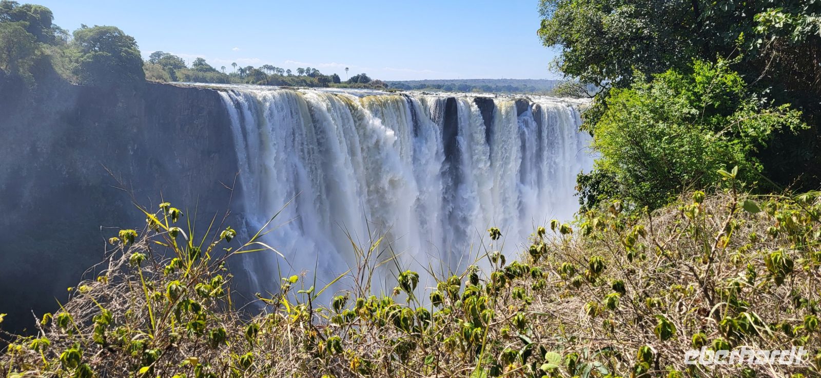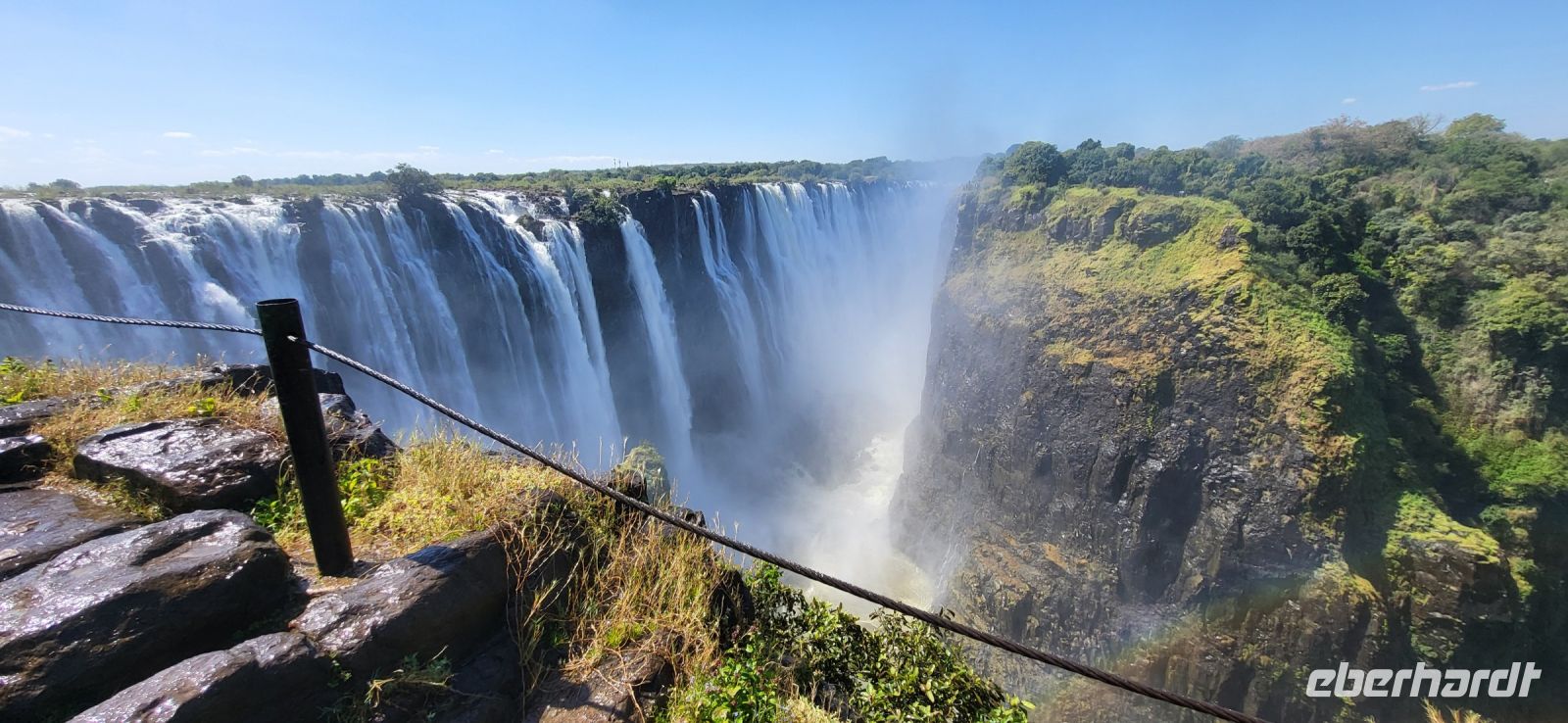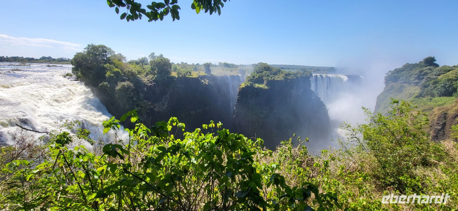 Wir genießen ein ruhiges Frühstück und machen uns auf den Weg zur Grenze. Schnell haben wir alle Grenzformalitäten erledigt, da alles durch Maria schon vorab bestens vorbereitet und organisiert wurde. Weiter geht es nun durch Simbabwe zu den Victoria Fällen. Unterwegs durchfahren wir wieder eine Transitstaße durch den Nationalpark und halten nach Tieren Ausschau. Heute ist es jedoch noch recht ruhig, sodass wir zügig in Vic Falls ankommen und zunächst den 1200 Jahre alten Baobabbaum außerhalb des Ortes anschauen. 22 m Umfang und 24 m Höhe erwarten uns und es bleibt nur, ihn staunend zu betrachten. Jetzt aber auf zu den berühmten Fällen, die mit zu den sieben Weltnaturwundern gehören. Diese wurden von den schottischen Missionar und Afrikareisenden Sir David Livingstone im Jahre 1855 entdeckt, der diese nach der britischen Königin Victoria benannte. So spazieren wir die 16 möglichen Aussichtspunkte des Mosi oa Tunya (Der Rauch, der donnert), wie die Fälle in der einheimischen Sprache heißen, entlang. Wir befinden uns jetzt in der Regenzeit, sodass die Fälle bis zum Ende Wasser führen und man die komplette Strecke mit Wasserfallsicht entlang spazieren kann. Sie sind der breiteste, durchgehende Wasserfall der Erde und auf dem kompletten Spaziergang legt man insgesamt knapp 4 Km zurück. Herrliche Aufnahmen entstehen und man kann sich nicht satt sehen und muss alles akribisch fotografieren. Bedingt durch die stets aufsteigende Gischt, entstand gegenüberliegend der Fälle ein Regenwald, durch den wir an den Fällen entlang schlendern. Nach so viel Wasser um uns herum darf ein kühles Getränk zum Abschluss nicht fehlen. Am Nachmittag fahren wir ein letztes Mal per Boot zur abendlichen Fahrt auf den Sambesi. Eine friedliche Stimmung mit tollem Licht, nochmals Hippos und Krokodile, dazu schöne Getränke, runden eine rundum gelungene Reise wunderbar ab.