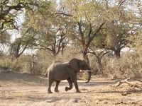 Die Elefanten hier sind leider etwas aggressiver, da früher Jäger in der Region aktiv waren und sie dadurch wahrscheinlich verängstigt wurden. Elefanten fressen sehr gerne die Blätter des Baobabbaums, da diese besonders weich sind. Sie trinken etwa 200 Liter Wasser pro Tag und baden im Wasser, um sich mit Schlamm vor der Sonne zu schützen. Irgendwann beginnt es jedoch zu jucken, und sie reiben sich an den Bäumen, was diese schädigt, da sie dann nicht mehr ausreichend vor der Sonne geschützt sind. Sie scharren mit ihren Füßen, um das Gras im Boden zu fressen, welches weicher und schmackhafter ist.