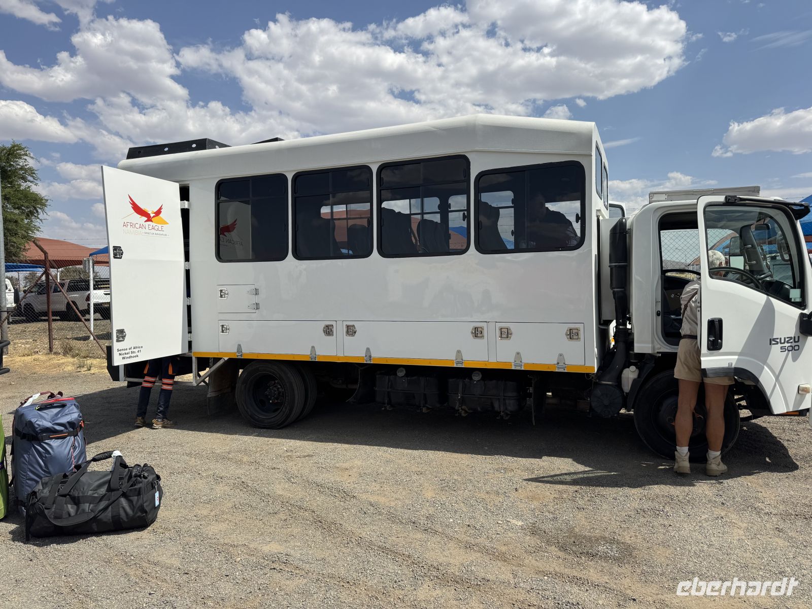 Schön, dass wir da sind. Die Visaangelegenheiten dauern einen Augenblick, hält uns eine nette Dame doch mit den Geburtsurkunden unserer jüngeren Mitreisenden auf. Geht ja gut los denken wir. Aber beide Seiten sind wohlgesonnen und so ist das bald kein Thema mehr. Wir sind also vollzählig im Land und draußen wartet schon Louw, unser Tourguide. Mit ihm werden wir die nächsten 14 Tage durch ganze 3 Länder reisen.