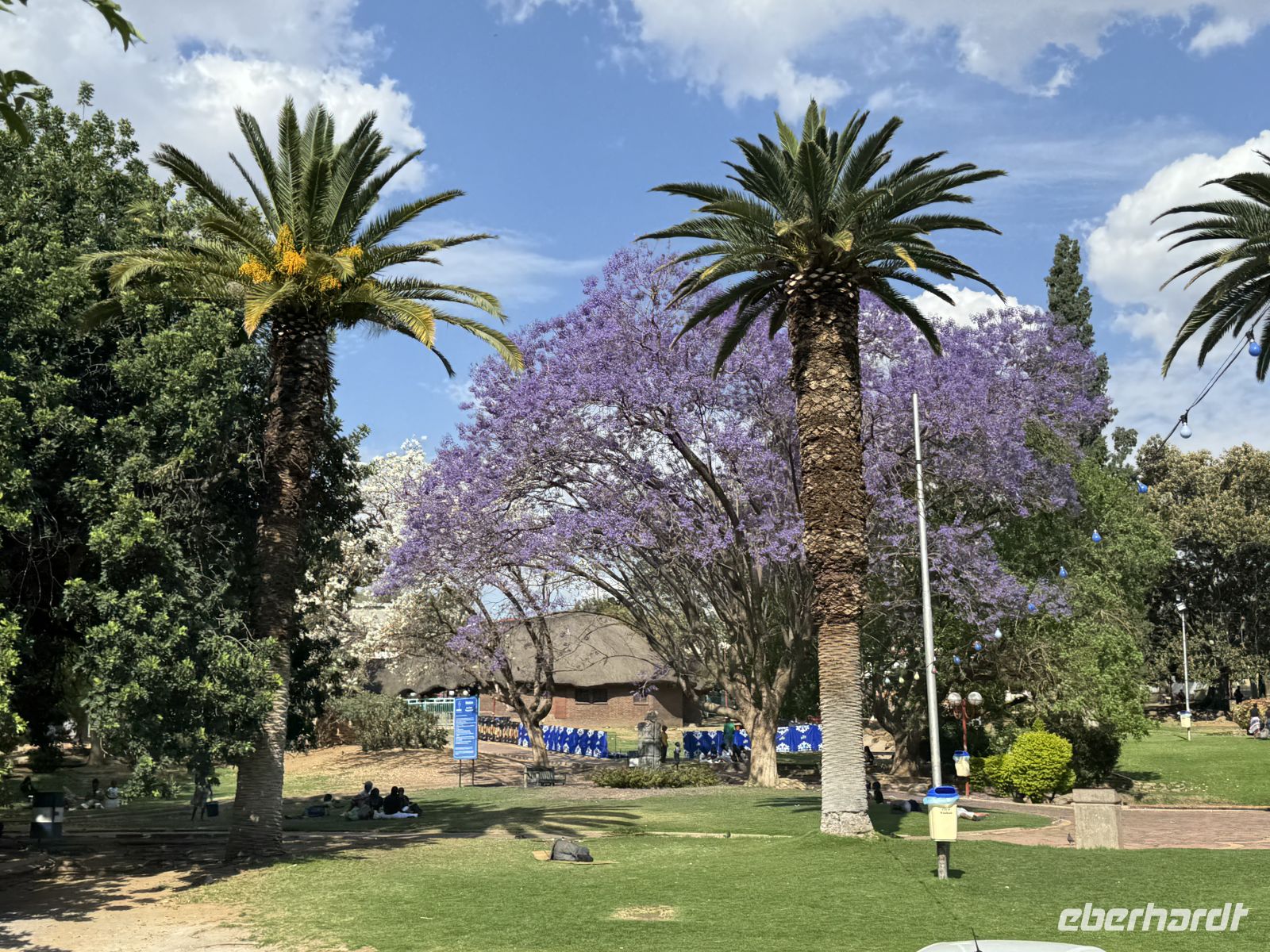 Wieder unten, schlendern wir um die Christuskirche. Da heute Sonntag ist und damit Gottesdienste stattfinden, ist der Zugang für uns nicht möglich, aber auch von außen sehr schön anzusehen. Direkt gegenüber der Parlamentsgarten, eine außergewöhnliche Grünanlage mit herrlich, ganz in lila blühenden Jacaranda Bäumen.