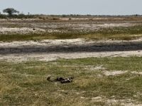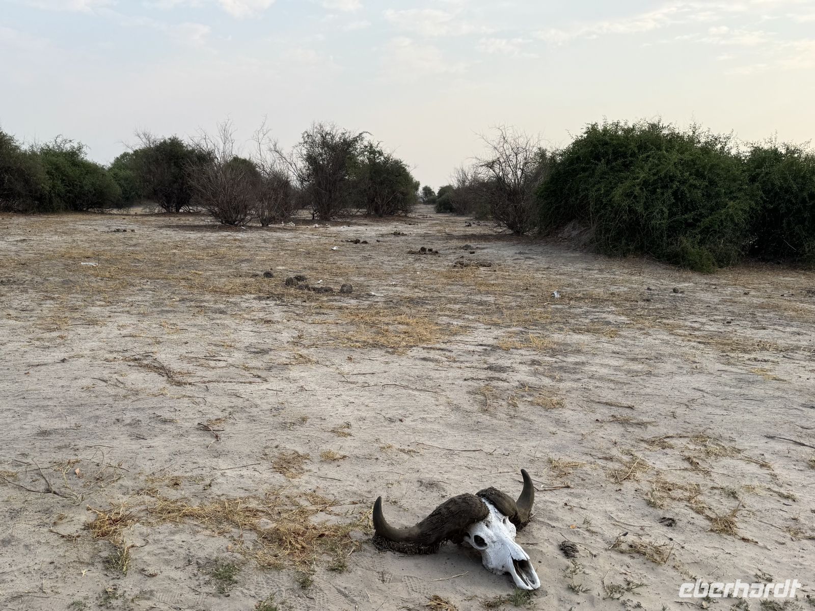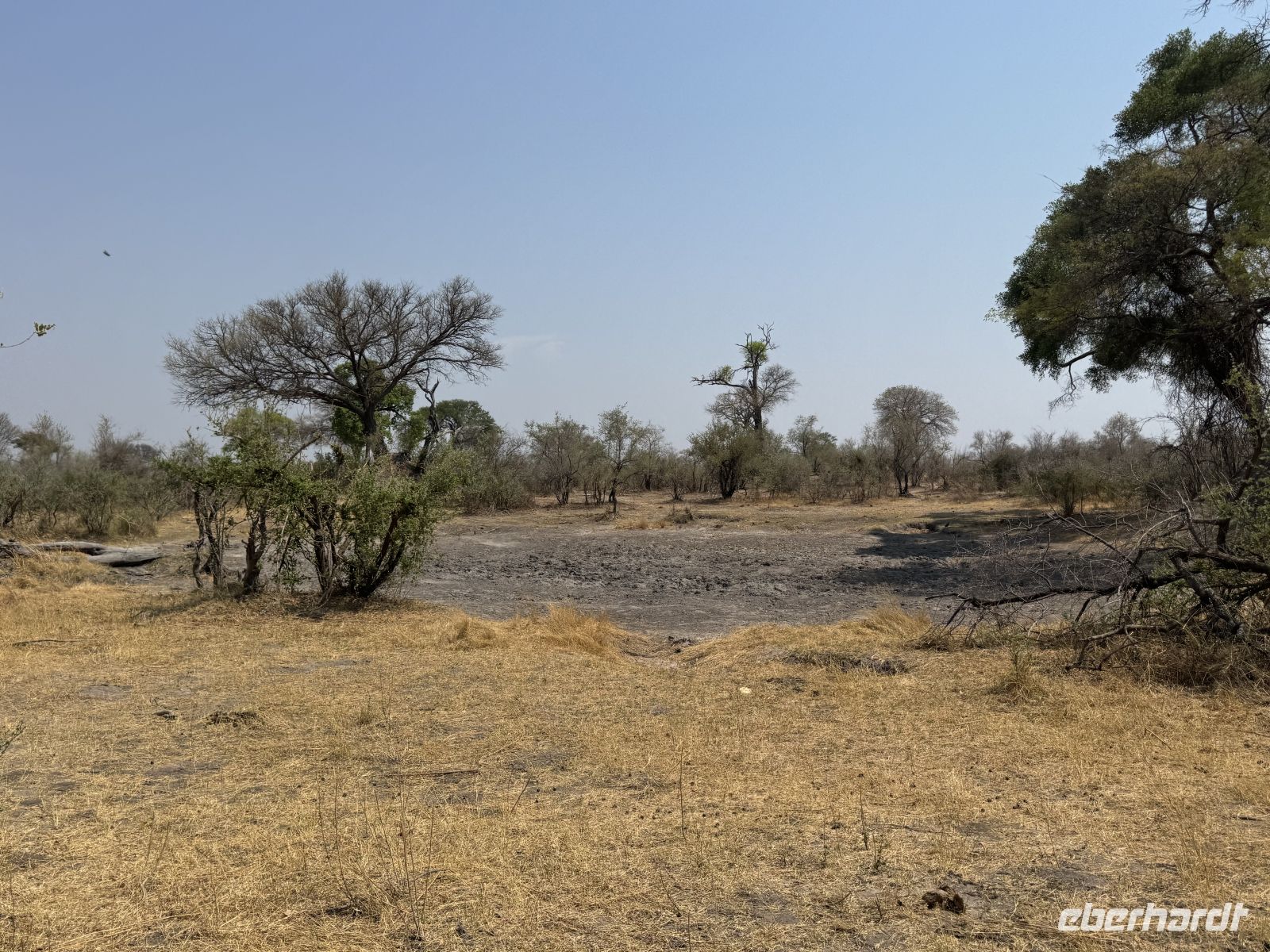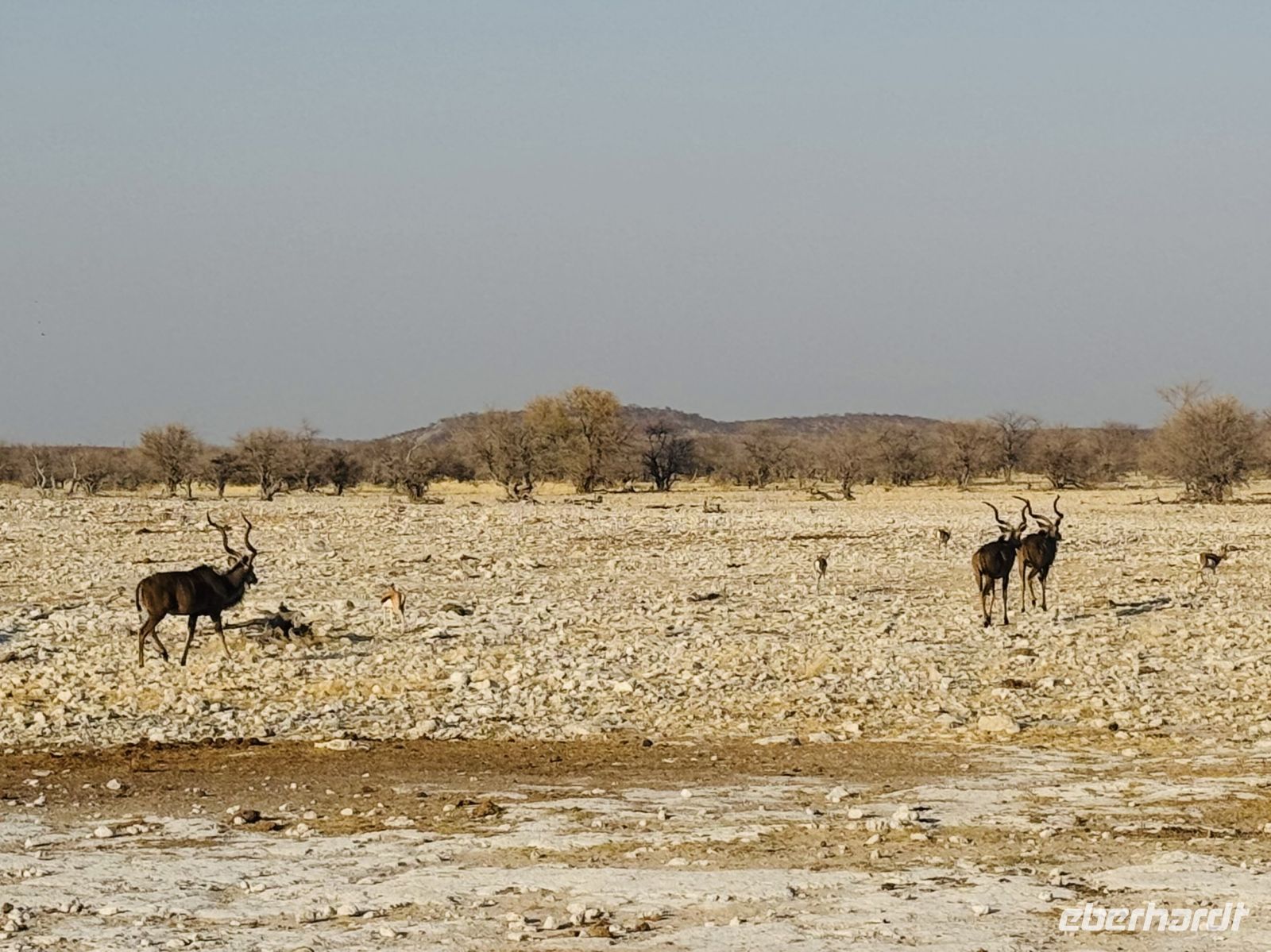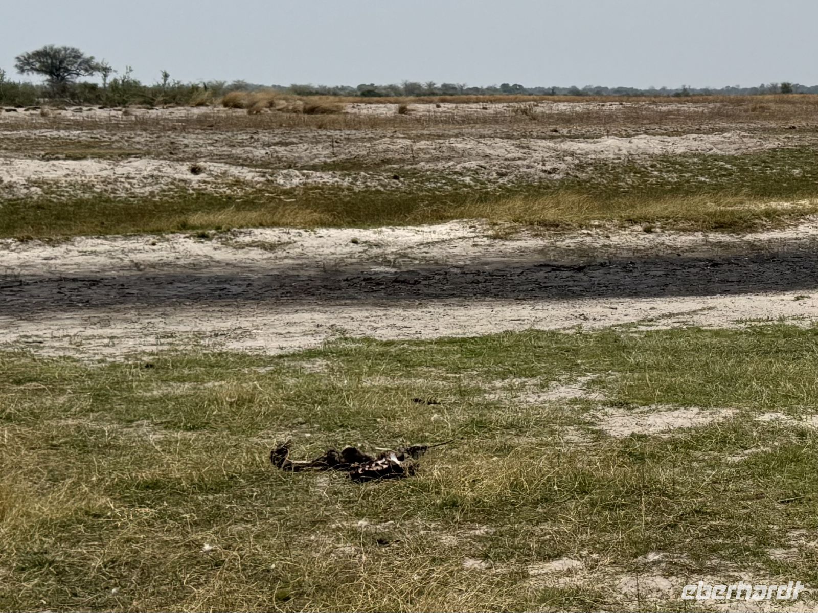 Für uns geht’s weiter und wir probieren Okondeka. Diesmal eine natürliche Wasserstelle. Weiter geht es an dem jetzt trockenen Salz- und Kalk - See.