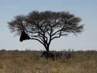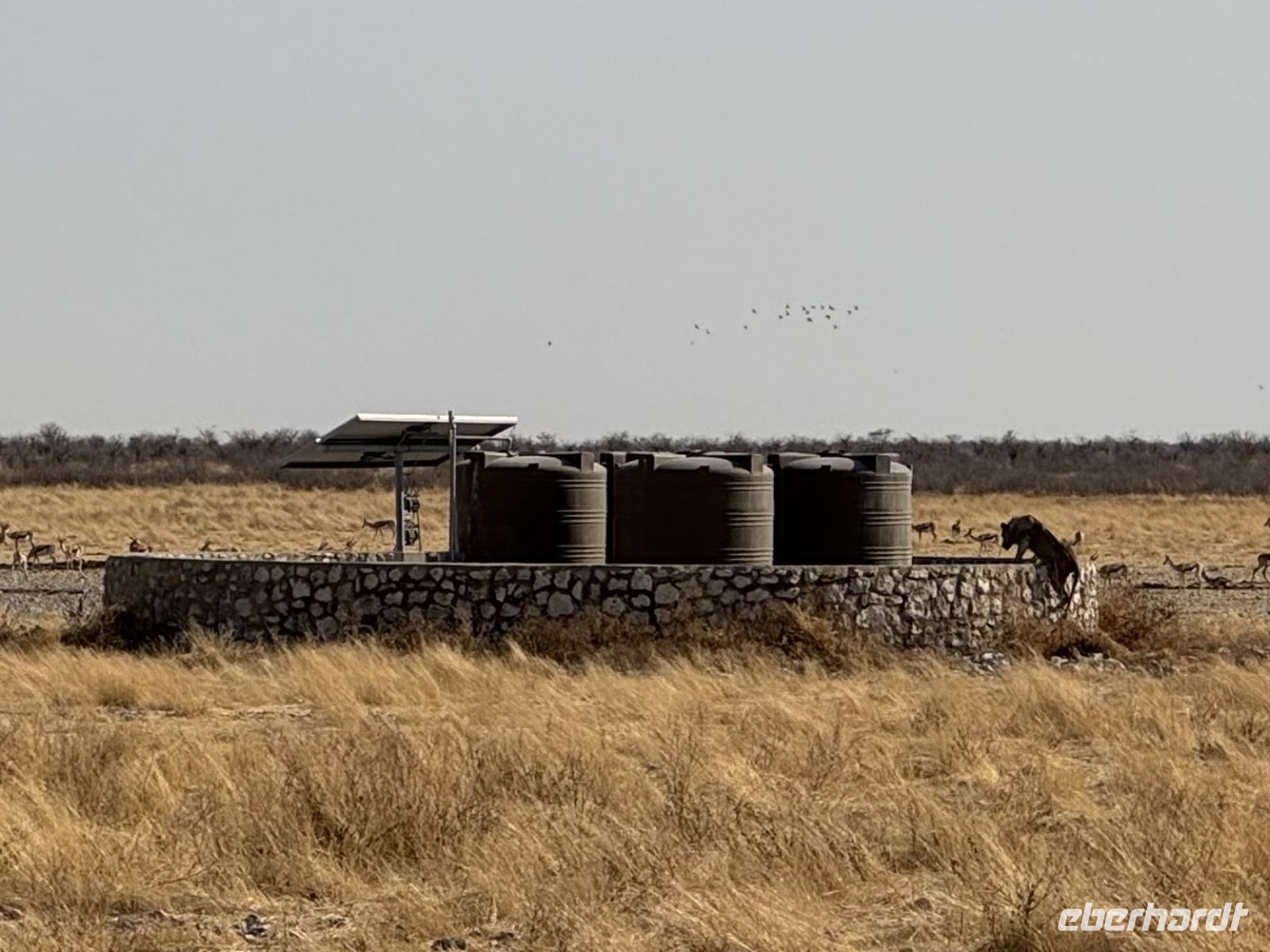 Vielleicht ist sein jüngerer Kumpane ja wieder bei den Wasserbehältern im Schattenversteck. Wir werden es nicht erfahren. Niemand lässt sich sonst blicken. Außer eine Herde Springböcke und Zebras, auf welche ja meistens Verlass ist.