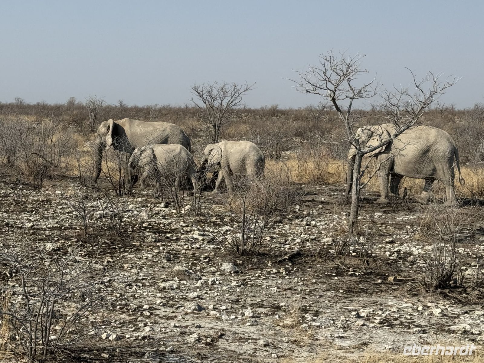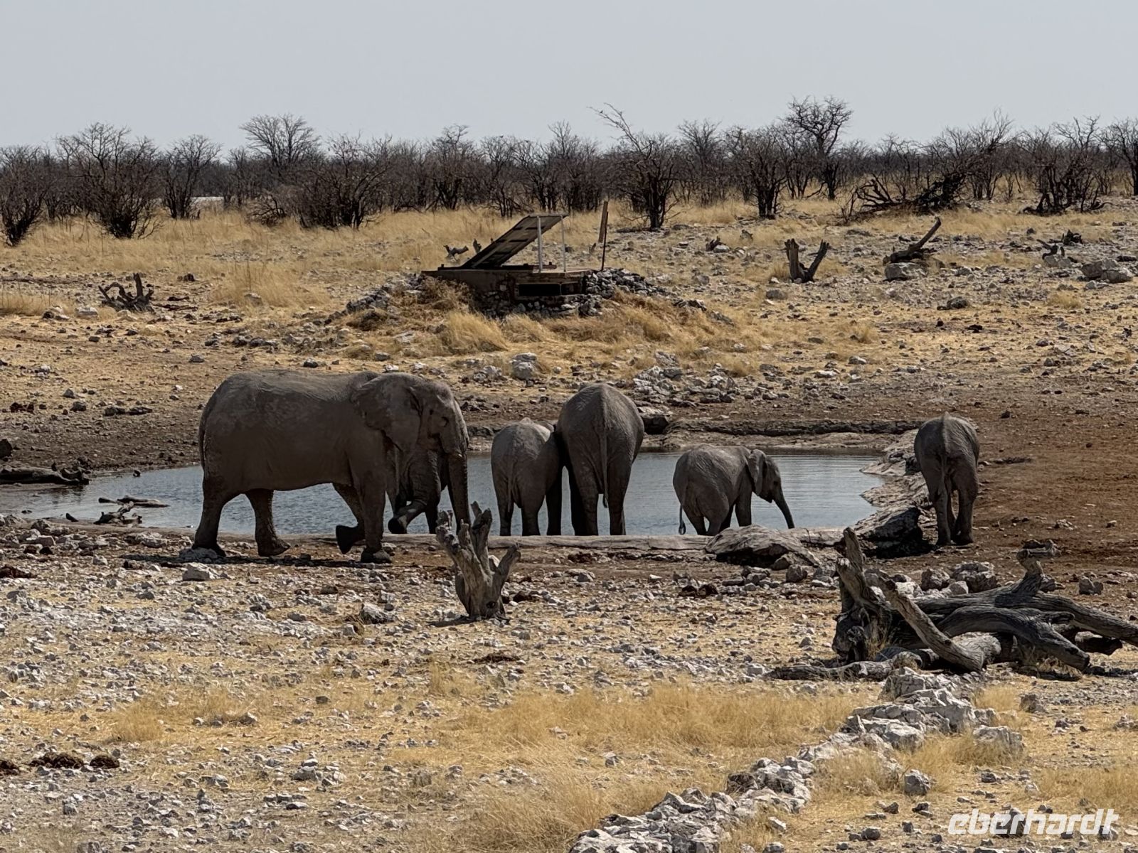Auf unserem Weg zum Mittagessen im Okaukuejo Camp, fahren wir nochmal in Olifantsbad vorbei und wir können unser Glück kaum fassen. Eine Elefantenherde von mindestens 50 Tieren verbringt hier seine Zeit. Große, Kleine, Junge, Alte, Mütter, Väter, Kinder, einfach alles.