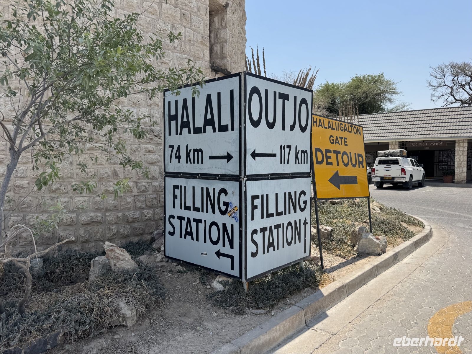 Noch kurz tanken, dann machen wir uns ein letztes Mal auf in Richtung Etosha Park, welchen wir mit 160 km nochmal durchqueren, bevor wir ihn nordöstlich verlassen werden.