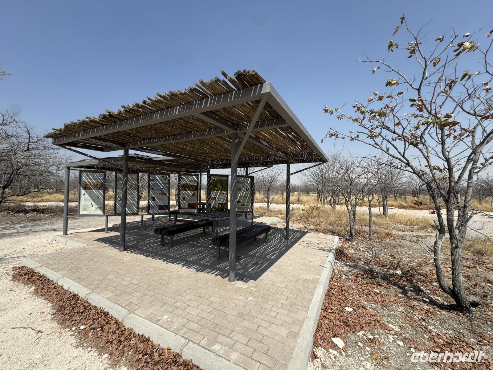 Unser erster Stopp wo wir das Fahrzeug verlassen ist Olifantsbad. Was für ein passender Name! Und ebenfalls eine Wasserstelle für die Tiere, aber auch mit einem abgeriegelten Gelände für uns, mit Bänken, ein paar Hochständen mit Sitzbänken zum besseren Beobachten und einigen Erklärungstafeln.