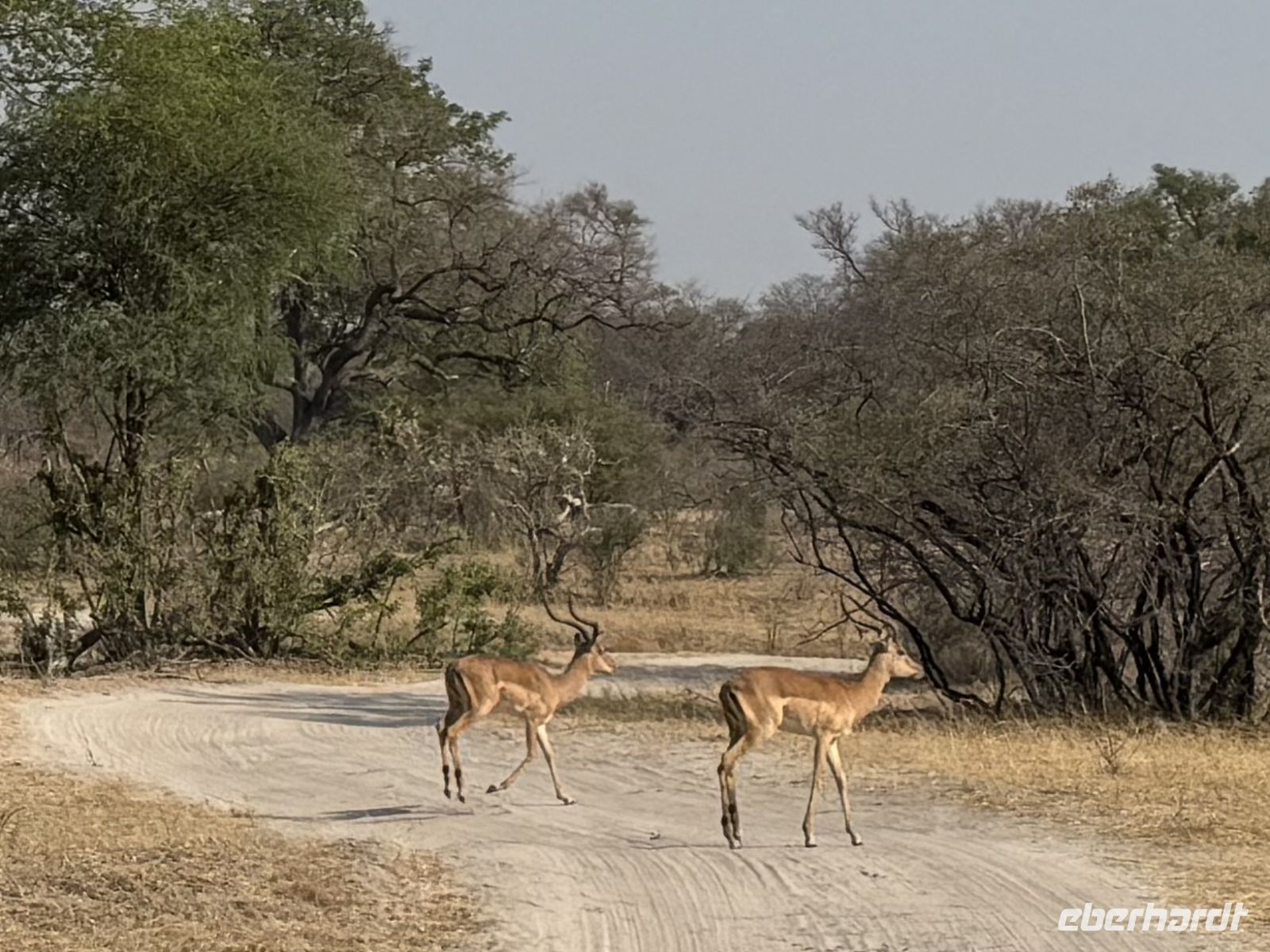 Aber weiter geht’s. Immer geradeaus und unsere Augen suchen immer leicht zusammengekniffen den Horizont nach Tieren ab. Der ein oder andere Springbock trollt sich ganz entspannt am Straßenrand.