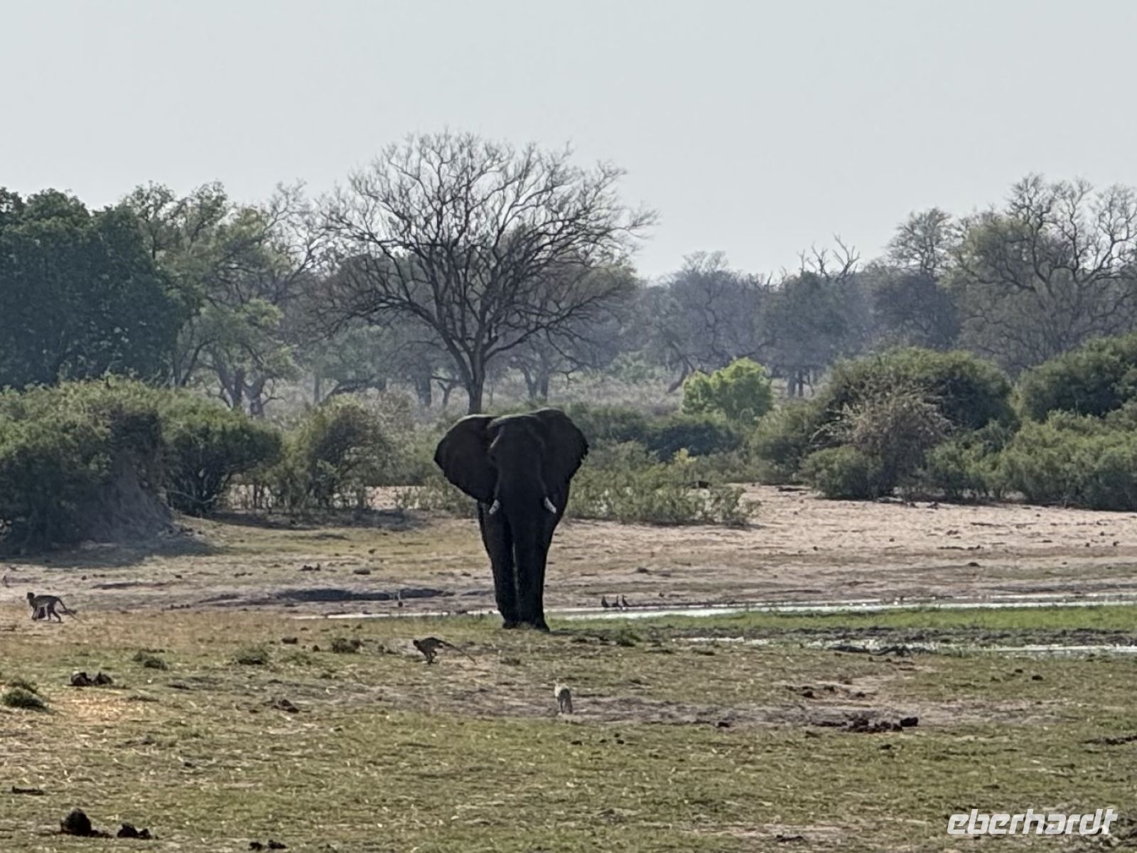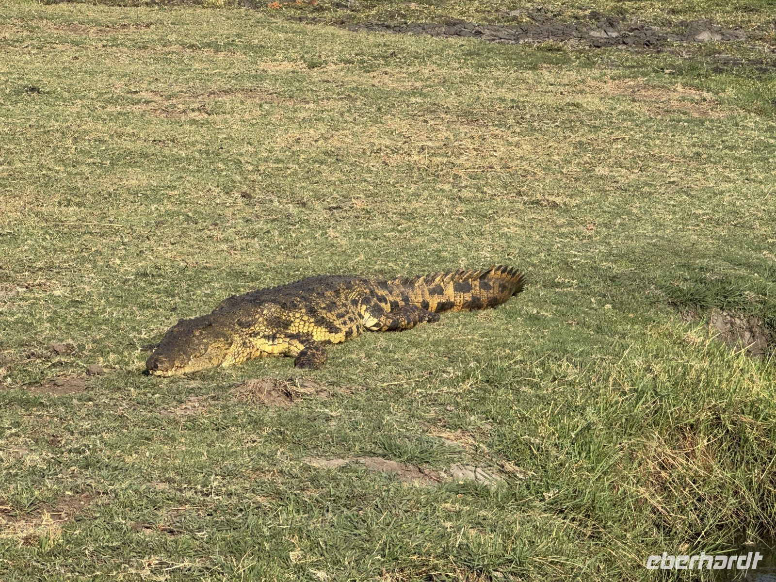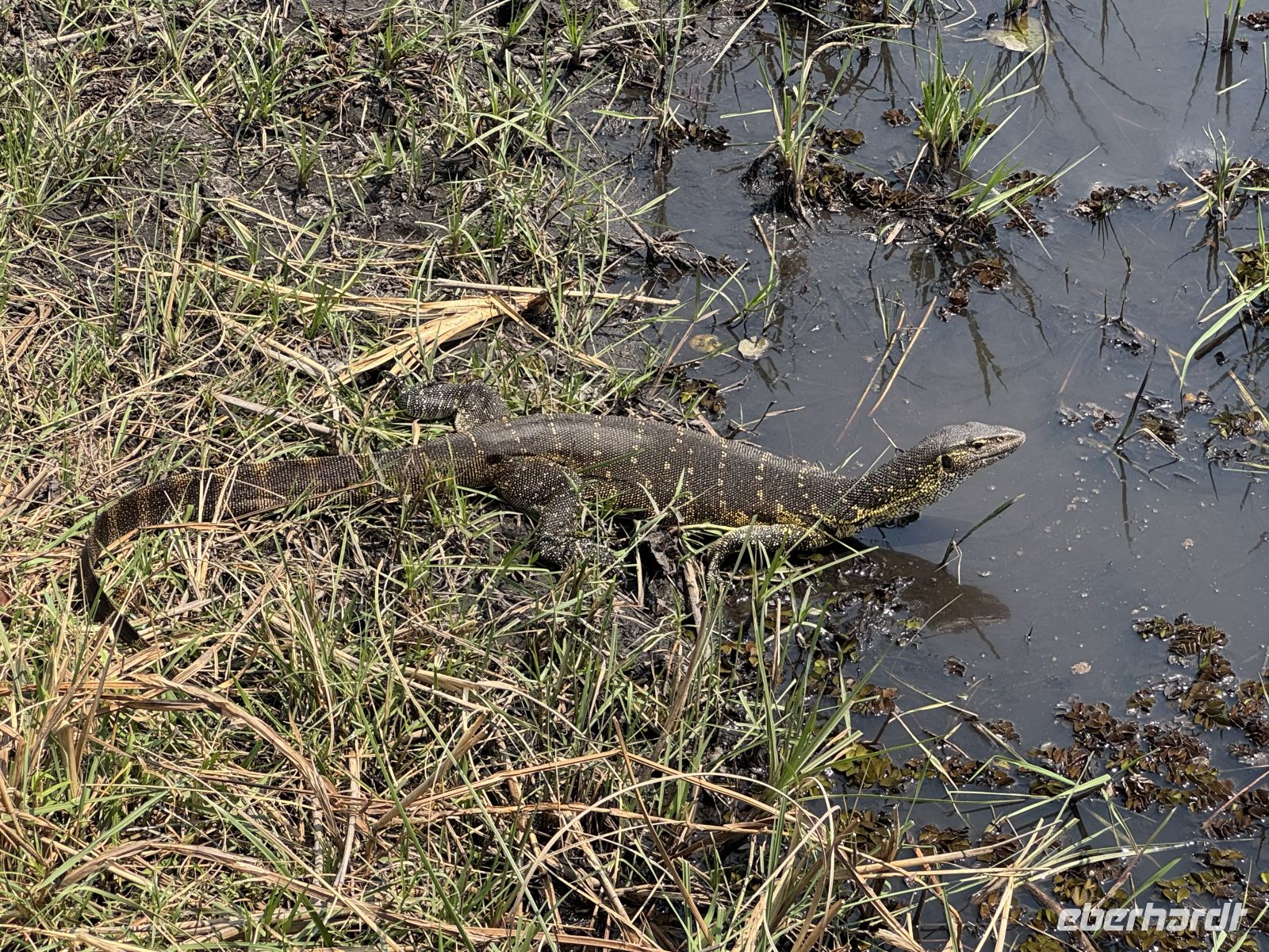 Wir beobachten wieder unsere alten Freunde die Hippos, grunzend und schubsend hängen Sie so vertraut im Wasser rum. Ein Wasserwaran liegt auf einer der Grasnarben entlang der Hippopfade rum. Immer wieder Krokodile und immer wieder Elefanten. Ein Elefant entschließt sich das seichte Gewässer zu durchqueren. Wir trauen unseren Augen nicht. Es braucht etwas Übung, bis er sich komplett ins Wasser gelassen hat. Dann läuft er zielgerichtet los. Im Auge immer das andere Ufer.