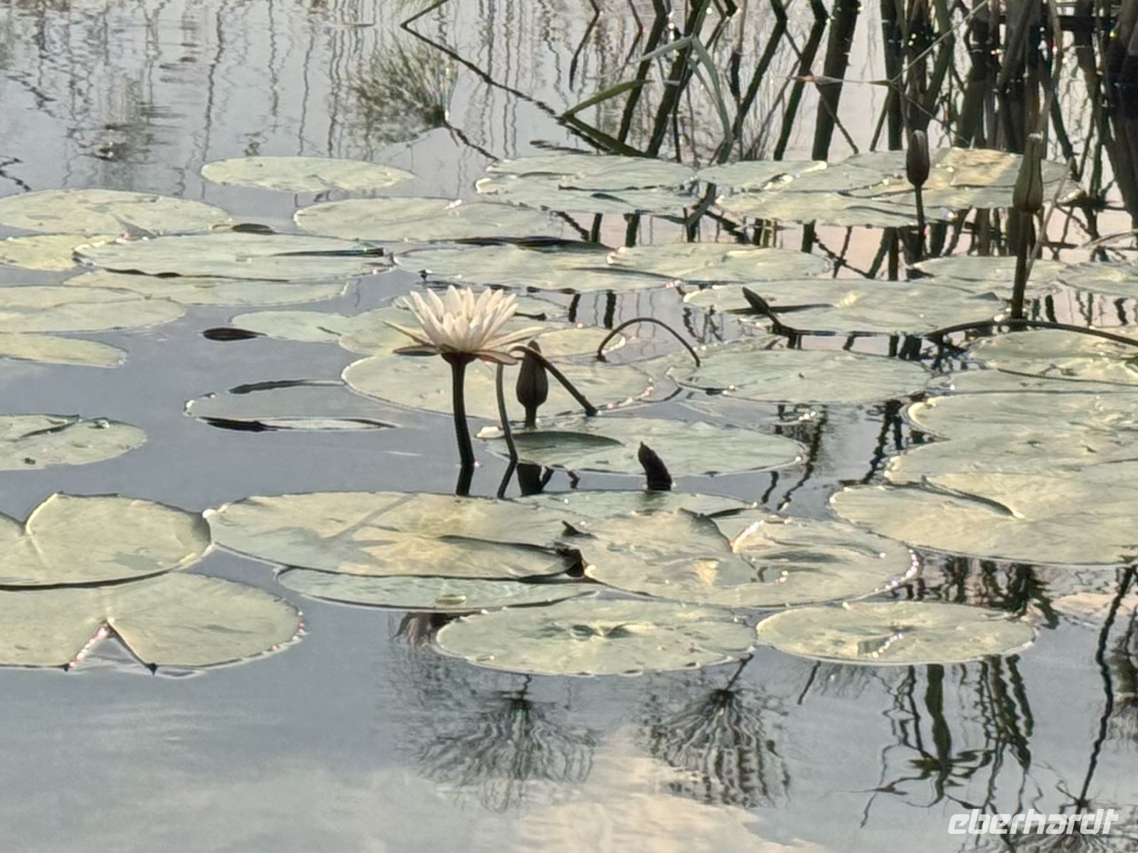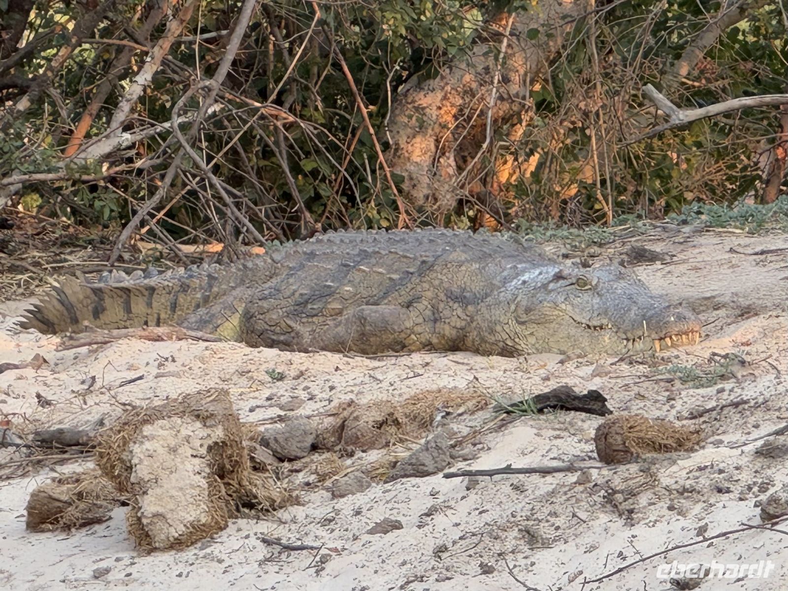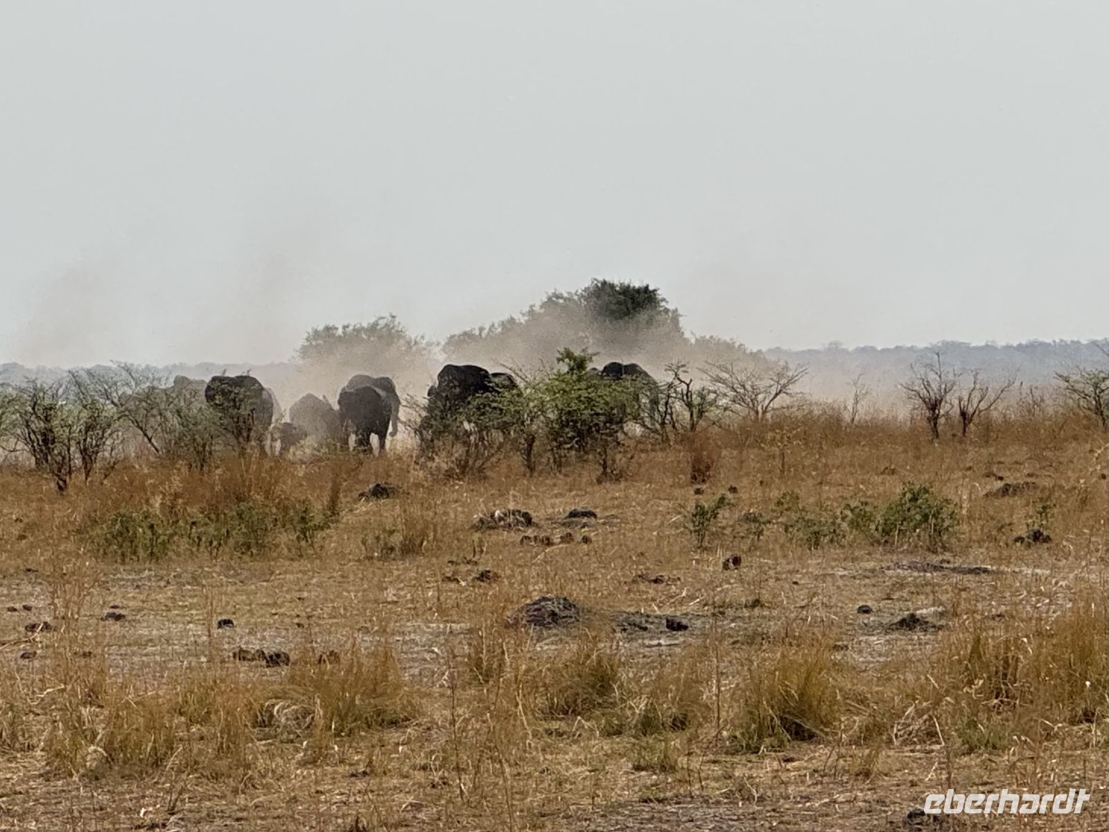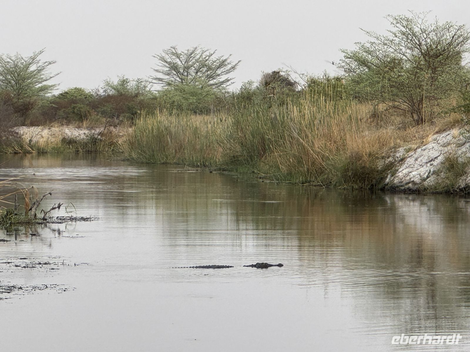 Wir beobachten wieder unsere alten Freunde die Hippos, grunzend und schubsend hängen Sie so vertraut im Wasser rum. Ein Wasserwaran liegt auf einer der Grasnarben entlang der Hippopfade rum. Immer wieder Krokodile und immer wieder Elefanten. Ein Elefant entschließt sich das seichte Gewässer zu durchqueren. Wir trauen unseren Augen nicht. Es braucht etwas Übung, bis er sich komplett ins Wasser gelassen hat. Dann läuft er zielgerichtet los. Im Auge immer das andere Ufer.