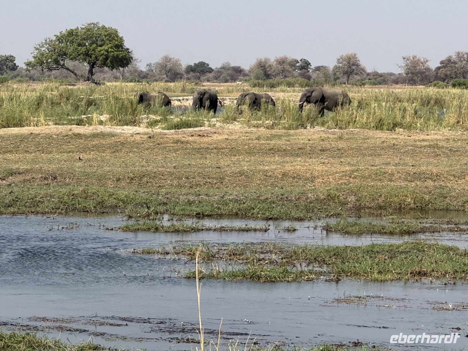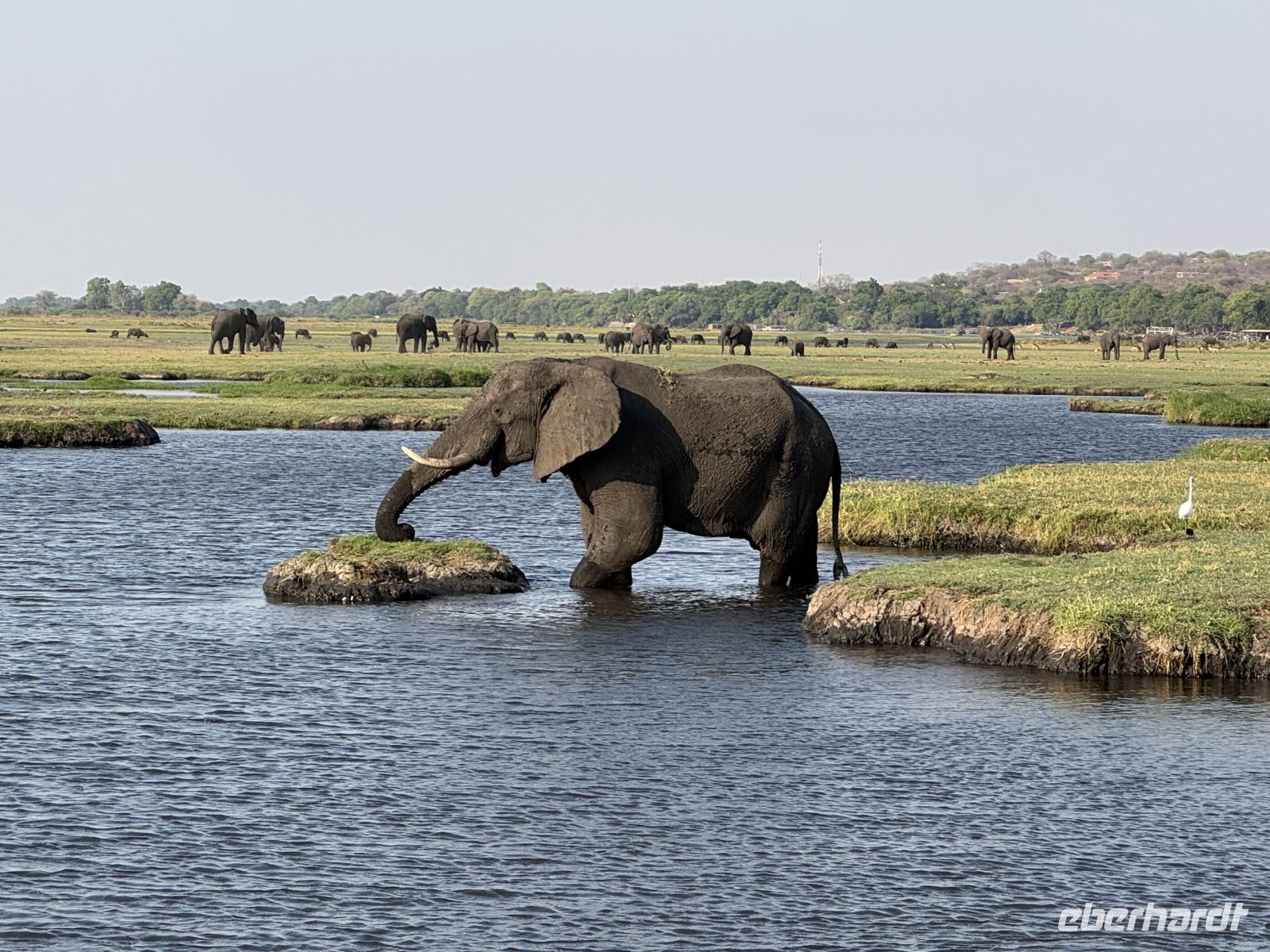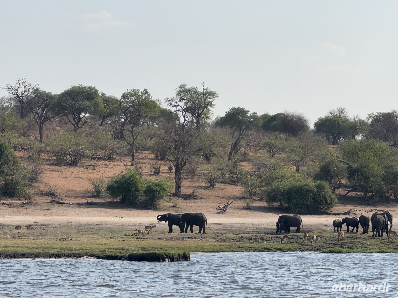 Unser Kreis wir größer, wir verlassen die Nebenarme und nehmen Kurs auf den Hauptstrom des Chobe. Jetzt befinden wir uns genau in der Mitte und befahren die Grenze. Links in 100 Metern Namibia, rechts von uns die Nebenarme gehörend zu Botswana. Wir fühlen uns wie im Garten Eden. Tiere über Tiere, ganz ruhig, auch wenn der Schein der friedlichen Nachbarschaft trügt. Manche leben ausgezeichnet nebeneinander, andere sollten sich einfach nicht in die Quere kommen.