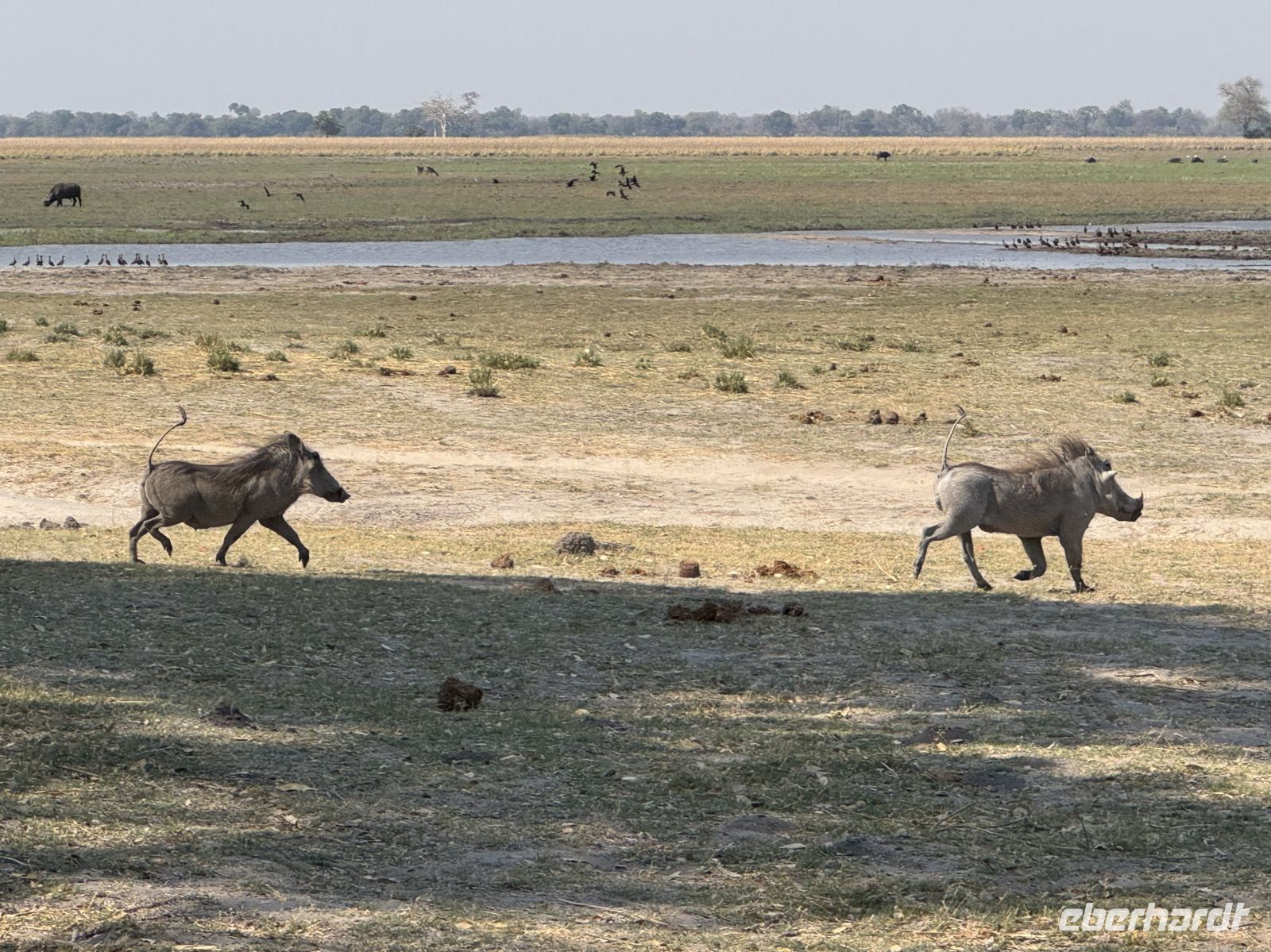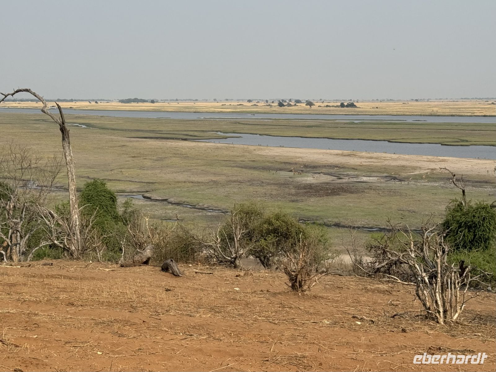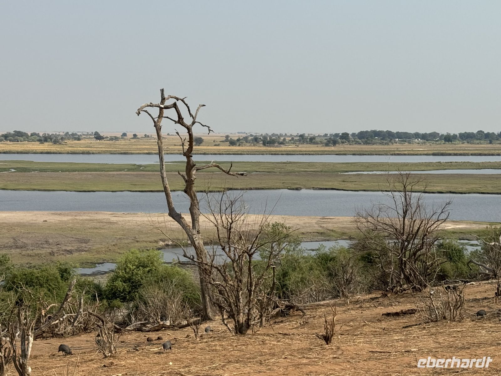Unser Kreis wir größer, wir verlassen die Nebenarme und nehmen Kurs auf den Hauptstrom des Chobe. Jetzt befinden wir uns genau in der Mitte und befahren die Grenze. Links in 100 Metern Namibia, rechts von uns die Nebenarme gehörend zu Botswana. Wir fühlen uns wie im Garten Eden. Tiere über Tiere, ganz ruhig, auch wenn der Schein der friedlichen Nachbarschaft trügt. Manche leben ausgezeichnet nebeneinander, andere sollten sich einfach nicht in die Quere kommen.