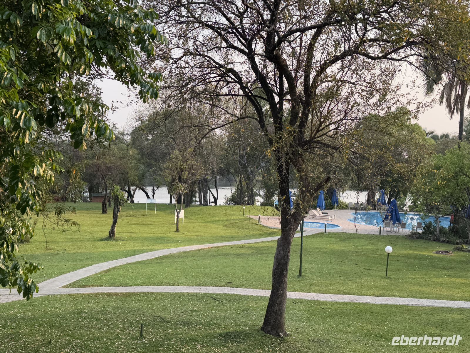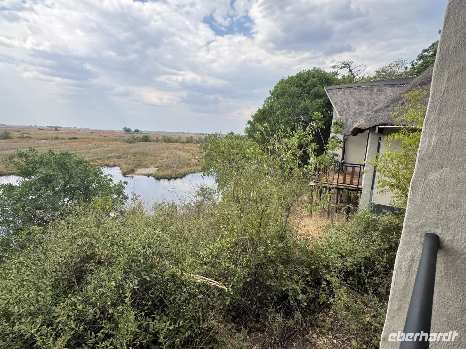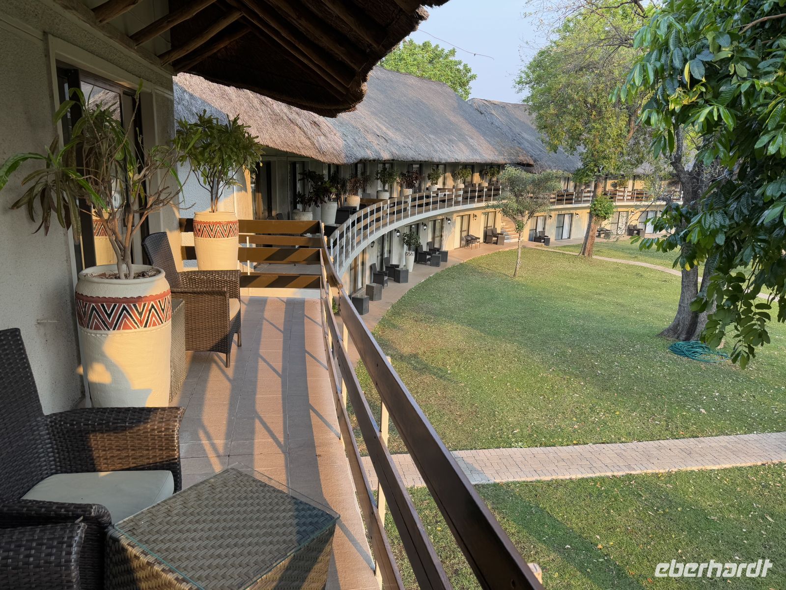 Dort wartet die A‘zambezi River Lodge auf uns. Der Name sagt bereits wo diese liegt, der Sambesi ist also für der Tür. Direkter Zugang für uns, alle Zimmer haben Riverview. Toll!