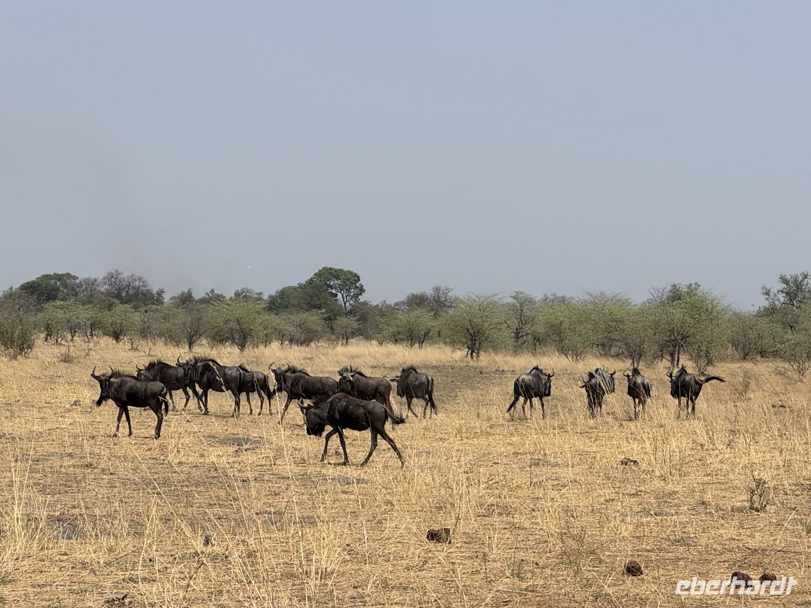 Also machen wir uns auf dem Rückweg und sehen doch tatsächlich eine Gruppe jüngerer Streifenknu Bullen. Sie überqueren völlig entspannt den Weg und wir sind begeistert.