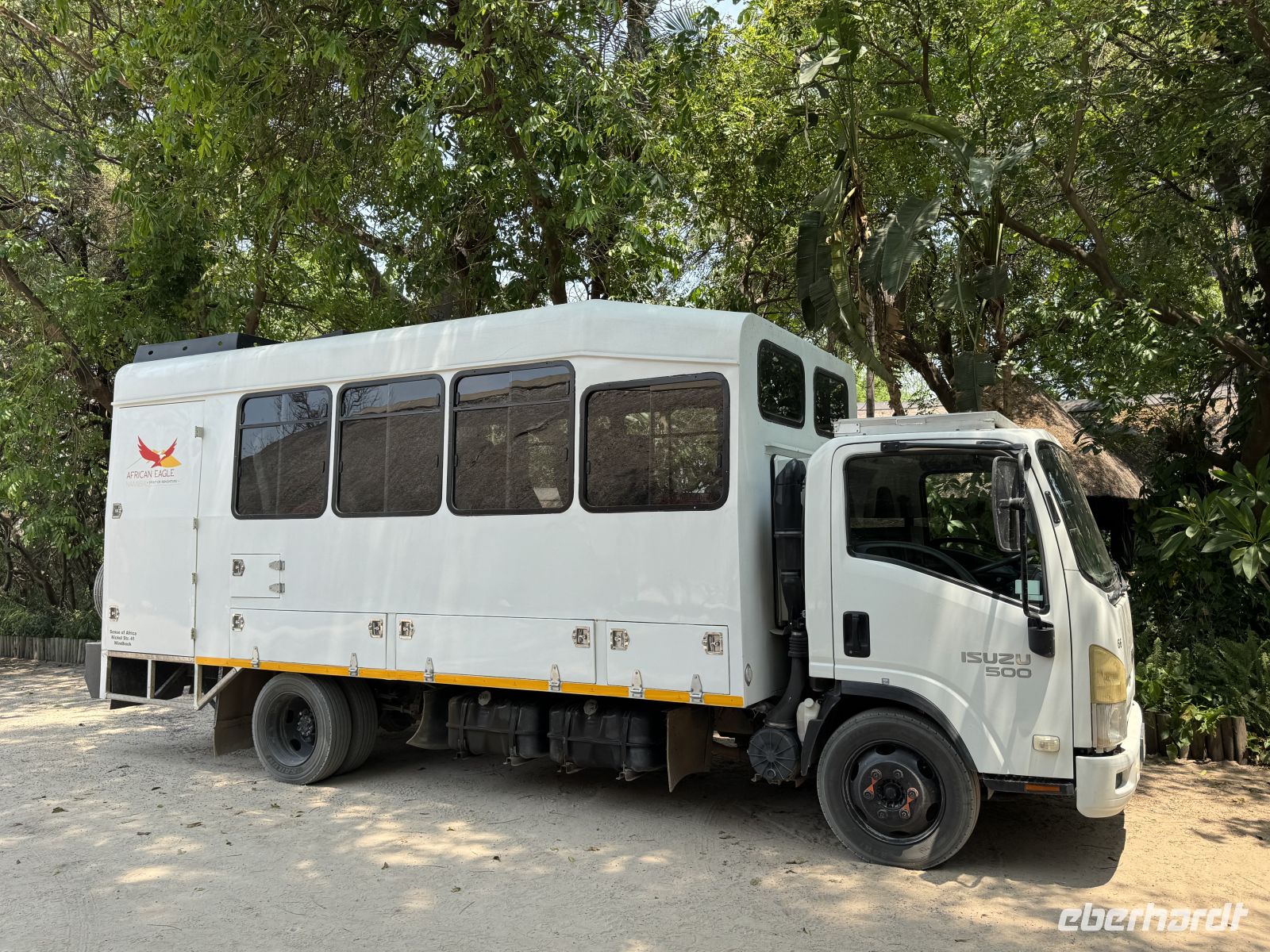 Aber gut. Jetzt geht es los auf unserer letzte Etappe. Rein in unseren Transferbus und los für die letzten 20 km auf der Straße. Wir witzeln und fragen unseren Transfer Guide ob er nicht vielleicht doch noch etwas für uns tun kann. Für unsere Fotosammlung, die irgendwo bei 1000 Bildern + liegt, fehlt ja immer noch ein Leopard. Und wie wir gelernt haben, ist hier nichts unmöglich.
