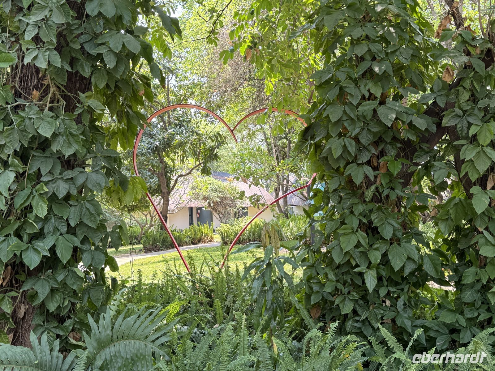 Wir fahren also rüber und bewegen uns Richtung Boot. Wir werden schon gefragt, ob der Transfer rückwärts tatschlich sein muss oder wir nicht einfach laufen könnten. Wir gucken uns an und sagen, ja klar, natürlich laufen wir. Der Hotelgarten grenzt an den Anleger.