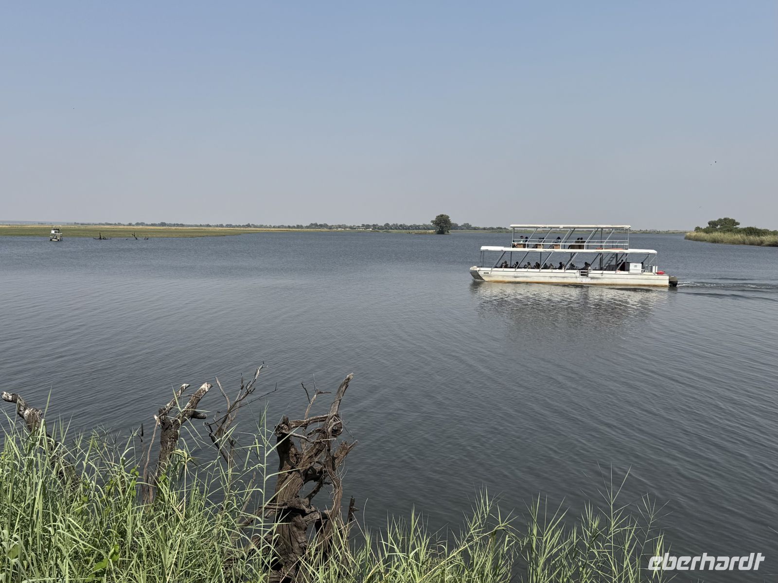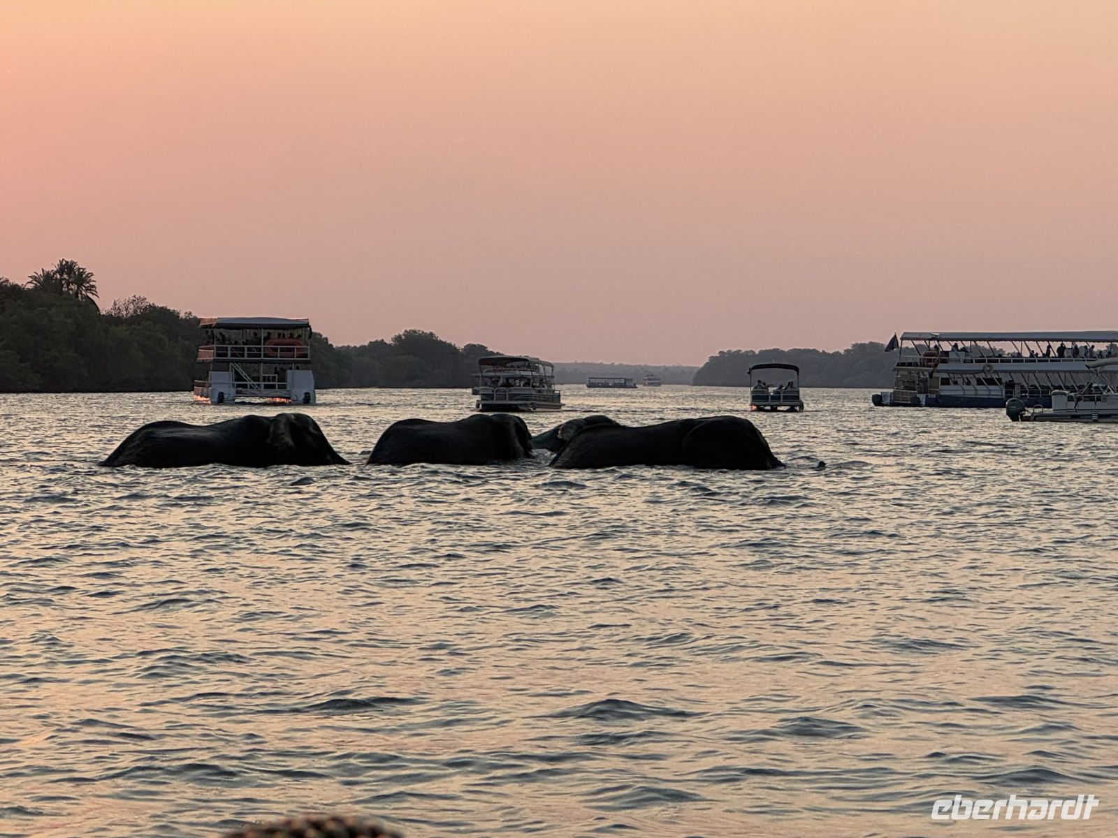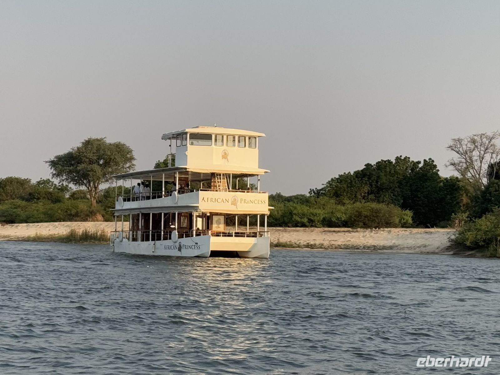 Unser Boot, kommerziell und das erste Mal sind wir nicht allein gebucht. Wir haben zwei Tische, der Rest ist ebenfalls belegt. Getränke und Häppchen inklusive, der Kapitän begrüßt uns, stellt seine Crew vor und schon geht’s los. Wir schippern entlang des Sambesi, einmal um die Insel Chundu, immer entlang der Grenze zwischen Sambia und Simbabwe. Hier ist der Fluss ziemlich befahren und so begegnen wir jeder Menge anderer Touristenboote. Große und kleine, einstöckig, zweistöckig.