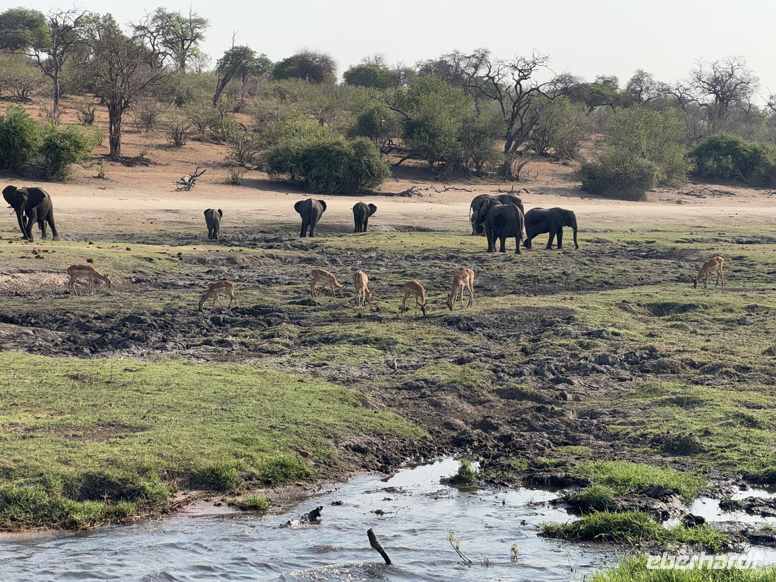 Am Ufer entdecken wir die ersten Elefanten, und Krokodile. Wir lassen unsere Augen in die Ferne schweifen und beobachten das Treiben am Wasser.
